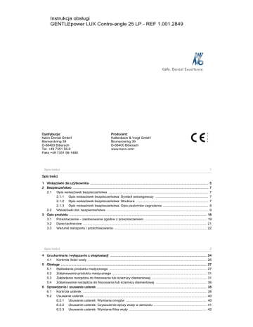 Instrukcja obsługi GENTLEpower LUX Contra-angle 25 LP - REF 1.001.2849 Dystrybucja: KaVo Dental GmbH Bismarckring 39 D-88400 Biberach Tel. +49 7351 56-0 Faks +49 7351 56-1488 Producent: Kaltenbach & Voigt GmbH Bismarckring 39 D-88400 Biberach www.kavo.com Spis treści 1 Spis treści 1 Wskazówki dla użytkownika ............................................................................................................................. 5 2 Bezpieczeństwo ............................................................................................................................................... 7 2.1 Opis wskazówek bezpieczeństwa .......................................................................................................... 7 2.1.1 Opis wskazówek bezpieczeństwa: Symbol ostrzegawczy ........................................................ 7 2.1.2 Opis wskazówek bezpieczeństwa: Struktura ............................................................................ 7 2.1.3 Opis wskazówek bezpieczeństwa: Opis poziomów zagrożenia ................................................ 8 2.2 Wskazówki dot. bezpieczeństwa ............................................................................................................ 9 3 Opis produktu ................................................................................................................................................. 18 3.1 Przeznaczenie – zastosowanie zgodne z przeznaczeniem ................................................................. 19 3.2 Dane techniczne ................................................................................................................................... 21 3.3 Warunki transportu i przechowywania .................................................................................................. 22 Spis treści 4 Uruchomienie i wyłączenie z eksploatacji ...................................................................................................... 4.1 Kontrola ilości wody .............................................................................................................................. 5 Obsługa .......................................................................................................................................................... 5.1 Nakładanie produktu medycznego ....................................................................................................... 5.2 Zdejmowanie produktu medycznego .................................................................................................... 5.3 Zakładanie narzędzia do frezowania lub ściernicy diamentowej .......................................................... 5.4 Zdejmowanie narzędzia do frezowania lub ściernicy diamentowej ...................................................... 6 Sprawdzenie i usuwanie usterek .................................................................................................................... 6.1 Kontrola usterek ................................................................................................................................... 6.2 Usuwanie usterek ................................................................................................................................. 6.2.1 Usuwanie usterek: Wymiana oringów ..................................................................................... 6.2.2 Usuwanie usterek: Czyszczenie dyszy wody w aerozolu ........................................................ 6.2.3 Usuwanie usterek: Wymiana filtra wody .................................................................................. 2 24 26 27 27 31 31 36 38 38 40 40 41 42 Spis treści 3 7 Metody przygotowywania według ISO 17664 ................................................................................................ 7.1 Przygotowanie na miejscu użycia ........................................................................................................ 7.2 Czyszczenie ......................................................................................................................................... 7.2.1 Czyszczenie: Ręczne czyszczenie zewnętrzne ...................................................................... 7.2.2 Czyszczenie: Maszynowe czyszczenie zewnętrzne ............................................................... 7.2.3 Czyszczenie: Ręczne czyszczenie od wewnątrz .................................................................... 7.2.4 Czyszczenie: Maszynowe czyszczenie od wewnątrz ............................................................. 7.3 Dezynfekcja .......................................................................................................................................... 7.3.1 Dezynfekcja: Ręczna dezynfekcja z zewnątrz ........................................................................ 7.3.2 Dezynfekcja: Ręczna dezynfekcja od wewnątrz ..................................................................... 7.3.3 Dezynfekcja: Maszynowa dezynfekcja wnętrza i strony zewnętrznej ..................................... 7.4 Suszenie ............................................................................................................................................... 7.5 Środki i systemy pielęgnacyjne - konserwacja ..................................................................................... 7.5.1 Środki i systemy pielęgnacyjne - konserwacja: Pielęgnacja przy użyciu KaVo Spray ............ Spis treści 44 44 45 45 46 47 49 51 52 53 54 55 56 58 4 7.5.2 7.5.3 Środki i systemy pielęgnacyjne - konserwacja: Pielęgnacja za pomocą KaVo SPRAYrotor ....60 Środki i systemy pielęgnacyjne - konserwacja: Pielęgnacja za pomocą KaVo QUAT‐ TROcare 2104/2104A ............................................................................................................. 61 7.5.4 Środki i systemy pielęgnacyjne - konserwacja: Pielę