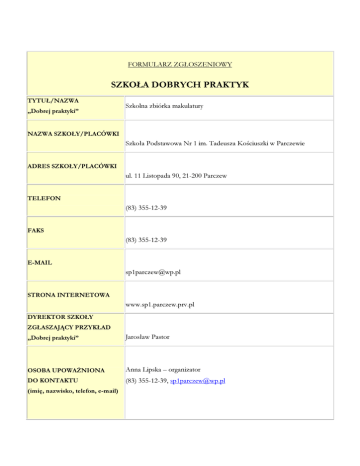 FORMULARZ ZGŁOSZENIOWY SZKOŁA DOBRYCH PRAKTYK TYTUŁ/NAZWA „Dobrej praktyki” Szkolna zbiórka makulatury NAZWA SZKOŁY/PLACÓWKI Szkoła Podstawowa Nr 1 im. Tadeusza Kościuszki w Parczewie ADRES SZKOŁY/PLACÓWKI ul. 11 Listopada 90, 21-200 Parczew TELEFON (83) 355-12-39 FAKS (83) 355-12-39 E-MAIL [email protected] STRONA INTERNETOWA www.sp1.parczew.prv.pl DYREKTOR SZKOŁY ZGŁASZAJĄCY PRZYKŁAD „Dobrej praktyki” Jarosław Pastor OSOBA UPOWAŻNIONA Anna Lipska – organizator DO KONTAKTU (83) 355-12-39, [email protected] (imię, nazwisko, telefon, e-mail) OPIS DOBREJ PRAKTYKI W 2002 roku niezwykle poważnym problemem naszego miasta stały się odpady ( brak miejsca na ich składowanie). Wydział Gospodarki Komunalnej i Ochrony Środowiska Urzędu Miejskiego w Parczewie wyszedł z inicjatywą segregacji śmieci. Problemem stał się jednak brak zaangażowania społeczeństwa w walkę z odpadami. Aby wspomóc dążenia UM, zadbać o swoje środowisko życia zaplanowaliśmy konkretne działania, poprzez które pragnęliśmy zwrócić uwagę mieszkańców gminy OPIS DOBREJ PRAKTYKI na konieczność ograniczenia ilości śmieci i dokonywania ich selekcji. Tak (opis przesłanek, problemów, narodził się w Szkole Podstawowej nr 1 w Parczewie pomysł potrzeb, które zainspirowały realizację projektu, a także krótka charakterystyka podjętego działania) SZKOLNEJ ZBIÓRKI MAKULATURY realizowanej w ramach własnego programu ekologicznego „ZIELONĄ ŚCIEŻKĄ”. Zbiórka ma charakter konkursowy, wyłaniani są zwycięzcy indywidualni i przydzielane są nagrody klasowe, które stanowią dofinansowanie wycieczek szkolnych. Za ogromny nasz sukces uważamy ogromne zaangażowanie w tę akcję – ilość zebranej makulatury rośnie sukcesywnie z roku na rok – w obecnej IX edycji ilość ta przekroczyła 32 tony. Makulaturę zbierają wszystkie klasy, rodzice, rodziny, nauczyciele, a okres zbiórki jest oczekiwanym wydarzeniem w naszej szkole, gdyż „rodzinne” przygotowania do niej trwają niemalże cały rok. Efektem wdrożenia programu jest podejmowanie aktywnych działań na rzecz środowiska lokalnego, rozwój zainteresowań ekologicznych ucznia, przyjęcie przez niego określonej wiedzy, przekonań i postaw, którymi będzie się posługiwał w życiu. Poprzez realizację programu w znacznym stopniu udało nam się zaktywizować nauczycieli, dzieci i ich rodziców REZULTATY/KORZYŚCI oraz członków społeczności lokalnej. Uwrażliwienie dzieci na potrzeby środowiska i konieczność jego ochrony oraz kształtowanie odpowiedzialności za jego stan poprzez praktyczne działania. Kontynuowanie idei oszczędnego gospodarowania zasobami przyrody i proekologicznego postępowania w środowisku. Zmniejszenie ilości śmieci na Miejskim Składowisku odpadów. PROBLEMY I PRZESZKODY Brak miejsca składowania makulatury na terenie szkoły W REALIZACJ Sformułowanie precyzyjnego regulaminu zbiórki RADY I WSKAZÓWKI Zorganizowanie miejsca składowania makulatury Okresowe odstawianie makulatury do Punktu Skupu INSTYTUCJE/ORGANIZACJE Urząd Miejski w Parczewie WSPÓŁPRACUJĄCE w realizacji Firma PARPAP w Parczewie – Punkt Skupu Makulatury działania ZAŁĄCZNIKI Artykuł z prasy lokalnej (dodatkowe materiały Zestawienie wyników zbiórki uzupełniające)
