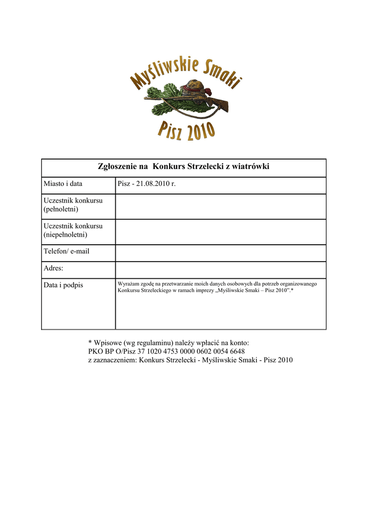 Zgłoszenie na Konkurs Strzelecki z wiatrówki Miasto i data Pisz - 21.08.2010 r. Uczestnik konkursu (pełnoletni) Uczestnik konkursu (niepełnoletni) Telefon/ e-mail Adres: Data i podpis Wyrażam zgodę na przetwarzanie moich danych osobowych dla potrzeb organizowanego Konkursu Strzeleckiego w ramach imprezy „Myśliwskie Smaki – Pisz 2010”.* * Wpisowe (wg regulaminu) należy wpłacić na konto: PKO BP O/Pisz 37 1020 4753 0000 0602 0054 6648 z zaznaczeniem: Konkurs Strzelecki - Myśliwskie Smaki - Pisz 2010