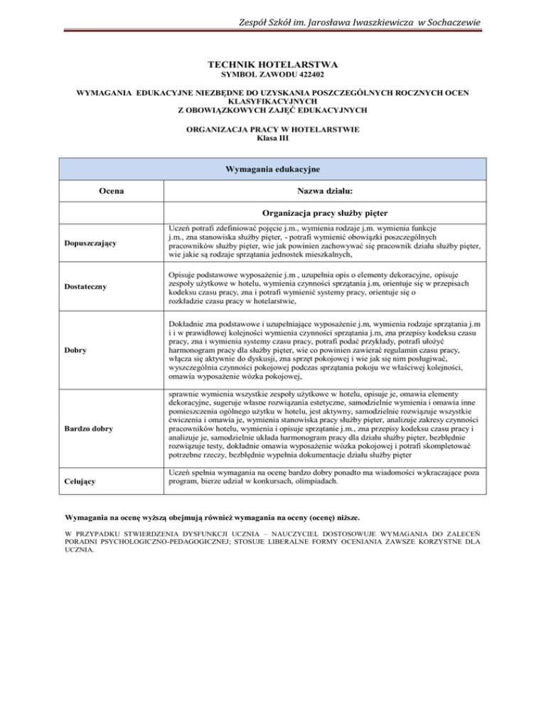 Zespół Szkół im Jarosława Iwaszkiewicza w Sochaczewie TECHNIK HOTELARSTWA SYMBOL ZAWODU 422402 WYMAGANIA EDUKACYJNE NIEZB DNE DO UZYSKANIA POSZCZEGÓLNYCH ROCZNYCH OCEN KLASYFIKACYJNYCH Z OBOWI ZKOWYCH ZAJ Ć EDUKACYJNYCH ORGANIZACJA PRACY W HOTELARSTWIE Klasa III Wymagania edukacyjne Ocena Nazwa działu: Organizacja pracy słu by pi ter Dopuszczaj cy Ucze potrafi zdefiniować poj cie j.m., wymienia rodzaje j.m. wymienia funkcje j.m., zna stanowiska słu by pi ter, - potrafi wymienić obowi zki poszczególnych pracowników słu by pi ter, wie jak powinien zachowywać si pracownik działu słu by pi ter, wie jakie s rodzaje sprz tania jednostek mieszkalnych, Dostateczny Opisuje podstawowe wyposa enie j.m , uzupełnia opis o elementy dekoracyjne, opisuje zespoły u ytkowe w hotelu, wymienia czynno ci sprz tania j.m, orientuje si w przepisach kodeksu czasu pracy, zna i potrafi wymienić systemy pracy, orientuje si o rozkładzie czasu pracy w hotelarstwie, Dobry Dokładnie zna podstawowe i uzupełniaj ce wyposa enie j.m, wymienia rodzaje sprz tania j.m i i w prawidłowej kolejno ci wymienia czynno ci sprz tania j.m, zna przepisy kodeksu czasu pracy, zna i wymienia systemy czasu pracy, potrafi podać przykłady, potrafi uło yć harmonogram pracy dla słu by pi ter, wie co powinien zawierać regulamin czasu pracy, wł cza si aktywnie do dyskusji, zna sprz t pokojowej i wie jak si nim posługiwać, wyszczególnia czynno ci pokojowej podczas sprz tania pokoju we wła ciwej kolejno ci, omawia wyposa enie wózka pokojowej, Bardzo dobry Celuj cy sprawnie wymienia wszystkie zespoły u ytkowe w hotelu, opisuje je, omawia elementy dekoracyjne, sugeruje własne rozwi zania estetyczne, samodzielnie wymienia i omawia inne pomieszczenia ogólnego u ytku w hotelu, jest aktywny, samodzielnie rozwi zuje wszystkie ćwiczenia i omawia je, wymienia stanowiska pracy słu by pi ter, analizuje zakresy czynno ci pracowników hotelu, wymienia i opisuje sprz tanie j.m., zna przepisy kodeksu czasu pracy i analizuje je, samodzielnie układa harmonogram pracy dla działu słu by pi ter, bezbł dnie rozwi zuje testy, dokładnie omawia wyposa enie wózka pokojowej i potrafi skompletować potrzebne rzeczy, bezbł dnie wypełnia dokumentacje działu słu by pi ter Ucze spełnia wymagania na ocen bardzo dobry ponadto ma wiadomo ci wykraczaj ce poza program, bierze udział w konkursach, olimpiadach. Wymagania na ocen wy sz obejmuj równie wymagania na oceny (ocen ) ni sze. W PRZYPADKU STWIERDZENIA DYSFUNKCJI UCZNIA – NAUCZYCIEL DOSTOSOWUJE WYMAGANIA DO ZALECE PORADNI PSYCHOLOGICZNO-PEDAGOGICZNEJ; STOSUJE LIBERALNE FORMY OCENIANIA ZAWSZE KORZYSTNE DLA UCZNIA. Zespół Szkół im Jarosława Iwaszkiewicza w Sochaczewie