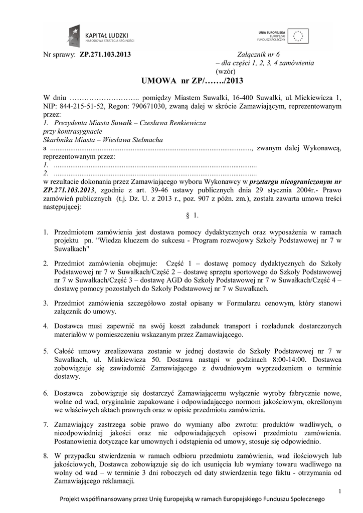 Nr sprawy: ZP.271.103.2013 Załącznik nr 6 – dla części 1, 2, 3, 4 zamówienia (wzór) UMOWA nr ZP/……./2013 W dniu ……………………….. pomiędzy Miastem Suwałki, 16-400 Suwałki, ul. Mickiewicza 1, NIP: 844-215-51-52, Regon: 790671030, zwaną dalej w skrócie Zamawiającym, reprezentowanym przez: 1. Prezydenta Miasta Suwałk – Czesława Renkiewicza przy kontrasygnacie Skarbnika Miasta – Wiesława Stelmacha a .............................................................................................................., zwanym dalej Wykonawcą, reprezentowanym przez: 1. ............................................................................................................... 2. ............................................................................................................... w rezultacie dokonania przez Zamawiającego wyboru Wykonawcy w przetargu nieograniczonym nr ZP.271.103.2013, zgodnie z art. 39-46 ustawy publicznych dnia 29 stycznia 2004r.- Prawo zamówień publicznych (t.j. Dz. U. z 2013 r., poz. 907 z późn. zm.), została zawarta umowa treści następującej: § 1. 1. Przedmiotem zamówienia jest dostawa pomocy dydaktycznych oraz wyposażenia w ramach projektu pn. "Wiedza kluczem do sukcesu - Program rozwojowy Szkoły Podstawowej nr 7 w Suwałkach" 2. Przedmiot zamówienia obejmuje: Część 1 – dostawę pomocy dydaktycznych do Szkoły Podstawowej nr 7 w Suwałkach/Część 2 – dostawę sprzętu sportowego do Szkoły Podstawowej nr 7 w Suwałkach/Część 3 – dostawę AGD do Szkoły Podstawowej nr 7 w Suwałkach/Część 4 – dostawę pomocy pozostałych do Szkoły Podstawowej nr 7 w Suwałkach. 3. Przedmiot zamówienia szczegółowo został opisany w Formularzu cenowym, który stanowi załącznik do umowy. 4. Dostawca musi zapewnić na swój koszt załadunek transport i rozładunek dostarczonych materiałów w pomieszczeniu wskazanym przez Zamawiającego. 5. Całość umowy zrealizowana zostanie w jednej dostawie do Szkoły Podstawowej nr 7 w Suwałkach, ul. Minkiewicza 50. Dostawa nastąpi w godzinach 8:00-14:00. Dostawca zobowiązuje się zawiadomić Zamawiającego z dwudniowym wyprzedzeniem o terminie dostawy. 6. Dostawca zobowiązuje się dostarczyć Zamawiającemu wyłącznie wyroby fabrycznie nowe, wolne od wad, oryginalnie zapakowane i odpowiadającego normom jakościowym, określonym we właściwych aktach prawnych oraz w opisie przedmiotu zamówienia. 7. Zamawiający zastrzega sobie prawo do wymiany albo zwrotu: produktów wadliwych, o nieodpowiedniej jakości oraz nie odpowiadających opisowi przedmiotu zamówienia. Postanowienia dotyczące kar umownych i odstąpienia od umowy, stosuje się odpowiednio. 8. W przypadku stwierdzenia w ramach odbioru przedmiotu zamówienia, wad ilościowych lub jakościowych, Dostawca zobowiązuje się do ich usunięcia lub wymiany towaru wadliwego na wolny od wad – w terminie 3 dni roboczych od daty stwierdzenia tego faktu - otrzymania od Zamawiającego reklamacji. 1 Projekt współfinansowany przez Unię Europejską w ramach Europejskiego Funduszu Społecznego 9. Wszystkie licencje zakupione w przedmiotowy przetargu mają być wystawione na Szkołę Podstawową nr 7 w Suwałkach. 10. Dostawca udziela 1 roku gwarancji na dostarczone pomoce. 11. Projekt jest dofinansowany z Programu Operacyjnego Kapitał Ludzki, Priorytet IX. Rozwój wykształcenia i kompetencji w regionach Działanie 9.1. Wyrównanie szans edukacyjnych i zapewnienie wysokiej jakości usług edukacyjnych świadczonych w systemie oświaty, współfinansowanego ze środków Unii Europejskiej w ramach Europejskiego Funduszu Społecznego. § 2. Dostawca zobowiązuje się dostarczyć przedmiot umowy pod wskazany przez Zamawiającego adres w terminie 14 dni od podpisania umowy. § 3. 1. Wynagrodzenie Dostawcy wyniesie: kwota netto ……………. zł, plus VAT.......% tj. kwota ..............zł, kwota brutto ..................zł, słownie złotych .................................................................................................... 2. Powyższa cena musi gwarantować pełne wykonanie zakresu rzeczowego zamówienia i obejmować m.in. koszty ubezpieczenia, cła, dostawy, rozładunku, opakowania itp. 3. Wynagrodzenie wypłacone będzie po odbiorze przedmiotu umowy (protokół zdawczo – odbiorczy) na podstawie faktury. 4. Należność za dostawę Zamawiający zobowiązany jest uregulować w terminie 30 dni od daty doręczenia faktury VAT. Płatność w formie przelewu na konto bankowe Dostawcy. 5. Protokół zdawczo-odbiorczy powinien zawierać opis pozycji asortymentowej z podaniem numeru seryjnego dla dostarczonego przedmiotu zamówienia lub innej formy umożliwiającej jego szczegółową identyfikację oraz z przytoczeniem liczby sztuk, ceny jednostkowej i wartości. §4 W razie zaistnienia istotnej zmiany okoliczności powodującej, że wykonanie umowy nie leży w interesie publicznym, czego nie można było przewidzieć w chwili zawarcia umowy, Zamawiający może odstąpić od umowy w terminie 14 dni od powzięcia wiadomości o tych okolicznościach. W takim wypadku Dostawca może żądać jedynie wynagrodzenia należnego mu z tytułu wykonania części umowy. §5 1. Strony ustalają odpowiedzialność z tytułu nie wykonania lub nienależytego wykonania umowy na zasadzie kar umownych. 2. Kary umowne naliczone będą w następujących przypadkach i wysokościach: 1) Dostawca zapłaci Zamawiającemu kary umowne za: a) odstąpienie od umowy z przyczyn, za które odpowiada Dostawca w wysokości 10 % wynagrodzenia brutto, o którym mowa w § 3 ust. 1 umowy, b) opóźnienie w realizacji przedmiotu zamówienia w wysokości 0,5 % kwoty umowy brutto za każdy dzień opóźnienia. Kara zostanie potrącona z faktury za opóźnioną dostawę. c) opóźnienie w usunięciu wad lub wymianie towaru wadliwego na wolny od wad w wysokości 0,5% wynagrodzenia brutto, określonego w § 3 ust. 1 za każdy dzień opóźnienia, 2