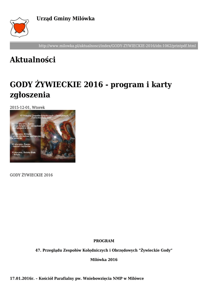 Urząd Gminy Milówka http://www.milowka.pl/aktualnosci/index/GODY-ZYWIECKIE-2016/idn:1062/printpdf.html Aktualności GODY ŻYWIECKIE 2016 - program i karty zgłoszenia 2015-12-01, Wtorek GODY ŻYWIECKIE 2016 PROGRAM 47. Przeglądu Zespołów Kolędniczych i Obrzędowych "Żywieckie Gody” Milówka 2016 17.01.2016r. – Kościół Parafialny pw. Wniebowzięcia NMP w Milówce godz.18.00 – koncert kolęd w wykonaniu Zespołu Pieśni i Tańca „Wierchy” im. J. Szczotki Milówki z 23.01.2016r. (sobota) – DZIEŃ PLENEROWY „ŻYWIECKICH GODÓW” w Milówce godz. 8.30 – spotkanie grup obrzędowych (Rynek Milówka) godz. 9.00 – konkurs trzaskania z bata godz. 10.30- korowód grup obrzędowych godz. 11.00–15.00 – konkurs kolędowania dziadów noworocznych („Stara Chałupa”) 24.01.2016r. (niedziela) – Kościół Parafialny pw. Wniebowzięcia NMP w Milówce godz.18.00 – Świąteczno-karnawałowy koncert w wykonaniu Młodzieżowej Orkiestry Dętej z Milówki 28.01.2016r. (czwartek) – „Stara Chałupa” w Milówce godz. 15.00 – skubanie pierza, przędzenie wełny, łuskanie fasoli z udziałem kolędników („Stara Chałupa”) 30.01.2016r. (sobota) – Dom Strażaka w Milówce godz. 19.00 - „Potańcówka dziadowska” – wystąpią kolędnicy, zespoły, kapele – bilety 15 zł od osoby 31.01.2016r. (niedziela)- Dom Strażaka w Milówce i kościół parafialny pw. Wniebowzięcia NMP w Milówce godz. 14.00 – „Gościna” – potrawy regionalne – muzyka góralska, kolędnicy,(Dom Strażaka)- bilety 15 zł od osoby godz. 18.00 – koncert kolęd i pastorałek w wykonaniu Chóru Milowieckiego (Kościół parafialny) 06.02.2016r. – Amfiteatr w Milówce Godz.11.00 - zawody furmanów, zimowe konkurencje, zabawy, prezentacje dziadów noworocznych, szlachciców i grup kolędniczych 16.02.2016r. – (wtorek) „Stara Chałupa w Milówce godz. 16.00 – Wieczór wspomnień o życiu i twórczości Józefa Szczotki Imprezy towarzyszące: 22.01.2016r. – godz.18.00 – koncert charytatywny na rzecz Joanny Śleziak – Hotel „TYCJAN” Wstęp: Wolne datki Zimowa Szkoła Folkloru – otwarte zajęcia w dniach 16,18,25 luty 2016r. - godz.10.00 (GOK w Milówce) Nazwa pliku Data Rozmiar Pobierz publikacji Kategoria: Powiązane pliki [ 2 ] GODY ŻYWIECKIE 2016- PLENER.rtf GODY ŻYWIECKIE 2016-IZBA. regulamin (1).rtf wszystkie aktualności 15-12-01 15:29 15-12-01 15:29 47.48KB 38.95KB pobierz pobierz
