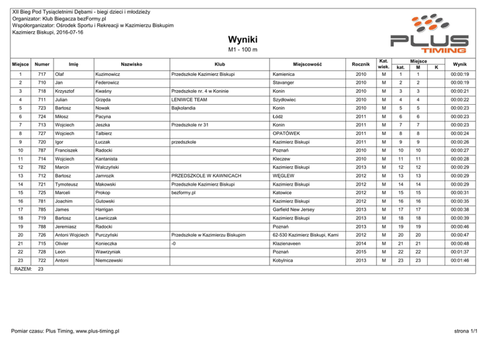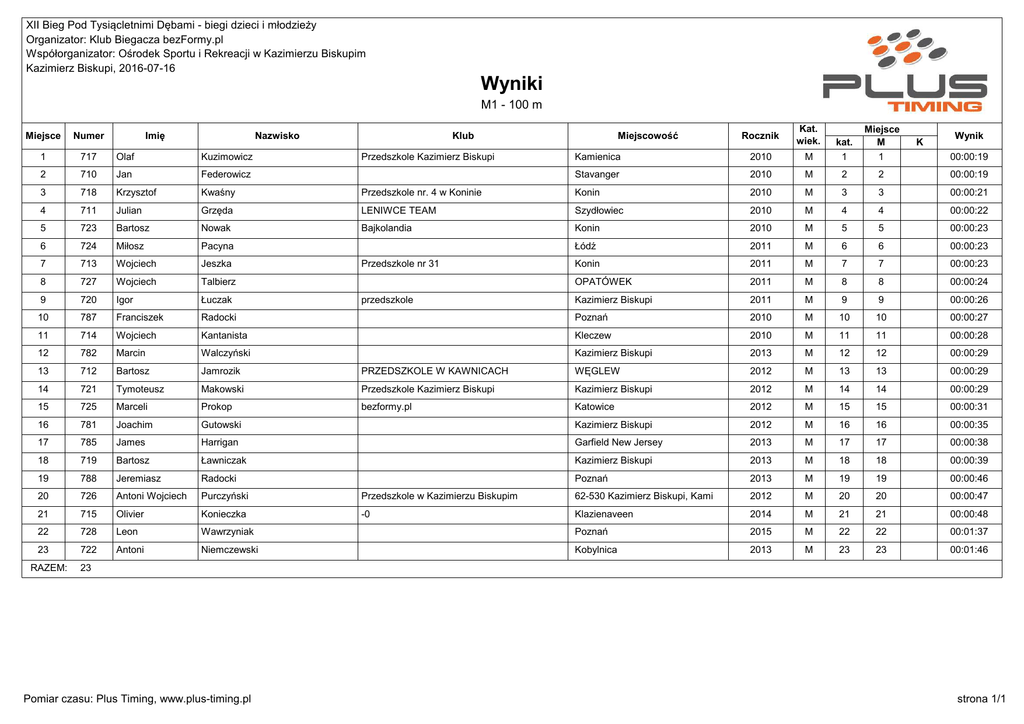 XII Bieg Pod Tysiącletnimi Dębami - biegi dzieci i młodzieży Organizator: Klub Biegacza bezFormy.pl Współorganizator: Ośrodek Sportu i Rekreacji w Kazimierzu Biskupim Kazimierz Biskupi, 2016-07-16 Wyniki M1 - 100 m Imię Rocznik Kat. wiek. Kamienica 2010 Stavanger Przedszkole nr. 4 w Koninie LENIWCE TEAM Miejsce Numer Nazwisko 1 717 Olaf Kuzimowicz 2 710 Jan Federowicz 3 718 Krzysztof Kwaśny 4 711 Julian Grzęda 5 723 Bartosz Nowak Bajkolandia 6 724 Miłosz Pacyna 7 713 Wojciech Jeszka 8 727 Wojciech Talbierz M kat. 1 Miejsce M 1 2010 M 2 2 00:00:19 Konin 2010 M 3 3 00:00:21 Szydłowiec 2010 M 4 4 00:00:22 Konin 2010 M 5 5 00:00:23 Łódź 2011 M 6 6 00:00:23 Konin 2011 M 7 7 00:00:23 OPATÓWEK 2011 M 8 8 00:00:24 Klub Przedszkole Kazimierz Biskupi Przedszkole nr 31 K Wynik 00:00:19 9 720 Igor Łuczak Kazimierz Biskupi 2011 M 9 9 00:00:26 10 787 Franciszek Radocki Poznań 2010 M 10 10 00:00:27 11 714 Wojciech Kantanista Kleczew 2010 M 11 11 00:00:28 12 782 Marcin Walczyński Kazimierz Biskupi 2013 M 12 12 00:00:29 13 712 Bartosz Jamrozik PRZEDSZKOLE W KAWNICACH WĘGLEW 2012 M 13 13 00:00:29 14 721 Tymoteusz Makowski Przedszkole Kazimierz Biskupi Kazimierz Biskupi 2012 M 14 14 00:00:29 15 725 Marceli Prokop bezformy.pl Katowice 2012 M 15 15 00:00:31 16 781 Joachim Gutowski Kazimierz Biskupi 2012 M 16 16 00:00:35 17 785 James Harrigan Garfield New Jersey 2013 M 17 17 00:00:38 18 719 Bartosz Ławniczak Kazimierz Biskupi 2013 M 18 18 00:00:39 19 788 Jeremiasz Radocki Poznań 2013 M 19 19 00:00:46 20 726 Antoni Wojciech Purczyński Przedszkole w Kazimierzu Biskupim 62-530 Kazimierz Biskupi, Kami 2012 M 20 20 00:00:47 21 715 Olivier Konieczka -0 Klazienaveen 2014 M 21 21 00:00:48 22 728 Leon Wawrzyniak Poznań 2015 M 22 22 00:01:37 23 722 Antoni Niemczewski Kobylnica 2013 M 23 23 00:01:46 RAZEM: przedszkole Miejscowość 23 Pomiar czasu: Plus Timing, www.plus-timing.pl strona 1/1