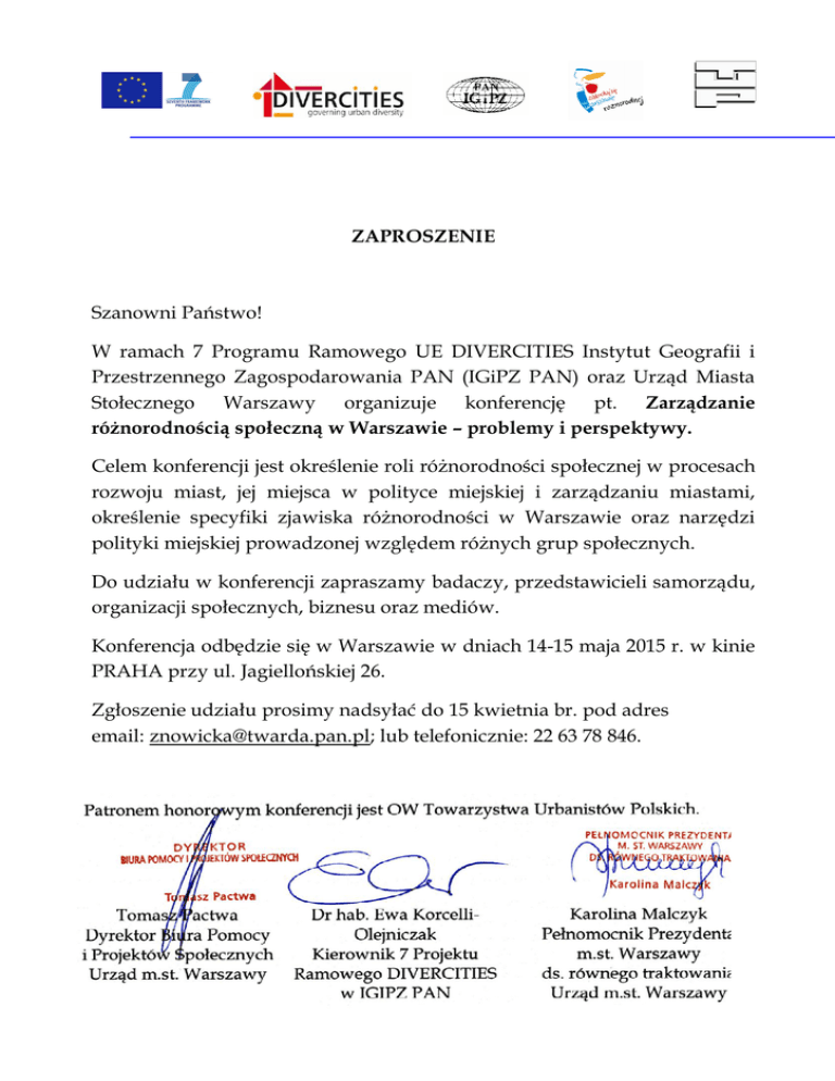 ZAPROSZENIE Szanowni Państwo! W ramach 7 Programu Ramowego UE DIVERCITIES Instytut Geografii i Przestrzennego Zagospodarowania PAN (IGiPZ PAN) oraz Urząd Miasta Stołecznego Warszawy organizuje konferencję pt. Zarządzanie różnorodnością społeczną w Warszawie – problemy i perspektywy. Celem konferencji jest określenie roli różnorodności społecznej w procesach rozwoju miast, jej miejsca w polityce miejskiej i zarządzaniu miastami, określenie specyfiki zjawiska różnorodności w Warszawie oraz narzędzi polityki miejskiej prowadzonej względem różnych grup społecznych. Do udziału w konferencji zapraszamy badaczy, przedstawicieli samorządu, organizacji społecznych, biznesu oraz mediów. Konferencja odbędzie się w Warszawie w dniach 14-15 maja 2015 r. w kinie PRAHA przy ul. Jagiellońskiej 26. Zgłoszenie udziału prosimy nadsyłać do 15 kwietnia br. pod adres email: [email protected]; lub telefonicznie: 22 63 78 846.