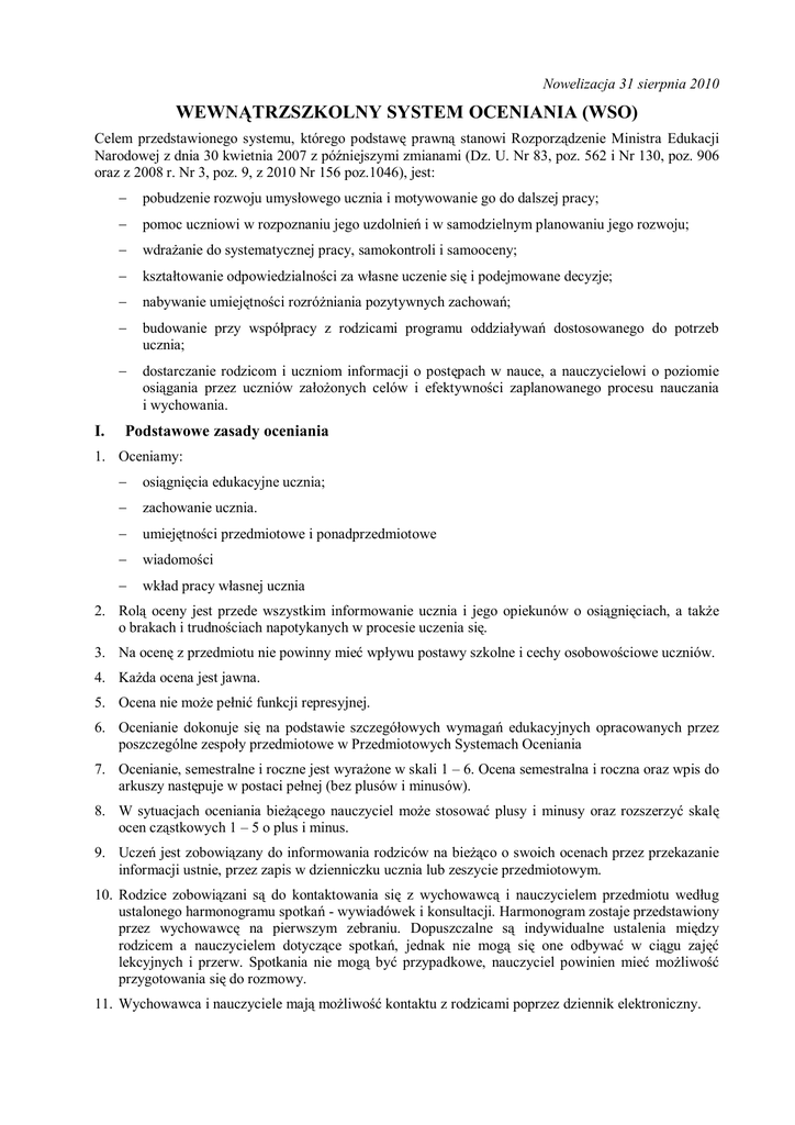 Nowelizacja 31 sierpnia 2010 WEWNĄTRZSZKOLNY SYSTEM OCENIANIA (WSO) Celem przedstawionego systemu, którego podstawę prawną stanowi Rozporządzenie Ministra Edukacji Narodowej z dnia 30 kwietnia 2007 z późniejszymi zmianami (Dz. U. Nr 83, poz. 562 i Nr 130, poz. 906 oraz z 2008 r. Nr 3, poz. 9, z 2010 Nr 156 poz.1046), jest: I. pobudzenie rozwoju umysłowego ucznia i motywowanie go do dalszej pracy; pomoc uczniowi w rozpoznaniu jego uzdolnień i w samodzielnym planowaniu jego rozwoju; wdrażanie do systematycznej pracy, samokontroli i samooceny; kształtowanie odpowiedzialności za własne uczenie się i podejmowane decyzje; nabywanie umiejętności rozróżniania pozytywnych zachowań; budowanie przy współpracy z rodzicami programu oddziaływań dostosowanego do potrzeb ucznia; dostarczanie rodzicom i uczniom informacji o postępach w nauce, a nauczycielowi o poziomie osiągania przez uczniów założonych celów i efektywności zaplanowanego procesu nauczania i wychowania. Podstawowe zasady oceniania 1. Oceniamy: osiągnięcia edukacyjne ucznia; zachowanie ucznia. umiejętności przedmiotowe i ponadprzedmiotowe wiadomości wkład pracy własnej ucznia 2. Rolą oceny jest przede wszystkim informowanie ucznia i jego opiekunów o osiągnięciach, a także o brakach i trudnościach napotykanych w procesie uczenia się. 3. Na ocenę z przedmiotu nie powinny mieć wpływu postawy szkolne i cechy osobowościowe uczniów. 4. Każda ocena jest jawna. 5. Ocena nie może pełnić funkcji represyjnej. 6. Ocenianie dokonuje się na podstawie szczegółowych wymagań edukacyjnych opracowanych przez poszczególne zespoły przedmiotowe w Przedmiotowych Systemach Oceniania 7. Ocenianie, semestralne i roczne jest wyrażone w skali 1 – 6. Ocena semestralna i roczna oraz wpis do arkuszy następuje w postaci pełnej (bez plusów i minusów). 8. W sytuacjach oceniania bieżącego nauczyciel może stosować plusy i minusy oraz rozszerzyć skalę ocen cząstkowych 1 – 5 o plus i minus. 9. Uczeń jest zobowiązany do informowania rodziców na bieżąco o swoich ocenach przez przekazanie informacji ustnie, przez zapis w dzienniczku ucznia lub zeszycie przedmiotowym. 10. Rodzice zobowiązani są do kontaktowania się z wychowawcą i nauczycielem przedmiotu według ustalonego harmonogramu spotkań - wywiadówek i konsultacji. Harmonogram zostaje przedstawiony przez wychowawcę na pierwszym zebraniu. Dopuszczalne są indywidualne ustalenia między rodzicem a nauczycielem dotyczące spotkań, jednak nie mogą się one odbywać w ciągu zajęć lekcyjnych i przerw. Spotkania nie mogą być przypadkowe, nauczyciel powinien mieć możliwość przygotowania się do rozmowy. 11. Wychowawca i nauczyciele mają możliwość kontaktu z rodzicami poprzez dziennik elektroniczny. 12. Rodzice posiadający aktywne konto w dzienniku elektronicznym są zobowiązani systematycznie obserwować postępy w nauce swojego dziecka. 13. O ocenach bieżących i przewidywanych ocenach semestralnych nauczyciel informuje rodziców na wywiadówkach i konsultacjach. Rodzice mają wgląd do ocen i frekwencji poprzez dziennik elektroniczny. 14. Sprawdziany mogą być udostępniane rodzicom do wglądu na ich życzenie podczas konsultacji. Prace pisemne są przechowywane w szkole przez okres jednego roku szkolnego. 15. W związku z zapisami w dzienniku elektronicznym wprowadza się obowiązujące wszystkich nauczycieli zasady: oceny ze sprawdzianów i testów należy odnotować czerwonym kolorem , kolor pozostałych ocen jest ustalany indywidualnie przez nauczyciela przedmiotu, kategorie ocen cząstkowych określone są w dzienniku elektronicznym, nieobecność ucznia na sprawdzianie zaznacza się wpisaniem wartości zero. zapisu poprawionej oceny dokonuje się w nawiasie kwadratowym (opcja popraw ocenę). w przypadku uzyskania oceny przez ucznia w innym terminie ustalonym przez nauczyciela, zostaje ona wpisana jako poprawa zera oznaczającego nieobecność, nieprzygotowanie ucznia do lekcji zaznacza się skrótem np, aktywność ucznia określa się oceną, plusami i minusami. Ilość plusów i minusów ustala indywidualnie nauczyciel przedmiotu (opcja konwertuj plusy/minusy), nieobecność ucznia na zajęciach zostaje odnotowana we właściwej rubryce skrótem nb; natomiast spóźnienia, nieobecności ucznia spowodowane dyżurem, udziałem w konkursie, zawodach itp. zaznacza się odpowiednimi skrótami wg kategorii w dzienniku elektronicznym, zwolnienie z zajęć z innych przyczyn odnotowuje się zapisem „zw” (zwolniony) oceny niedostateczne semestralne i roczne mają migające tło II. Sposoby i zasady sprawdzania postępów edukacyjnych uczniów: A. Ocenianie bieżące: 1. W okresie dwóch pierwszych tygodni pobytu w szkole uczniowie klas pierwszych zapoznawani są z kryteriami oceniania i nie otrzymują ocen niedostatecznych. 2. Przestrzegana jest zasada systematyczności. Uczeń powinien posiadać co najmniej trzy oceny cząstkowe w semestrze z przedmiotu (w odniesieniu do przedmiotu jednogodzinnego w tygodniu), a ich wystawienie powinno być rozłożone w czasie. Przyjmuje się, że do końca października musi pojawić się co najmniej jedna ocena (w odniesieniu do przedmiotu jednogodzinnego w tygodniu). 3. O przewidywanym sprawdzianie nauczyciel przedmiotu powiadamia uczniów minimum na tydzień przed jego realizacją i odnotowuje w dzienniku elektronicznym w celu zapobieżenia ich kumulacji. Dopuszczalne są trzy sprawdziany tygodniowo dla ucznia. Jeżeli sprawdzian nie odbędzie się w zaplanowanym terminie z przyczyn losowych, to zostaje przeprowadzony na najbliższej lekcji przedmiotu bez względu na liczbę wcześniej zapisanych w dzienniku sprawdzianów. 4. Każdy uczeń ma obowiązek uczestniczyć w przewidzianych formach sprawdzania wiadomości i podjąć pracę nad zadaniami. W przypadku nieuczestniczenia w którejś z form z powodu choroby lub wypadku losowego, uczeń ma obowiązek poddać się sprawdzianowi wiedz