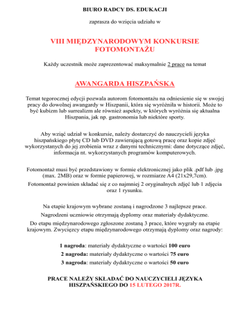 BIURO RADCY DS. EDUKACJI zaprasza do wzięcia udziału w VIII MIĘDZYNARODOWYM KONKURSIE FOTOMONTAŻU Każdy uczestnik może zaprezentować maksymalnie 2 prace na temat AWANGARDA HISZPAŃSKA Temat tegorocznej edycji pozwala autorom fotomontażu na odniesienie się w swojej pracy do dowolnej awangardy w Hiszpanii, która się wyróżniła w historii. Może to być kubizm lub surrealizm ale również aspekty, w których wyróżnia się aktualna Hiszpania, jak np. gastronomia lub niektóre sporty. Aby wziąć udział w konkursie, należy dostarczyć do nauczycieli języka hiszpańskiego płytę CD lub DVD zawierającą gotową pracę oraz kopie zdjęć wykorzystanych do jej zrobienia wraz z danymi technicznymi: dane dotyczące zdjęć, informacja nt. wykorzystanych programów komputerowych. Fotomontaż musi być przedstawiony w formie elektronicznej jako plik .pdf lub .jpg (max. 2MB) oraz w formie papierowej, w rozmiarze A4 (21x29,7cm). Fotomontaż powinien składać się z co najmniej 2 oryginalnych zdjęć lub 1 zdjęcia oraz 1 rysunku. Na etapie krajowym wybrane zostaną i nagrodzone 3 najlepsze prace. Nagrodzeni uczniowie otrzymają dyplomy oraz materiały dydaktyczne. Do etapu międzynarodowego zgłoszone zostaną 3 prace, które wygrały na etapie krajowym. Zwycięzcy etapu międzynarodowego otrzymają dyplomy oraz nagrody: 1 nagroda: materiały dydaktyczne o wartości 100 euro 2 nagroda: materiały dydaktyczne o wartości 75 euro 3 nagroda: materiały dydaktyczne o wartości 50 euro PRACE NALEŻY SKŁADAĆ DO NAUCZYCIELI JĘZYKA HISZPAŃSKIEGO DO 15 LUTEGO 2017R.