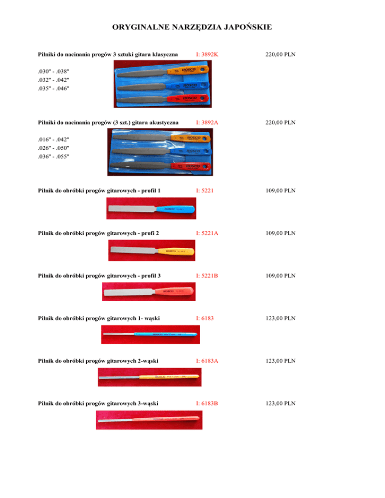 ORYGINALNE NARZĘDZIA JAPOŃSKIE Pilniki do nacinania progów 3 sztuki gitara klasyczna I: 3892K 220,00 PLN I: 3892A 220,00 PLN Pilnik do obróbki progów gitarowych - profil 1 I: 5221 109,00 PLN Pilnik do obróbki progów gitarowych - profi 2 I: 5221A 109,00 PLN Pilnik do obróbki progów gitarowych - profil 3 I: 5221B 109,00 PLN Pilnik do obróbki progów gitarowych 1- wąski I: 6183 123,00 PLN Pilnik do obróbki progów gitarowych 2-wąski I: 6183A 123,00 PLN Pilnik do obróbki progów gitarowych 3-wąski I: 6183B 123,00 PLN .030'' - .038'' .032'' - .042'' .035'' - .046'' Pilniki do nacinania progów (3 szt.) gitara akustyczna .016'' - .042'' .026'' - .050'' .036'' - .055'' ORYGINALNE NARZĘDZIA JAPOŃSKIE Pilnik diamentowy 3 w 1 (radius 1,2,3) z rączką I: 7040 3 możliwości dopasowania szerokości do grzybka progów. Gradacja 600, całkowita długość 230mm 385,00 PLN I: 3893 430,00 PLN Piłka do czyszczenia otworów progowych 0,4mm I: 6186 Szerszą stroną piłki czyścimy od E1 - E6, natomiast strona węższa przeznaczona jest do czyszczenia E6 - E1 78,00 PLN Pilnik do obróbki poziomu progów gitarowych I: 5222 bez uchwytu Szybkie i proste poziomowanie progów. Wymiar 160x28mm 62,00 PLN Pilniki japońskie - zestaw 10 szt. 0,010" 0,013" 0,016" 0,024" 0,028" 0,032" 0,036" 0,042" 0,046" 0,056" Iglaczki japońskie -zestaw 5 sztuk -srebrne I: 7044 258,00 PLN Wysokiej klasy okrągłe iglaki ze specjalna powierzchnią nie brudzącą. Zapewniają precyzyjne piłowanie, przeznaczone do profilowania prożków i podstawków, również do czyszczenia otworów kołkowych. Posiadają długą żywotność. Całkowita długość 100mm Iglaczki japońskie -zestaw 5 sztuk -czernione I: 7044A DOBRA JAKOŚĆ W ROZSĄDNEJ CENIE! Wysokiej klasy okrągłe iglaki, przeznaczone do profilowania prożków i podstawków, również do czyszczenia otworów kołkowych. Posiadają długą żywotność. Całkowita długość 100mm 153,00 PLN ORYGINALNE NARZĘDZIA JAPOŃSKIE Zestaw iglaków/pilniczków (5 szt.) Całkowita długość 200mm, gradacja 200. Profile iglaków/pilniczków przedstawia zdjęcia nr 2 I: 4399A 52,00 PLN Urządzenie umożliwiające precyzyjne nacięcie I: 7045 345,00 PLN podstrunnicy pod względem kąta i głębokości progu Prowadnica pił HOSCO do nacinania progów została zaprojektowana do współpracy z piłami HOSCO. Głębokość nacięć pod progi może być regulowana w zakresie 0,3-5,3 mm. Podstawa prowadnicy jest obustronnie pokryta zdejmowalną silikonowo-gumową matą o grubości 0,3 mm, dla pewnego trzymania podstrunnicy w czasie cięcia (Polecamy używanie ścisków i zdejmowanie w takim przypadku górnej maty). 3 magnesy neodymowe pozwalają na precyzyjne prowadzenie ostrza piły, dla zapewnienia prostego cięcia, pod właściwym względem podstrunnicy kątem. Prowadnica wykonana jest ze stali nierdzewnej. Wymiary: 195x90x25 mm, Waga: 475g Pilniki LUX do nacinania prożków i podstawków I: 1192L 209,00 PLN Zestaw 4 pilników do nacinania podstawków i prożków. Pilniki o szerokiej powierzchni pracującej, poręczna, wygodna rękojeść. Całkowita długość 250mm Zestaw zawiera : pilnik E .0,020'' pilnik A .0,026'' pilnik D .0,032'' pilnik G .0,040'' Piłka do ucinania kołków w komorze kołkowej I: 7039 61,00 PLN ORYGINALNE NARZĘDZIA JAPOŃSKIE Gumka do polerowania progów ( kpl. 2 szt) - 180 I: 7041 35,00 PLN Gumka do polerowania progów, ściera również małe zadrapania na progach oraz usuwa brud oraz zaśniedzenia. Ze względu na swoją delikatność i elastyczność, gumka dopasowuje się do łuku progów. Łatwo da się ją uciąć nożem. Wymiar 65x18x9mm Gumka do polerowania progów ( kpl. 2 szt) - 400 I: 7041A 35,00 PLN Gumka do polerowania progów ( kpl. 2 szt) - 1000 I: 7041B 35,00 PLN Miarka lutnicza japońska 100 cm-sztywna I: 7042 Miarka zawiera na rewersie tablicę przeliczeniową z cali na mm 99,00 PLN Miarka lutnicza japońska 15 cm-miękka I: 7043 Miarka zawiera na rewersie tablicę przeliczeniową z cali na mm 15,00 PLN Ostrze japońskie Kiridashi lux 12mm I: 2430-12 179,00 PLN Nóż japoński szerokie ostrze 21mm w drewnianym opakowaniu I: 7049 298,00 PLN ORYGINALNE NARZĘDZIA JAPOŃSKIE Noże do rzeźbienia-typ japoński zestaw 6 szt. I: 7048 w materiałowym etui Noże japońskie KOGATANA, długość całkowita 157mm 380,00 PLN Zestaw japońskich 2 cyklin Grubość cyklin 0,4 wymiar 120x44mm I: 7046 38,00 PLN Zestaw japońskich 5 małych cyklin profilowanych Zestaw zawiera cykliny o grubości 0,2 i 0,4 I: 7047 76,00 PLN