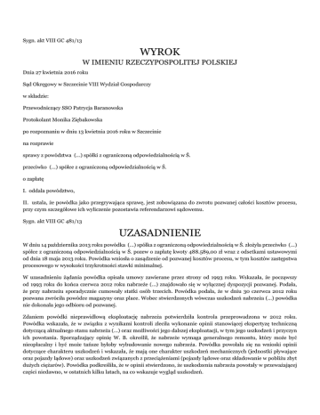 Sygn. akt VIII GC 481/13 WYROK W IMIENIU RZECZYPOSPOLITEJ POLSKIEJ Dnia 27 kwietnia 2016 roku Sąd Okręgowy w Szczecinie VIII Wydział Gospodarczy w składzie: Przewodniczący SSO Patrycja Baranowska Protokolant Monika Ziębakowska po rozpoznaniu w dniu 13 kwietnia 2016 roku w Szczecinie na rozprawie sprawy z powództwa (...) spółki z ograniczoną odpowiedzialnością w Ś. przeciwko (...) spółce z ograniczoną odpowiedzialnością w Ś. o zapłatę I. oddala powództwo, II. ustala, że powódka jako przegrywająca sprawę, jest zobowiązana do zwrotu pozwanej całości kosztów procesu, przy czym szczegółowe ich wyliczenie pozostawia referendarzowi sądowemu. Sygn. akt VIII GC 481/13 UZASADNIENIE W dniu 14 października 2013 roku powódka (...) spółka z ograniczoną odpowiedzialnością w Ś. złożyła przeciwko (...) spółce z ograniczoną odpowiedzialnością w Ś. pozew o zapłatę kwoty 488.589,00 zł wraz z odsetkami ustawowymi od dnia 18 maja 2013 roku. Powódka wniosła o zasądzenie od pozwanej kosztów procesu, w tym kosztów zastępstwa procesowego w wysokości trzykrotności stawki minimalnej. W uzasadnieniu żądania powódka opisała umowy zawierane przez strony od 1993 roku. Wskazała, że począwszy od 1993 roku do końca czerwca 2012 roku nabrzeże (...) znajdowało się w wyłącznej dyspozycji pozwanej. Podała, że przy nabrzeżu sporadycznie cumowały statki osób trzecich. Powódka podała, że w dniu 30 czerwca 2012 roku pozwana zwróciła powódce magazyny oraz place. Wobec stwierdzonych wówczas uszkodzeń nabrzeża (...) powódka nie dokonała jego odbioru od pozwanej. Zdaniem powódki nieprawidłową eksploatację nabrzeża potwierdziła kontrola przeprowadzona w 2012 roku. Powódka wskazała, że w związku z wynikami kontroli zleciła wykonanie opinii stanowiącej ekspertyzę techniczną dotyczącą aktualnego stanu nabrzeża (...) oraz możliwości jego dalszej eksploatacji, w tym jego uszkodzeń i przyczyn ich powstania. Sporządzający opinię W. B. określił, że nabrzeże wymaga generalnego remontu, który może być nieopłacalny i być może tańsze byłoby wybudowanie nowego nabrzeża. Powódka powołała się na wnioski opinii dotyczące charakteru uszkodzeń i wskazała, że mają one charakter uszkodzeń mechanicznych (jednostki pływające oraz pojazdy lądowe) oraz uszkodzeń związanych z przeciążeniami (pojazdy lądowe oraz składowanie w pobliżu zbyt dużych ciężarów). Powódka podkreśliła, że w opinii stwierdzono, że uszkodzenia nabrzeża powstały w przeważającej części niedawno, w ostatnich kilku latach, na co wskazuje wygląd uszkodzeń. Uzasadniając zgłoszone roszczenie powódka wskazała, że jej żądanie obejmuje kwotę 488.589,00 zł stanowiącą 50 % kwoty niezbędnej do przywrócenia nabrzeżu (...) projektowych parametrów eksploatacyjnych zgodnie z Instrukcją eksploatacji nabrzeży w B.(...)m. Koszty te, zgodnie z wyceną W. B., sporządzoną na zlecenie powódki wynoszą łącznie 1.099.723,00 zł, ale z tego tylko część w wysokości 977.178,00 zł stanowi koszt napraw uszkodzeń wywołanych nadmierną eksploatacją nabrzeża przez pozwaną. Jest to kwota stanowiąca wysokość szkody powódki i będąca następstwem działań i zaniechań pozwanej, których wynikiem jest konieczność przeprowadzenia robót niezbędnych do przywrócenie nabrzeżu (...) jego parametrów eksploatacyjnych. Powódka wskazywała, że to pozwana, posiadając nabrzeże na wyłączność ponosi odpowiedzialność za jego stan. Podnosiła, że pozwana nigdy nie poinformowała powódki, że nabrzeże jest uszkodzone, ponadto pozwana pomimo obowiązków wynikających z umowy z dnia 1 maja 2008 roku nie dokonała remontu nabrzeża. Zdaniem powódki uszkodzenia nabrzeża nie mają charakteru zwykłego zużycia, a są wywołane jego nadmierną i sprzeczną z instrukcją oraz jego parametrami eksploatacją w ostatnim okresie obowiązywania umowy, tj. w latach 2010-2012. Jako podstawę prawną powództwa powódka powołała art. 471 k.c.. Nadto powódka wskazała, że odpowiedzialność pozwanej może mieć oparcie w art. 415 k.c. Pozwana bowiem mając wiedzę, co do zasad eksploatacji nabrzeża (...), eksploatowała to nabrzeże w sposób niezgodny z tymi zasadami. W odpowiedzi na pozew pozwana wniosła o oddalenie powództwa oraz o obciążenie powódki wszystkimi kosztami postępowania, w tym wyodrębnionymi kosztami zastępstwa prawnego oraz kosztami opłaty skarbowej od pełnomocnictwa. Pozwana zaprzeczyła, aby w umowie najmu z dnia 6 stycznia 1993 roku nr (...) były zapisy, że jedynym użytkownikiem nabrzeża (...) jest pozwana. Umowa ta bowiem przewidywała zezwolenie na dokonywanie przez pozwaną przeładunków towarowych w (...). Dokonując przeładunków strona pozwana każdorazowo zgłaszała ten fakt powodowi i dokonywała z tytułu przeładunków opłat, czego dowodem są załączone do pozwu faktury VAT. Pozwana podkreśliła, że posiadała dopuszczony do dokonywania przeładunków sprzęt, zaś opinia odnośnie możliwości używania przy dokonywaniu przeładunków tego sprzętu jest aktualna do chwili obecnej. Skoro sprzęt używany przez pozwaną do dokonywania przeładunków został dopuszczony do eksploatacji, samo użycie tego sprzętu nie mogło doprowadzić do uszkodzenia nabrzeża. Pozwana zaprzeczyła, aby sposób użytkowania sprzętu dorowadził do powstania wskazanych przez powódkę uszkodzeń. Pozwana podtrzymała stanowisko zaprezentowane w piśmie z dnia 14 czerwca 2013 roku, stanowiącym odpowiedź na wniosek o zawezwanie do próby ugodowej. Poza tym pozwana wskazała, że nie zgadza się z wnioskami ekspertyzy przedstawionej przez powódkę i zleciła wykonanie kontr ekspertyzy osobie posiadającej uprawnienia budowlane. Poza tym pozwana podnosiła, że na nabrzeżu (...) cumowały jednostki należące do innych podmiotów, zaś jednym z wielu dowodów na okoliczność braku wyłączności na 