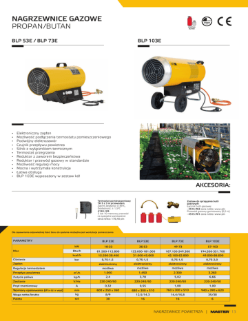 NAGRZEWNICE GAZOWE PROPAN/BUTAN PROPAN BUTAN BLP 53E / BLP 73E BLP 103E Elektroniczny zapłon Możliwość podłączenia termostatu pomieszczeniowego Podwójny elektrozawór Czujnik przepływu powietrza Silnik z wyłącznikiem termicznym Termostat przegrzania Reduktor z zaworem bezpieczeństwa Reduktor i przewód gazowy w standardzie Możliwość regulacji mocy Mocna i wytrzymała konstrukcja Łatwa obsługa BLP 103E wyposażony w zestaw kół AKCESORIA: Termostat pomieszczeniowy TH 5 z 3 m przewodem Zakres działania: 0-36°C, Dokładność: ± 1,5°C 4150.105 5 lub 10 metrowy przewód na specjalne zamówienie cena netto: 176,40 pln Zestaw do sprzęgania butli gazowych: Łącznik butli gazowej - 4515.902 cena netto: www pln Przewód gazowy gwintowany (0,5 m) - 4515.901 cena netto: www pln Dla zapewnienia odpowiedniej ilości tlenu do spalania niezbędna jest wentylacja pomieszczenia PARAMETRY Moc Ciśnienie BLP 33E BLP 53E BLP 73E BLP 103E kW 18-33 36-53 49-73 57-103 Btu/h 61.500-112.800 123.000-181.000 167.100-249.300 194.500-351.700 kcal/h 15.500-28.400 31.000-45.600 42.100-62.800 49.000-88.600 bar Zapłon 0,75-1,5 0,75-1,5 0,75-1,5 0,75-2,0 elektroniczny elektroniczny elektroniczny elektroniczny możliwa możliwa możliwa możliwa Przepływ powietrza m3/h 1.000 1.450 2.300 3.260 Zużycie paliwa kg/h 2,4 3,78 5,02 6,66 Zasilanie V/Hz 220-240/50 220-240/50 220-240/50 220-240/50 Regulacja termostatem A 0,32 0,55 1,00 1,00 mm 600 x 250 x 360 680 x 300 x 510 760 x 300 x 510 940 x 390 x 620 Waga netto/brutto kg 8/9 12,5/14,3 14,4/16,8 35/38 Paleta szt 30 16 16 6 Prąd znamionowy Wymiary opakowania (dł x sz x wys) NAGRZEWNICE POWIETRZA | 13
