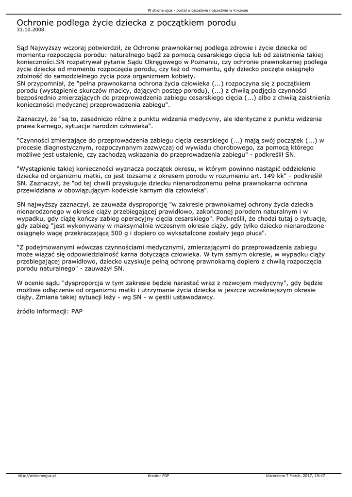 W strone ojca - portal o ojcostwie i ojcostwie w kryzysie Ochronie podlega życie dziecka z początkiem porodu 31.10.2008. Sąd Najwyższy wczoraj potwierdził, że Ochronie prawnokarnej podlega zdrowie i życie dziecka od momentu rozpoczęcia porodu: naturalnego bądź za pomocą cesarskiego cięcia lub od zaistnienia takiej konieczności.SN rozpatrywał pytanie Sądu Okręgowego w Poznaniu, czy ochronie prawnokarnej podlega życie dziecka od momentu rozpoczęcia porodu, czy też od momentu, gdy dziecko poczęte osiągnęło zdolność do samodzielnego życia poza organizmem kobiety. SN przypomniał, że "pełna prawnokarna ochrona życia człowieka (...) rozpoczyna się z początkiem porodu (wystąpienie skurczów macicy, dających postęp porodu), (...) z chwilą podjęcia czynności bezpośrednio zmierzających do przeprowadzenia zabiegu cesarskiego cięcia (...) albo z chwilą zaistnienia konieczności medycznej przeprowadzenia zabiegu". Zaznaczył, że "są to, zasadniczo różne z punktu widzenia medycyny, ale identyczne z punktu widzenia prawa karnego, sytuacje narodzin człowieka". "Czynności zmierzające do przeprowadzenia zabiegu cięcia cesarskiego (...) mają swój początek (...) w procesie diagnostycznym, rozpoczynanym zazwyczaj od wywiadu chorobowego, za pomocą którego możliwe jest ustalenie, czy zachodzą wskazania do przeprowadzenia zabiegu" - podkreślił SN. "Wystąpienie takiej konieczności wyznacza początek okresu, w którym powinno nastąpić oddzielenie dziecka od organizmu matki, co jest tożsame z okresem porodu w rozumieniu art. 149 kk" - podkreślił SN. Zaznaczył, że "od tej chwili przysługuje dziecku nienarodzonemu pełna prawnokarna ochrona przewidziana w obowiązującym kodeksie karnym dla człowieka". SN najwyższy zaznaczył, że zauważa dysproporcję "w zakresie prawnokarnej ochrony życia dziecka nienarodzonego w okresie ciąży przebiegającej prawidłowo, zakończonej porodem naturalnym i w wypadku, gdy ciążę kończy zabieg operacyjny cięcia cesarskiego". Podkreślił, że chodzi tutaj o sytuacje, gdy zabieg "jest wykonywany w maksymalnie wczesnym okresie ciąży, gdy tylko dziecko nienarodzone osiągnęło wagę przekraczającą 500 g i dopiero co wykształcone zostały jego płuca". "Z podejmowanymi wówczas czynnościami medycznymi, zmierzającymi do przeprowadzenia zabiegu może wiązać się odpowiedzialność karna dotycząca człowieka. W tym samym okresie, w wypadku ciąży przebiegającej prawidłowo, dziecko uzyskuje pełną ochronę prawnokarną dopiero z chwilą rozpoczęcia porodu naturalnego" - zauważył SN. W ocenie sądu "dysproporcja w tym zakresie będzie narastać wraz z rozwojem medycyny", gdy będzie możliwe odłączenie od organizmu matki i utrzymanie życia dziecka w jeszcze wcześniejszym okresie ciąży. Zmiana takiej sytuacji leży - wg SN - w gestii ustawodawcy. źródło informacji: PAP http://wstroneojca.pl Kreator PDF Utworzono 7 March, 2017, 19:47