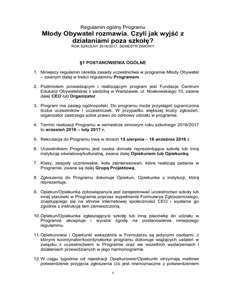 Regulamin ogólny Programu Młody Obywatel rozmawia. Czyli jak wyjść z działaniami poza szkołę? ROK SZKOLNY 2016/2017, SEMESTR ZIMOWY §1 POSTANOWIENIA OGÓLNE 1. Niniejszy regulamin określa zasady uczestnictwa w programie Młody Obywatel – zwanym dalej w treści regulaminu Programem. 2. Podmiotem prowadzącym i realizującym program jest Fundacja Centrum Edukacji Obywatelskiej z siedzibą w Warszawie, ul. Noakowskiego 10, zwane dalej CEO lub Organizator. 3. Program ma zasięg ogólnopolski. Do programu może przystąpić ograniczona liczba uczestników i uczestniczek. W przypadku większej liczby zgłoszeń, organizator zastrzega sobie prawo do odmowy udziału w programie. 4. Termin realizacji Programu w semestrze zimowym roku szkolnego 2016/2017 to wrzesień 2016 – luty 2017 r. 5. Rekrutacja do Programu trwa w dniach 15 sierpnia – 18 września 2016 r. 6. Uczestnikiem Programu jest osoba dorosła reprezentująca szkołę lub inną instytucję oświatową/kulturalną, zwana dalej Opiekunem lub Opiekunką. 7. Klasy, zespoły uczniowskie, koła zainteresowań, które realizują zadania w Programie, zwane są dalej Grupą Projektową. 8. Zgłoszenia do Programu dokonuje Opiekun, Opiekunka z instytucji, którą reprezentuje. 9. Opiekun/Opiekunka zobowiązany/a jest zarejestrować uczestnictwo szkoły lub innej placówki w Programie poprzez wypełnienie Formularza Zgłoszeniowego, znajdującego się na stronie internetowej społeczności CEO i wysłanie go zgodnie z instrukcją tam zamieszczoną. 10. Opiekun/Opiekunka zgłaszający/a szkołę lub inną placówkę do udziału w Programie akceptuje i wyraża zgodę na postanowienia niniejszego regulaminu. 11. Opiekunowie i Opiekunki wskazani/e w Formularzu są jedynymi osobami, z którymi koordynator/koordynatorka programu dokonuje wiążących ustaleń w związku z uczestnictwem w Programie oraz we wszelkich wydarzeniach i działaniach przewidzianych w jego harmonogramie. 12. W ciągu tygodnia od rejestracji Opiekunowie/Opiekunki otrzymają mailowe potwierdzenie przyjęcia zgłoszenia (co jest równoznaczne z potwierdzeniem 1 uczestnictwa w programie), bądź informację o niezakwalifikowaniu się do Programu. 13. W przypadku realizowania projektu niezgodnie z par. 3 regulaminu, koordynator/koordynatorka Programu zastrzega sobie prawo do odmowy podjęcia w przyszłości współpracy w jakiejkolwiek formie z Opiekunem/Opiekunką, który/a dany projekt realizował/a i/lub do poinformowania o zaistniałej sytuacji dyrektora szkoły lub placówki. 14. W przypadku braku możliwości wywiązania się przez Opiekuna/Opiekunki z zobowiązań, o których mowa w regulaminie we wskazanych terminach ze względów losowych, jest on zobowiązany/a przed ich upływem poinformować o tym koordynatora/koordynatorkę Programu i wnieść o przedłużenie terminu. W przeciwnym razie brak działania ze strony Opiekuna/Opiekunka traktowany/a będzie jako rezygnacja z udziału w Programie. 15. Opiekunowie/ Opiekunki w ramach uczestnictwa w Programie zobowiązują się do zapoznania Grup Projektowych z materiałami edukacyjnymi i pomocami dydaktycznymi opracowanymi lub proponowanymi przez CEO. 16. Po zakończeniu Programu Opiekunowie i Opiekunki, którzy spełnią warunki ukończenia Programu (par. 3, pkt.1), otrzymują dyplomy imienne, a członkowie Grupy Projektowej dyplomy in blanco. 17. Ponadto, na prośbę CEO Opiekun/ Opiekunka przekaże CEO wskazane przez CEO dane członków/członkinie Grupy Projektowej (np. imię i nazwisko), uzyskując uprzednio zgodę pisemną członków/członkinie Grupy Projektowej lub w przypadku ich niepełnoletności ich przedstawicieli (rodzic, opiekun) na udostępnienie tych danych i przetwarzanie przez CEO w celu realizacji Programu (wzór zgody stanowi załącznik nr 1 do niniejszego regulaminu). 18. Udział w Programie jest bezpłatny. 19. W sprawach nie uregulowanych niniejszym regulaminem mają zastosowanie odpowiednie przepisy kodeksu cywilnego oraz inne stosowne przepisy prawa polskiego. §2 CELE PROGRAMU 1. Cele programu to: wprowadzanie tematyki działań w społeczności lokalnej do szkół gimnazjalnych i innych organizacji pracujących z młodzieżą; podniesienie jakości gimnazjalnych projektów edukacyjnych; wsparcie młodych ludzi w podejmowaniu inicjatyw na rzecz społeczności lokalnej; 2 wyposażenie opiekunów w wiedzę i umiejętności przydatne do odpowiedniego wspierania działań lokalnych podejmowanych przez grupy młodzieżowe. § 3 ZASADY UCZESTNICTWA W PROGRAMIE 1. Do obowiązkowych zadań opiekuna/opiekunki w Programie Młody Obywatel należy: praca z wybraną grupą młodzieży (Grupą Projektową) podczas realizacji działania w ramach jednego z trzech zaproponowanych tematów: Urząd od podszewki, Reportaż po sąsiedzku, Przyszłość na warsztacie. przygotowanie i zrealizowanie działań z wykorzystaniem materiałów edukacyjnych i pomocy dydaktycznych opracowanych lub proponowanych przez CEO; zamieszczanie informacji o realizatorach programu Młody Obywatel (Fundacja CEO oraz Fundacja BGK) na wszystkich wytworzonych materiałach promocyjnych i merytorycznych; udział w szkoleniu o metodzie projektu w wymiarze lokalnym wprowadzającym do tematu pracy metodą projektu z młodzieżą w środowisku lokalnym; stały kontakt z koordynatorem/koordynatorką Programu; wypełnienie końcowego sprawozdania z realizacji Programu najpóźniej do dnia 28 lutego 2017 roku. 2. Ponadto Opiekun/Opiekunka może: korzystać ze wszystkich materiałów edukacyjnych wykorzystywanych w Programie; wziąć udział w programie mentoringowym, który zawiera w sobie dodatkowe warsztaty dla uczniów i uczennic w szkole oraz indywidualną opiekę merytoryczną mentora/mentorki z Centrum Edukacji Obywatelskiej; zaprosić koordynatora/koordynatorkę projektu na wizytę w swojej szkole/instytucji; przesyłać na adres [email protected] relacje z prowadzonych w ramach projektu działań do opublikowania na stronie intern