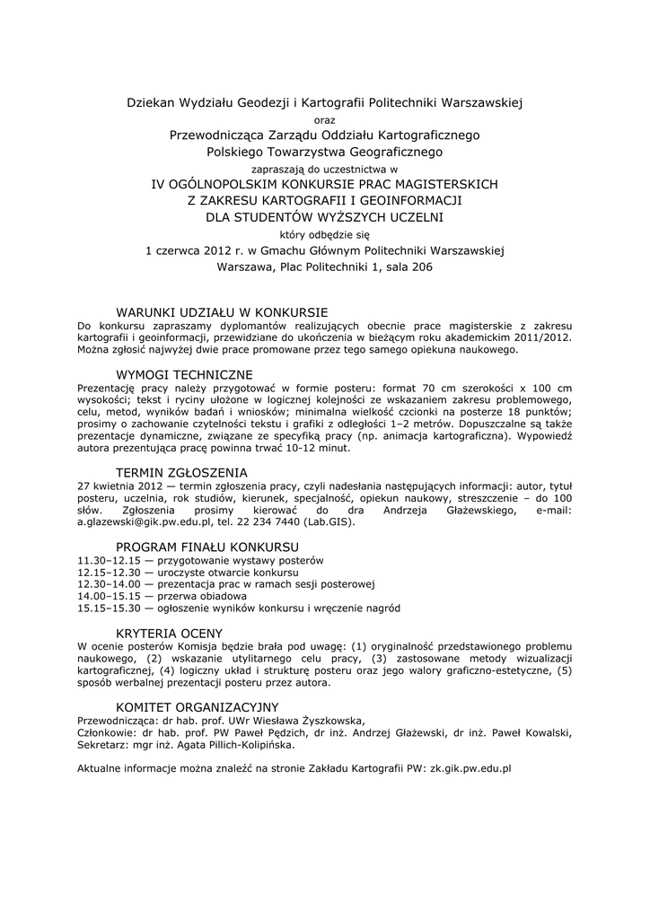Dziekan Wydziału Geodezji i Kartografii Politechniki Warszawskiej oraz Przewodnicząca Zarządu Oddziału Kartograficznego Polskiego Towarzystwa Geograficznego zapraszają do uczestnictwa w IV OGÓLNOPOLSKIM KONKURSIE PRAC MAGISTERSKICH Z ZAKRESU KARTOGRAFII I GEOINFORMACJI DLA STUDENTÓW WYŻSZYCH UCZELNI który odbędzie się 1 czerwca 2012 r. w Gmachu Głównym Politechniki Warszawskiej Warszawa, Plac Politechniki 1, sala 206 WARUNKI UDZIAŁU W KONKURSIE Do konkursu zapraszamy dyplomantów realizujących obecnie prace magisterskie z zakresu kartografii i geoinformacji, przewidziane do ukończenia w bieżącym roku akademickim 2011/2012. Można zgłosić najwyżej dwie prace promowane przez tego samego opiekuna naukowego. WYMOGI TECHNICZNE Prezentację pracy należy przygotować w formie posteru: format 70 cm szerokości x 100 cm wysokości; tekst i ryciny ułożone w logicznej kolejności ze wskazaniem zakresu problemowego, celu, metod, wyników badań i wniosków; minimalna wielkość czcionki na posterze 18 punktów; prosimy o zachowanie czytelności tekstu i grafiki z odległości 1–2 metrów. Dopuszczalne są także prezentacje dynamiczne, związane ze specyfiką pracy (np. animacja kartograficzna). Wypowiedź autora prezentująca pracę powinna trwać 10-12 minut. TERMIN ZGŁOSZENIA 27 kwietnia 2012 — termin zgłoszenia pracy, czyli nadesłania następujących informacji: autor, tytuł posteru, uczelnia, rok studiów, kierunek, specjalność, opiekun naukowy, streszczenie – do 100 słów. Zgłoszenia prosimy kierować do dra Andrzeja Głażewskiego, e-mail: [email protected], tel. 22 234 7440 (Lab.GIS). PROGRAM FINAŁU KONKURSU 11.30–12.15 12.15–12.30 12.30–14.00 14.00–15.15 15.15–15.30 — — — — — przygotowanie wystawy posterów uroczyste otwarcie konkursu prezentacja prac w ramach sesji posterowej przerwa obiadowa ogłoszenie wyników konkursu i wręczenie nagród KRYTERIA OCENY W ocenie posterów Komisja będzie brała pod uwagę: (1) oryginalność przedstawionego problemu naukowego, (2) wskazanie utylitarnego celu pracy, (3) zastosowane metody wizualizacji kartograficznej, (4) logiczny układ i strukturę posteru oraz jego walory graficzno-estetyczne, (5) sposób werbalnej prezentacji posteru przez autora. KOMITET ORGANIZACYJNY Przewodnicząca: dr hab. prof. UWr Wiesława Żyszkowska, Członkowie: dr hab. prof. PW Paweł Pędzich, dr inż. Andrzej Głażewski, dr inż. Paweł Kowalski, Sekretarz: mgr inż. Agata Pillich-Kolipińska. Aktualne informacje można znaleźć na stronie Zakładu Kartografii PW: zk.gik.pw.edu.pl