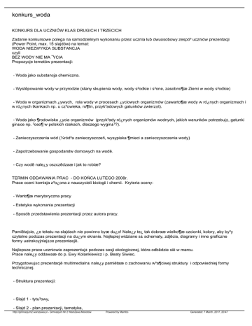 konkurs_woda KONKURS DLA UCZNIÓW KLAS DRUGICH I TRZECICH Zadanie konkursowe polega na samodzielnym wykonaniu przez ucznia lub dwuosobowy zespó³ uczniów prezentacji (Power Point, max. 15 slajdów) na temat: WODA NIEZWYK£A SUBSTANCJA czyli BEZ WODY NIE MA ¯YCIA Propozycje tematów prezentacji: - Woda jako substancja chemiczna. - Wystêpowanie wody w przyrodzie (stany skupienia wody, wody s³odkie i s³one, zasobno¶æ Ziemi w wody s³odkie) - Woda w organizmach ¿ywych, rola wody w procesach ¿yciowych organizmów (zawarto¶æ wody w ró¿nych organizmach i w ró¿nych tkankach np. u cz³owieka, ro¶lin, przyk³adowych gatunków zwierz±t). - Woda jako ¶rodowisko ¿ycia organizmów (przyk³ady ró¿nych organizmów wodnych, jakich warunków potrzebuj±, gatunki gin±ce np. ³oso¶ w polskich rzekach, dlaczego wygin±³?). - Zanieczyszczenia wód (¼ród³a zanieczyszczeñ, wysypiska ¶mieci a zanieczyszczenia wody) - Zapotrzebowanie gospodarstw domowych na wodê. - Czy wodê nale¿y oszczêdzaæ i jak to robiæ? TERMIN ODDAWANIA PRAC - DO KOÑCA LUTEGO 2008r. Prace oceni komisja z³o¿ona z nauczycieli biologii i chemii. Kryteria oceny: - Warto¶æ merytoryczna pracy - Estetyka wykonania prezentacji - Sposób przedstawienia prezentacji przez autora pracy. Pamiêtajcie, ¿e tekstu na slajdach nie powinno byæ du¿o! Nale¿y te¿ tak dobraæ wielko¶æ czcionki, kolory, aby by³y czytelne podczas prezentacji na du¿ym ekranie. Najlepiej widziane s± schematy, zdjêcia, diagramy i inne graficzne formy uatrakcyjniaj±ce prezentacjê. Najlepsze prace uczniowie zaprezentuj± podczas sesji ekologicznej, która odbêdzie siê w marcu. Prace nale¿y oddawaæ do p. Ewy Kolankiewicz i p. Beaty Siwiec. Przygotowuj±c prezentacjê multimedialn± nale¿y pamiêtaæ o zachowaniu w³a¶ciwej struktury i odpowiedniej formy technicznej. - Struktura prezentacji: - Slajd 1 - tytu³owy, - Slajd 2 - plan prezentacji, tematyka, http://gimnazjum2.warszawa.pl - Gimnazjum Nr 2 Warszawa Mokotów Powered by Mambo Generated: 7 March, 2017, 20:47 - Slajd 3 i nastêpne do slajdu 12 - zawarto¶æ, - Slajd 13 - podsumowanie, wnioski, - Slajd 14 - bibliografia, - Slajd 15 - zakoñczenie, np. dziêkujê za uwagê, adres, kontakt, Prezentacja mo¿e sk³adaæ siê maksymalnie z 15 slajdów, ale mo¿e byæ mniej! - Techniczna forma prezentacji: - Tytu³ prezentacji - czcionka najlepiej 36 pkt. - Tekst w formie punktów - czcionka od 24 do 30 pkt., a w podpunktach 18 - 24 pkt. - Proszê nie przesadzaæ z animacjami! - Slajdy powinny byæ przejrzyste! - Grafika, zdjêcia, wykresy u¿ywane w prezentacji powinny byæ dobrej jako¶ci i czytelne! - Kolor t³a i tekstu powinien byæ dobrze dobrany, tak, aby by³ czytelny! - Slajdy powinny byæ konstruowane konsekwentnie, tak, aby stanowi³y ca³o¶æ (tzn. kolor t³a, tekstu, wielko¶æ czcionki, jej rodzaj). Przyk³adowe prezentacje mo¿na obejrzeæ u p. Beaty Siwiec. Regulamin konkursu mo¿esz znale¼æ na stronie internetowej naszej szko³y www.gimnazjum2.warszawa.pl Wszelkich wyja¶nieñ w sprawie przygotowania prezentacji udzielaj±: p. Beata Siwiec i p. Ewa Kolankiewicz http://gimnazjum2.warszawa.pl - Gimnazjum Nr 2 Warszawa Mokotów Powered by Mambo Generated: 7 March, 2017, 20:47