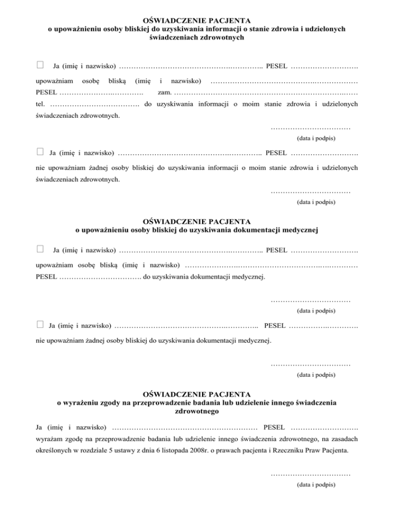 OŚWIADCZENIE PACJENTA o upoważnieniu osoby bliskiej do uzyskiwania informacji o stanie zdrowia i udzielonych świadczeniach zdrowotnych Ja (imię i nazwisko) ……………………………………….………….. PESEL ………………………. upoważniam osobę bliską (imię PESEL ………………….…………. i nazwisko) …………………………………….……………… zam. …………………………………………………………….…… tel. ………………………………. do uzyskiwania informacji o moim stanie zdrowia i udzielonych świadczeniach zdrowotnych. …………………………… (data i podpis) Ja (imię i nazwisko) ……………………………………….………….. PESEL ………………………. nie upoważniam żadnej osoby bliskiej do uzyskiwania informacji o moim stanie zdrowia i udzielonych świadczeniach zdrowotnych. …………………………… (data i podpis) OŚWIADCZENIE PACJENTA o upoważnieniu osoby bliskiej do uzyskiwania dokumentacji medycznej Ja (imię i nazwisko) ……………………………………….………….. PESEL ………………………. upoważniam osobę bliską (imię i nazwisko) ………………….…………………………….….………… PESEL ……………………………. do uzyskiwania dokumentacji medycznej. …………………………… (data i podpis) Ja (imię i nazwisko) ……………………………………….………….. PESEL …………….…………. nie upoważniam żadnej osoby bliskiej do uzyskiwania dokumentacji medycznej. …………………………… (data i podpis) OŚWIADCZENIE PACJENTA o wyrażeniu zgody na przeprowadzenie badania lub udzielenie innego świadczenia zdrowotnego Ja (imię i nazwisko) …………………………………………………… PESEL ………………………. wyrażam zgodę na przeprowadzenie badania lub udzielenie innego świadczenia zdrowotnego, na zasadach określonych w rozdziale 5 ustawy z dnia 6 listopada 2008r. o prawach pacjenta i Rzeczniku Praw Pacjenta. …………………………… (data i podpis)