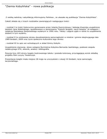 Gmina Kobylin "Ziemia Kobylińska" - nowa publikacja Z wielką radością i satysfakcją informujemy Państwa , że ukazała się publikacja "Ziemia Kobylińska". Całość składa się z trzech rozdziałów zawierających następujące treści: - rozdział I to treści historyczne opracowane przez Jolantę Dworzczkową i Jadwigę Kiwerską uzupełnione tekstem Jana Waleńskiego, opublikowane w opracowaniu "Kobylin – zarys dziejów" ze wstępem i redakcją Stanisława Sierpowskiego wydanym w 1990 roku. Teksty i zdjęcia ujęte w ramki to uzupełnienia dodane w tym wydaniu. - rozdział II to omówienie okresu dwudziestolecia samorządności w mieście i gminie obejmującego lata 1989 – 2009 oraz życie społeczno-kulturalne tego okresu - rozdział III to opis wsi wchodzących w skład Gminy Kobylin . Uzupełnienie stanowią: słowo wstępne Burmistrza Kobylina Bernarda Jasińskiego, posłowie zespołu redakcyjnego KTK, słownik, aneksy i bibliografia. Pozycja liczy 403 strony bogato ilustrowanego tekstu i posiada kolorową, przyciągającą wzrok okładkę projektu Pani Lucyny Teodorczyk. Prezentacja książki miała miejsce 28 maja na uroczystości z okazji XX – lecia samorządu terytorialnego. http://www.kobylin.pl Kreator PDF Utworzono 7 March, 2017, 20:47