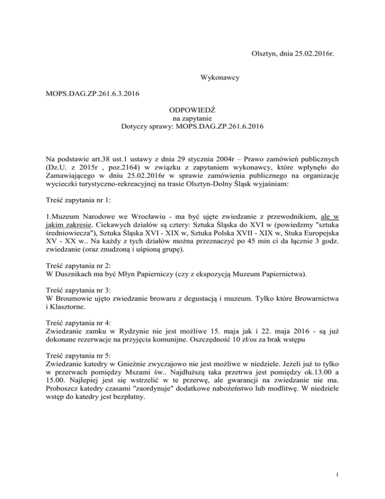 Olsztyn, dnia 25.02.2016r. Wykonawcy MOPS.DAG.ZP.261.6.3.2016 ODPOWIEDŹ na zapytanie Dotyczy sprawy: MOPS.DAG.ZP.261.6.2016 Na podstawie art.38 ust.1 ustawy z dnia 29 stycznia 2004r – Prawo zamówień publicznych (Dz.U. z 2015r , poz.2164) w związku z zapytaniem wykonawcy, które wpłynęło do Zamawiającego w dniu 25.02.2016r w sprawie zamówienia publicznego na organizację wycieczki turystyczno-rekreacyjnej na trasie Olsztyn-Dolny Śląsk wyjaśniam: Treść zapytania nr 1: 1.Muzeum Narodowe we Wrocławiu - ma być ujęte zwiedzanie z przewodnikiem, ale w jakim zakresie. Ciekawych działów są cztery: Sztuka Śląska do XVI w (powiedzmy "sztuka średniowiecza"), Sztuka Śląska XVI - XIX w, Sztuka Polska XVII - XIX w, Stuka Europejska XV - XX w.. Na każdy z tych działów można przeznaczyć po 45 min ci da łącznie 3 godz. zwiedzanie (oraz znudzoną i uśpioną grupę). Treść zapytania nr 2: W Dusznikach ma być Młyn Papierniczy (czy z ekspozycją Muzeum Papiernictwa). Treść zapytania nr 3: W Broumowie ujęto zwiedzanie browaru z degustacją i muzeum. Tylko które Browarnictwa i Klasztorne. Treść zapytania nr 4: Zwiedzanie zamku w Rydzynie nie jest możliwe 15. maja jak i 22. maja 2016 - są już dokonane rezerwacje na przyjęcia komunijne. Oszczędność 10 zł/os za brak wstępu Treść zapytania nr 5: Zwiedzanie katedry w Gnieźnie zwyczajowo nie jest możliwe w niedziele. Jeżeli już to tylko w przerwach pomiędzy Mszami św.. Najdłuższą taka przetrwa jest pomiędzy ok.13.00 a 15.00. Najlepiej jest się wstrzelić w te przerwę, ale gwarancji na zwiedzanie nie ma. Proboszcz katedry czasami "zaordynuje" dodatkowe nabożeństwo lub modlitwę. W niedziele wstęp do katedry jest bezpłatny. 1 Wyjaśniam odnośnie pytania nr 1: Zamawiający przewiduje zwiedzanie Muzeum Narodowego z przewodnikiem wszystkich działów. Przewidywany czas zwiedzania wszystkich działów to ok.1 godziny czasu. Wyjaśniam odnośnie pytania nr 2: Zamawiający w trakcie realizacji programu przewiduje zwiedzanie z zewnątrz Muzeum Papiernictwa bez biletów wstępu oraz przewodnika. Wyjaśniam odnośnie pytania nr 3: Zamawiający przewiduje zwiedzanie Muzeum Browarnictwa. Wyjaśniam odnośnie pytania nr 4: W przypadku braku możliwości zwiedzenia zamku w Rydzynie wewnątrz Zamawiający przewiduje zwiedzanie zamku od strony dziedzińca i ogrodu z przewodnikiem. Wyjaśniam odnośnie pytania nr 5: Zamawiający przewiduje zwiedzanie katedry w Gnieźnie z przewodnikiem w przypadku braku możliwości zwiedzenia katedry wewnątrz Zamawiający przewiduje zwiedzenie katedry z przewodnikiem zewnątrz. Jednocześnie Zamawiający zakłada, iż Wykonawcy dołożą wszelkich starań aby zwiedzenie katedry wewnątrz było możliwe. Uwagi: Ujęcie oglądania Fontanny Multimedialnej za dnia mija się z sensem. Urok największy po zmroku. Tutaj jest pewien problem. Zachód słońca w ok.20. maja przypada na okolice 20,30. Zmrok jeszcze później - czyli ok. 21,00, jako że Wrocław leży na zachodzie będzie jeszcze o jakieś 15 min. później. Uwzględniając to wszystko najlepiej jest udać się na przedstawienie na 22,00, ale o godz. 23.00 kierowca powinien zakończyć jazdę i zaparkować wóz, by po 9 godz. postoju dnia kolejnego nim ruszyć dalej, a trzeba w czas bo program do realizacji bogaty. Można by to zrobić korzystając z komunikacji zbiorowej tj. tramwaj. Odnośnik do uwagi Fontanny Multimedialnej: Zamawiający przewiduje zwiedzanie fontanny multimedialnej. Jeżeli największy urok omawianej fontanny jest w po zmroku wg Zamawiającego nic nie stoi na przeszkodzie aby zmienić kolejność zwiedzania i ten element zwiedzania w 1 dniu zobaczyć o omawianej porze nawet korzystając z komunikacji zbiorowej tj. tramwaju. Zamawiający zakłada, iż Wykonawcy dołożą wszelkich starań aby organizacyjnie było to możliwe. Do pozostałych uwag Wykonawcy Zamawiający nie odniósł się uznając je jako bezprzedmiotowe. W oryginale podpisał Dyrektor-Elżbieta Skaskiewicz 2