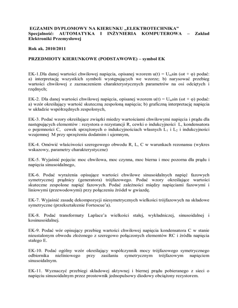 EGZAMIN DYPLOMOWY NA KIERUNKU „ELEKTROTECHNIKA” Specjalność: AUTOMATYKA I INŻYNIERIA KOMPUTEROWA Elektroniki Przemysłowej – Zakład Rok ak. 2010/2011 PRZEDMIOTY KIERUNKOWE (PODSTAWOWE) – symbol EK EK-1.Dla danej wartości chwilowej napięcia, opisanej wzorem u(t) = Umsin (ωt + φ) podać: a) interpretację wszystkich symboli występujących we wzorze; b) narysować przebieg wartości chwilowej z zaznaczeniem charakterystycznych parametrów na osi odciętych i rzędnych; EK-2. Dla danej wartości chwilowej napięcia, opisanej wzorem u(t) = Umsin (ωt + φ) podać: a) wzór określający wartość skuteczną zespoloną napięcia; b) graficzną interpretację napięcia w układzie współrzędnych zespolonych, EK-3. Podać wzory określające związki miedzy wartościami chwilowymi napięcia i prądu dla następujących elementów : rezystora o rezystancji R, cewki o indukcyjności L, kondensatora o pojemności C, cewek sprzężonych o indukcyjnościach własnych L1 i L2 i indukcyjności wzajemnej M przy sprzężeniu dodatnim i ujemnym, EK-4. Omówić właściwości szeregowego obwodu R, L, C w warunkach rezonansu (wykres wskazowy, parametry charakterystyczne) EK-5. Wyjaśnić pojęcia: moc chwilowa, moc czynna, moc bierna i moc pozorna dla prądu i napięcia sinusoidalnego, EK-6. Podać wyrażenia opisujące wartości chwilowe sinusoidalnych napięć fazowych symetrycznej prądnicy (generatora) trójfazowego. Podać wzory określające wartości skuteczne zespolone napięć fazowych. Podać zależności między napięciami fazowymi i liniowymi (przewodowymi) przy połączeniu źródeł w gwiazdę. EK-7. Wyjaśnić zasadę dekompozycji niesymetrycznych wielkości trójfazowych na składowe symetryczne (przekształcenie Fortescue’a). EK-8. Podać transformaty Laplace’a wielkości stałej, wykładniczej, sinusoidalnej i kosinusoidalnej. EK-9. Podać wór opisujący przebieg wartości chwilowej napięcia kondensatora C w stanie nieustalonym obwodu złożonego z szeregowo połączonych elementów RC i źródła napięcia stałego E. EK-10. Podać ogólny wzór określający współczynnik mocy trójfazowego symetrycznego odbiornika nieliniowego przy zasilaniu symetrycznym trójfazowym napięciem sinusoidalnym. EK-11. Wyznaczyć przebiegi składowej aktywnej i biernej prądu pobieranego z sieci o napięciu sinusoidalnym przez prostownik jednopulsowy diodowy obciążony rezystorem. EK-12. Podać wzór definiujący moc czynną. EK-13. Wyjaśnić zjawisko naskórkowości magnetycznej. EK-14. Podać wzory określające energię zgromadzoną w kondensatorze i dławiku. EK-15. Omówić wskaźniki jakości napięcia sieci elektroenergetycznej. EK-16. Wyjaśnić pojęcia składowych subharmonicznych i interharmonicznych. EK-17. Omówić przyczyny występowania wyższych harmonicznych prądów w sieciach czteroprzewodowych i wynikające stąd skutki. EK-18. Podać definicje wskaźników opisujących niesymetrię napięcia sieci trójfazowej. EK-19. Wyjaśnić znaczenie pojęć: aproksymacja, interpolacja, ekstrapolacja. EK-20. Podać schemat regulatora PI zrealizowanego przy użyciu wzmacniacza operacyjnego i odpowiednich elementów RC. Wyjaśnić zależność między parametrami regulatora a wartościami rezystancji i pojemności użytych elementów. EK-21. Jakie właściwości mają rdzenie ferrytowe? EK-22. Wymienić nazwy i podać przykłady zastosowań rezystorów półprzewodnikowych wykazujących zmiany rezystancji w funkcji różnych wielkości fizycznych takich jak np. temperatura, natężenie światła itp. EK-23. Narysować schemat i omówić właściwości prostego filtru dolnoprzepustowego R-C. EK-24. Wyprowadzić warunki wzbudzenia drgań sinusoidalnych w układzie elektronicznym z dodatnim sprzężeniem zwrotnym. EK-25. Wyjaśnić na przykładzie kompensacyjnego stabilizatora szeregowego i zasilacza impulsowego napięcia stałego (przekształtnik obniżający napięcie stałe), dlaczego sprawności energetyczne układów elektronicznych pracujących impulsowo są znacznie wyższe od sprawności układów pracujących w sposób ciągły? EK-26. Podać przykładowe charakterystyki wyjściowe i wejściowe oraz omówić podstawowe parametry dynamiczne tranzystora bipolarnego. EK-27. Podać przykładowe charakterystyki wyjściowe i bramkowe tranzystora polowego. EK-28.Podać przykładową charakterystykę prądu anody od napięcia katoda – anoda i omówić stany pracy tyrystora. EK-29. Wyjaśnić dlaczego we wzmacniacze operacyjne powinny charakteryzować się jak największym wzmocnieniem napięciowego sygnału różnicowego? EK-30. Podać wzór określający transmitancję operatorową i wyznaczyć odpowiedź na skok jednostkowy regulatora PI. EK-31. Podać wzór opisujący transmitancję operatorową członu inercyjnego pierwszego rzędu z opóźnieniem i narysować odpowiedź na skok jednostkowy takiego członu. EK-32. Omówić właściwości pierwiastków stosowanych jako domieszki donorowe i akceptorowe w krzemowych przyrządach półprzewodnikowych mocy. Podać przykłady takich pierwiastków oraz typowe wartości koncentracji ich atomów w warstwach typu P i N. EK-33. Wymienić właściwości pierwiastków stosowanych jako domieszki donorowe i akceptorowe w krzemowych przyrządach półprzewodnikowych mocy. Podać przykłady takich pierwiastków oraz typowe wartości koncentracji ich atomów w warstwach typu P i N. EK-34. Omówić podział materiałów pod względem właściwości magnetycznych. EK-35. Podać definicje przenikalności magnetycznej bezwzględnej i względnej materiału? EK-36. Podać wzór i wykreślić przebieg wartości chwilowej strumienia magnetycznego w rdzeniu transformatora z uzwojeniem pierwotnym podłączonym do źródła napięcia przemiennego o przebiegu prostokątnym. EK-37. Omówić charakterystyki momentu i prądu stojana w funkcji prędkości kątowej maszyny indukcyjnej zasilanej z sieci prądu przemiennego EK-38. Omówić budowę i dzi