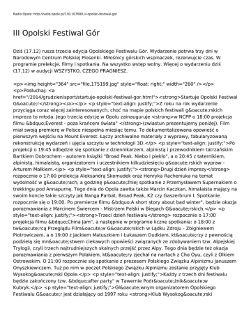 Radio Opole: http://radio.opole.pl/130,107680,iii-opolski-festiwal-gor III Opolski Festiwal Gór Dziś (17.12) rusza trzecia edycja Opolskiego Festiwalu Gór. Wydarzenie potrwa trzy dni w Narodowym Centrum Polskiej Piosenki. Miłośnicy górskich wspinaczek, rezerwujcie czas. W programie prelekcje, filmy i spotkania. Na wszystko wstęp wolny. Więcej o wydarzeniu dziś (17.12) w audycji WSZYSTKO, CZEGO PRAGNIESZ. <p><img height="364" src="file,175199.jpg" style="float: right;" width="260" /></p> <p>Posłuchaj: <a href="/2014/grudzien/sport/startuje-opolski-festiwal-gor.html"><strong>Startuje Opolski Festiwal Gór</strong></a></p> <p style="text-align: justify;">Z roku na rok wydarzenie przyciąga coraz więcej zainteresowanych, choć na mapie polskich festiwali górskich impreza to młoda. Jego trzecią edycję w Opolu zainauguruje <strong>w NCPP o 18:00 projekcja filmu „Everest - poza krańcem świata" </strong>(zwiastun prezentujemy poniżej). Film miał swoją premierę w Polsce niespełna miesiąc temu. To dokumentalizowana opowieść o pierwszym wejściu na Mount Everest. Łączy archiwalne materiały z wyprawy, fabularyzowaną rekonstrukcję wydarzeń i ujęcia szczytu w technologii 3D.</p> <p style="text-align: justify;">Po projekcji o 19:45 odbędzie się spotkanie z dziennikarzem, alpinistą i przewodnikiem tatrzańskim Bartkiem Dobrochem - autorem książki "Broad Peak. Niebo i piekło", a o 20:45 z taternikiem, alpinistą, himalaistą, organizatorem i uczestnikiem kilkudziesięciu górskich wypraw Arturem Małkiem.</p> <p style="text-align: justify;"><strong>Drugi dzień imprezy</strong> rozpocznie o 17:00 prelekcja Aleksandrą Skomudek oraz Henryka Racheniuka na temat wydolność w górach, a godzinę później spotkanie z Przemysławem Supernakiem o trekkingu pod Annapurnę. Tego dnia do Opola zawita także Marcin Kaczkan, himalaista mający na swoim koncie takie szczyty jak Nanga Parbat, Broad Peak, K2 czy Gaszerbrum I. Spotkanie rozpocznie się o 19:00. Po premierze filmu „A short story about bad winter", będzie okazja porozmawiania z Marcinem Świercem - Mistrzem Polski w Biegach Górskich.</p> <p style="text-align: justify;"><strong>Trzeci dzień festiwalu</strong> rozpocznie o 17:00 projekcja filmu „China Jam", a następnie w programie liczne spotkania: o 18:00 z twórcą Przeglądu Filmów Górskich w Lądku Zdroju - Zbigniewem Piotrowiczem, a o 19:00 z Jackiem Matuszkiem i Łukaszem Dudkiem, którzy z pewnością podzielą się mnóstwem ciekawych opowieści związanych ze zdobywaniem tzw. Alpejskiej Trylogii, czyli trzech najtrudniejszych skalnych przejść przez Alpy. Tego dnia będzie też okazja porozmawiania z pierwszym Polakiem, który zjechał na nartach z Cho Oyu, czyli z Olkiem Ostrowskim. O 21:00 rozpocznie się spotkanie z prezesem Polskiego Związku Alpinizmu Januszem Onyszkiewiczem. Tuż po nim w poczet Polskiego Związku Alpinizmu zostanie przyjęty Klub Wysokogórski Opole.</p> <p style="text-align: justify;">Każdy z trzech dni festiwalu będzie zakończony tzw. „after party" w Tawernie Podróżników Kubryk.</p> <p style="text-align: justify;">Głównym organizatorem Opolskiego Festiwalu Gór jest działający od 1997 roku <strong>Klub Wysokogórski Opole</strong>. Radio Opole objęło wydarzenie patronatem medialnym.</p> <p>Oprac. Agnieszka Lubczańska<br /><a href="mailto:[email protected]">[email protected]</a>< /p> <p style="text-align: center;"><strong>Program III Opolskiego Festiwalu Gór</strong>:</p> <p><strong>ŚRODA 17 grudnia </strong><br /><strong> </strong></p> <p><strong>18:00</strong> Uroczyste otwarcie festiwalu<br /><strong>18:10</strong> Premiera filmu „Everest - poza krańcem świata"<br /><strong>19:45</strong> Spotkanie z Bartkiem Dobrochem - autorem książki "Broad Peak. Niebo i piekło"<br /><strong>20:45</strong> Spotkanie z z Arturem Małkiem<br /><strong>22:00 </strong>After party w Kubryku</p> <p><strong>CZWARTEK 17 grudnia</strong></p> <p><strong>17:00</strong> Spotkanie z Aleksandrą Skomudek oraz Henrykiem Racheniukiem - wydolność w górach<br /><strong>18:00</strong> Spotkanie z Przemysławem Supernakiem o trekkingu pod Annapurnę<br /><strong>19:00</strong> Spotkanie z Marcinem Kaczkanem - himalaistą <br /><strong>20:00</strong> Premiera filmu „A short story about bad winter"<br /><strong>21:00</strong> Spotkanie z Marcinem Świercem - Mistrzem Polski w Biegach Górskich<br /><strong>22:00</strong> After party w Kubryku</p> <p><strong>PIĄTEK 19 grudnia</strong></p> <p style="text-align: justify;"><strong>17:00</strong> Projekcja filmu „China Jam"<br /><strong>18:00</strong> Spotkanie ze Zbigniewem Piotrowiczem - twórcą Przeglądu Filmów Górskich w Lądku Zdroju<br /><strong>19:00</strong> Spotkanie z Jackiem Matuszkiem i Łukaszem Dudkiem - Alpejska Trylogia<br /><strong>20:00</strong> Spotkanie z Olkiem Ostrowskim - pierwszym Polakiem, który zjechał na nartach z Cho Oyu<br /><strong>21:00</strong> Spotkanie z Januszem Onyszkiewiczem oraz przyjęcie KW Opole w poczet Polskiego Związku Alpinizmu<br /><strong>22:00</strong> Zakończenie festiwalu<br /><strong>22:00</strong> After party w Kubryku</p> <p><iframe frameborder="0" height="315" src="http://www.youtube.com/embed/Imd3WVkRTJk" width="560"></iframe></p>