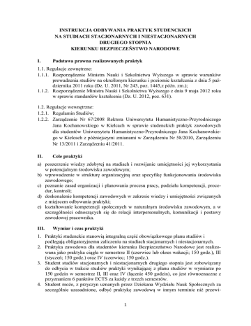 INSTRUKCJA ODBYWANIA PRAKTYK STUDENCKICH NA STUDIACH STACJONARNYCH I NIESTACJONARNYCH DRUGIEGO STOPNIA KIERUNKU BEZPIECZEŃSTWO NARODOWE I. Podstawa prawna realizowanych praktyk 1.1. Regulacje zewnętrzne: 1.1.1. Rozporządzenie Ministra Nauki i Szkolnictwa Wyższego w sprawie warunków prowadzenia studiów na określonym kierunku i poziomie kształcenia z dnia 5 października 2011 roku (Dz. U. 2011, Nr 243, poz. 1445,z późn. zm.); 1.1.2. Rozporządzenie Ministra Nauki i Szkolnictwa Wyższego z dnia 9 maja 2012 roku w sprawie standardów kształcenia (Dz. U. 2012, poz. 631). 1.2. Regulacje wewnętrzne: 1.2.1. Regulamin Studiów; 1.2.2. Zarządzenie Nr 67/2008 Rektora Uniwersytetu Humanistyczno-Przyrodniczego Jana Kochanowskiego w Kielcach w sprawie studenckich praktyk zawodowych dla studentów Uniwersytetu Humanistyczno-Przyrodniczego Jana Kochanowskiego w Kielcach z późniejszymi zmianami w Zarządzeniu Nr 58/2010, Zarządzeniu Nr 13/2011 i Zarządzeniu 41/2011. II. Cele praktyki a) poszerzenie wiedzy zdobytej na studiach i rozwijanie umiejętności jej wykorzystania w potencjalnym środowisku zawodowym; b) wprowadzenie w strukturę organizacyjną oraz specyfikę funkcjonowania środowiska zawodowego; c) poznanie zasad organizacji i planowania procesu pracy, podziału kompetencji, procedur, kontroli; d) doskonalenie kompetencji zawodowych w zakresie wiedzy i umiejętności związanych z miejscem odbywania praktyki; e) kształtowanie kompetencji społecznych w naturalnym środowisku zawodowym, a w szczególności odnoszących się do relacji interpersonalnych, komunikacji i postawy zawodowej pracownika. III. Wymiar i czas praktyki 1. Praktyki studenckie stanowią integralną część obowiązkowego planu studiów i podlegają obligatoryjnemu zaliczeniu na studiach stacjonarnych i niestacjonarnych. 2. Praktyka zawodowa dla studentów kierunku Bezpieczeństwo Narodowe jest realizowana jako praktyka ciągła w semestrze II (czerwiec lub okres wakacji; 150 godz.), III (styczeń; 150 godz.) oraz IV (czerwiec; 150 godz.). 3. Student studiów stacjonarnych i niestacjonarnych drugiego stopnia jest zobowiązany do odbycia w trakcie studiów praktyki wynikającej z planu studiów w wymiarze po 150 godzin w semestrze II, III oraz IV (łącznie 450 godzin), co jest równoznaczne z przyznaniem 6 punktów ECTS za każdy z trzech semestrów. 4. Student może, z przyczyn uznanych przez Dziekana Wydziału Nauk Społecznych za szczególnie uzasadnione, odbyć praktykę zawodową w innym terminie niż przewi1 dziany w planie studiów i programie nauczania, nie później jednak niż do końca następnego semestru. 5. Odbycie praktyk we wcześniejszym lub późniejszym terminie wymaga zgody Dziekana Wydziału Nauk Społecznych, po uzyskaniu opinii instytutowego opiekuna praktyk. Dziekan, po zaopiniowaniu wniosku studenta, wyraża zgodę na odbycie praktyki zawodowej w terminie innym niż wynika to z planu studiów, pod warunkiem, że odbywanie praktyki zawodowej nie będzie kolidowało z wypełnieniem przez studenta obowiązków wynikających z odbywania studiów. IV. Skierowanie na praktykę 1. Student występuje z wnioskiem o skierowanie na praktykę do wskazanej przez niego jednostki organizacyjnej, z zastrzeżeniem pkt 2. Wniosek musi zawierać deklarację przyjęcia na praktykę, wyrażoną przez osobę upoważnioną do składania oświadczeń woli w imieniu jednostki organizacyjnej w tym przedmiocie. Wybór jednostki organizacyjnej przyjmującej na praktykę akceptuje opiekun praktyk, składając podpis na wniosku. W przypadku wątpliwości co do charakteru wybranej jednostki (w szczególności czy odbyta w niej praktyka osiągnie właściwy cel), opiekun praktyk występuje o ustosunkowanie się do Kierownika Katedry Bezpieczeństwa Narodowego. 2. Praktyki studenckie na kierunku Bezpieczeństwo Narodowe mogą być odbywane w szczególności w następujących instytucjach: a) służby rządowe i samorządowe powołane do ochrony ładu i porządku publicznego; b) jednostki i struktury Wojska Polskiego; c) organy administracji rządowej i samorządowej zajmujące się ochroną ludności podmiotów gospodarczych, zarządzaniem kryzysowym, sprawami obronnymi, przedsiębiorstwa, firmy i instytucje, w których istnieje możliwość wyodrębnienia komórek odpowiedzialnych za planowanie i kierowanie w sytuacjach zagrożenia; d) inne organizacje, placówki czy zakłady pracy, których profil działania jest zbliżony do zakresu kierunku studiów. 3. Po uzyskaniu akceptacji opiekuna praktyk student składa wniosek w jednostce organizacyjnej Uczelni wyznaczonej do organizowania praktyk (zwanej dalej właściwą jednostką organizacyjną Uczelni), w celu zawarcia stosownej umowy pomiędzy Uczelnią a jednostką organizacyjną przyjmującą na praktykę. 4. Po podpisaniu umowy jednostka organizacyjna przyjmuje studenta na praktykę na podstawie skierowania (porozumienia) wydanego przez Uczelnię. V. Przebieg, ocena i zaliczenie praktyk 1. Studenci pozostają pod opieką nauczyciela akademickiego będącego opiekunem praktyk, który nadzoruje odbywanie praktyk oraz ocenia ich przebieg, udzielając zaliczenia poprzez wpis w indeksie oraz karcie egzaminacyjnej. 2. Opiekun praktyk, jako przedstawiciel Uczelni, jest przełożonym studentów odbywających praktykę. Opiekun odpowiada za realizację praktyki zgodnie z jej celami. Jest upoważniony do rozstrzygania wspólnie z kierownictwem jednostki organizacyjnej przyjmującej sprawy związane z przebiegiem praktyki. 3. Praktyki odbywają się w sposób ciągły. Termin może zostać przesunięty bez powiadomienia opiekuna praktyk najwyżej o 2 dni robocze. Dni usprawiedliwionej nieobecności w terminie praktyk mogą zostać uzupełnione w innym terminie uzgodnionym z jednostką organizacyjną przyjmującą oraz z opiekunem praktyk. Zaświadczenie lekar2 skie winno zostać przedłożone w jednostce organizacyjnej przyjmującej oraz opiekunowi praktyk najpóźniej w dr