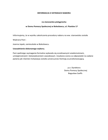INFORMACJA O WYNIKACH NABORU na stanowisko pielęgniarka w Domu Pomocy Społecznej w Bolesławcu, ul. Piastów 17 Informujemy, że w wyniku zakończenia procedury naboru na ww. stanowisko została Wybrana Pani : Joanna Jopek, zamieszkała w Bolesławcu. Uzasadnienie dokonanego wyboru; Pani spełniając wymagania formalne wykazała się oczekiwanymi wiadomościami, umiejętnościami i doświadczeniem zawodowym. Uzyskana ocena za odpowiedzi na zadane pytania jak również motywacja została uznana przez Komisję za przekonywującą. p.o. Dyrektora Domu Pomocy Społecznej Bogusław Szeffs