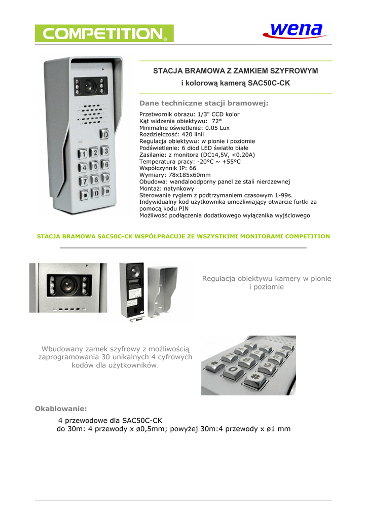 STACJA BRAMOWA Z ZAMKIEM SZYFROWYM i kolorową kamerą SAC50C-CK Dane techniczne stacji bramowej: Przetwornik obrazu: 1/3" CCD kolor Kąt widzenia obiektywu: 72° Minimalne oświetlenie: 0.05 Lux Rozdzielczość: 420 linii Regulacja obiektywu: w pionie i poziomie Podświetlenie: 6 diod LED światło białe Zasilanie: z monitora (DC14,5V, <0.20A) Temperatura pracy: -20°C ~ +55°C Współczynnik IP: 66 Wymiary: 78x185x60mm Obudowa: wandaloodporny panel ze stali nierdzewnej Montaż: natynkowy Sterowanie ryglem z podtrzymaniem czasowym 1-99s. Indywidualny kod użytkownika umożliwiający otwarcie furtki za pomocą kodu PIN Możliwość podłączenia dodatkowego wyłącznika wyjściowego STACJA BRAMOWA SAC50C-CK WSPÓŁPRACUJE ZE WSZYSTKIMI MONITORAMI COMPETITION Regulacja obiektywu kamery w pionie i poziomie Wbudowany zamek szyfrowy z możliwością zaprogramowania 30 unikalnych 4 cyfrowych kodów dla użytkowników. Okablowanie: 4 przewodowe dla SAC50C-CK do 30m: 4 przewody x ø0,5mm; powyżej 30m:4 przewody x ø1 mm Opis i schemat podłączenia Montaż natynkowy na wysokości 150 – 170cd podłoża