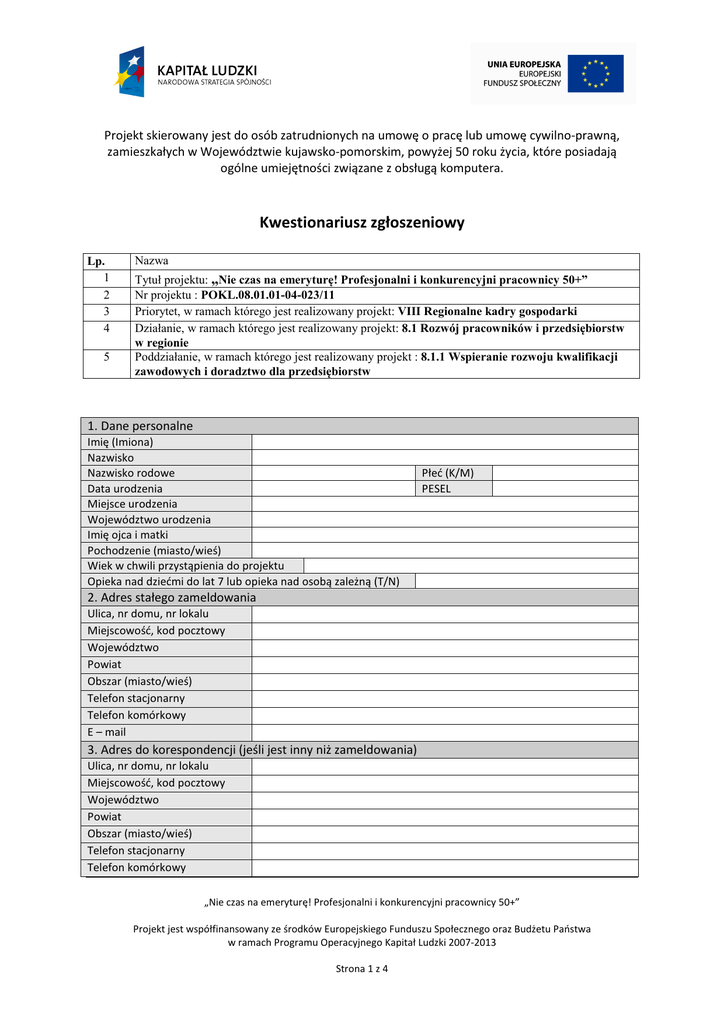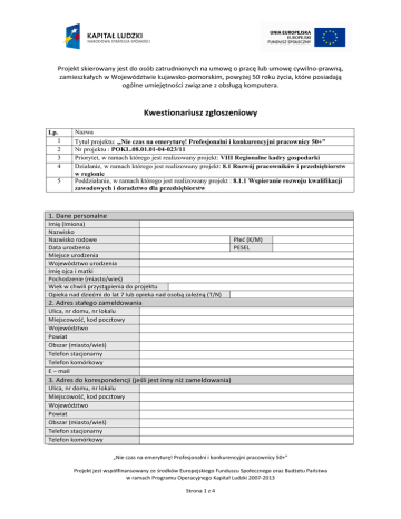 Projekt skierowany jest do osób zatrudnionych na umowę o pracę lub umowę cywilno-prawną, zamieszkałych w Województwie kujawsko-pomorskim, powyżej 50 roku życia, które posiadają ogólne umiejętności związane z obsługą komputera. Kwestionariusz zgłoszeniowy Lp. 1 2 3 4 5 Nazwa Tytuł projektu: „Nie czas na emeryturę! Profesjonalni i konkurencyjni pracownicy 50+” Nr projektu : POKL.08.01.01-04-023/11 Priorytet, w ramach którego jest realizowany projekt: VIII Regionalne kadry gospodarki Działanie, w ramach którego jest realizowany projekt: 8.1 Rozwój pracowników i przedsiębiorstw w regionie Poddziałanie, w ramach którego jest realizowany projekt : 8.1.1 Wspieranie rozwoju kwalifikacji zawodowych i doradztwo dla przedsiębiorstw 1. Dane personalne Imię (Imiona) Nazwisko Nazwisko rodowe Data urodzenia Miejsce urodzenia Województwo urodzenia Imię ojca i matki Pochodzenie (miasto/wieś) Wiek w chwili przystąpienia do projektu Opieka nad dziećmi do lat 7 lub opieka nad osobą zależną (T/N) Płeć (K/M) PESEL 2. Adres stałego zameldowania Ulica, nr domu, nr lokalu Miejscowość, kod pocztowy Województwo Powiat Obszar (miasto/wieś) Telefon stacjonarny Telefon komórkowy E – mail 3. Adres do korespondencji (jeśli jest inny niż zameldowania) Ulica, nr domu, nr lokalu Miejscowość, kod pocztowy Województwo Powiat Obszar (miasto/wieś) Telefon stacjonarny Telefon komórkowy „Nie czas na emeryturę! Profesjonalni i konkurencyjni pracownicy 50+” Projekt jest współfinansowany ze środków Europejskiego Funduszu Społecznego oraz Budżetu Państwa w ramach Programu Operacyjnego Kapitał Ludzki 2007-2013 Strona 1 z 4 E – mail 4. Wykształcenie i status Uczestnika Projektu na rynku pracy Wykształcenie: podstawowe, gimnazjalne i niższe ponadgimnazjalne pomaturalne wyższe Nazwa pracodawcy U obecnego pracodawcy jestem zatrudniony/na na umowę….(o pracę, umowę cywilno- prawną) 5. Wypełnia Instytucja Szkoleniowa Czy kandydat został zakwalifikowany do Projektu? (T/N) UWAGI: Data rozpoczęcia udziału w Projekcie (podpisania umowy) Data zakończenia udziału w Projekcie Czy uczestnik przerwał szkolenie przed końcem Projektu? (T/N) Powód: Czy uczestnik odebrał zaświadczenia? (T/N) Czy uczestnik otrzymał certyfikat TOEIC Bridge? (T/N) Potwierdzam prawdziwość powyższych danych osobowych ……..………………………………………………………………………………. (data, podpis) „Nie czas na emeryturę! Profesjonalni i konkurencyjni pracownicy 50+” Projekt jest współfinansowany ze środków Europejskiego Funduszu Społecznego oraz Budżetu Państwa w ramach Programu Operacyjnego Kapitał Ludzki 2007-2013 Strona 2 z 4 Oświadczenie o spełnieniu warunków udziału w Projekcie Świadomy/a odpowiedzialności karnej, grożącej mi za składanie nieprawdziwych oświadczeń na podstawie art. 297 Kodeksu Karnego, oświadczam, że spełniam wszystkie wymogi uczestnictwa w projekcie „Nie czas na emeryturę! Profesjonalni i konkurencyjni pracownicy 50+”, to znaczy: - jestem osobą pracującą, zatrudnioną w przedsiębiorstwie na podstawie umowy o pracę lub umowy cywilno – prawnej, - jestem osobą powyżej 50 roku życia, która posiada ogólne umiejętności związane z obsługą komputera (w tym aplikacji biurowych takich jak Word, Excel, Access, PowerPoint) ……………………………………… …………………………………….. (miejscowość, data) (czytelny podpis) Deklaracja uczestnictwa w Projekcie Niniejszym deklaruję przystąpienie do projektu „Nie czas na emeryturę! Profesjonalni i konkurencyjni pracownicy 50+”, i zobowiązuję się do podpisania umowy regulującej szczegółowo zasady udziału w Projekcie. Jednocześnie przyjmuję do wiadomości, że w przypadku niezakwalifikowania mnie do udziału w projekcie, podpisana przeze mnie umowa nie będzie wiążąca. ……………………………………… ……………………………………………………… (miejscowość, data) (czytelny podpis) „Nie czas na emeryturę! Profesjonalni i konkurencyjni pracownicy 50+” Projekt jest współfinansowany ze środków Europejskiego Funduszu Społecznego oraz Budżetu Państwa w ramach Programu Operacyjnego Kapitał Ludzki 2007-2013 Strona 3 z 4 Oświadczenie Oświadczam, iż zastałem/am poinformowany/na o tym, że projekt finansowany jest ze środków Unii Europejskiej w ramach Programu Operacyjnego Kapitał Ludzki. ………………………………………………….. …………………………………………… (miejscowość, data) (czytelny podpis) Oświadczenie Uczestnika Projektu o wyrażeniu zgody na przetwarzanie danych osobowych W związku z przystąpieniem do Projektu „„Nie czas na emeryturę! Profesjonalni i konkurencyjni pracownicy 50+”, realizowanego w ramach Programu Operacyjnego Kapitał Ludzki wyrażam zgodę na przetwarzanie moich danych osobowych. Oświadczam, iż przyjmuję do wiadomości, że: 1) moje dane osobowe będą przetwarzane wyłącznie w celu udzielenia wsparcia i obsługi Projektu; 2) moje dane osobowe mogą zostać udostępnione innym podmiotom w celu ewaluacji, jak również w celu realizacji zadań związanych z monitoringiem i sprawozdawczością w ramach Programu Operacyjnego Kapitał Ludzki; 3) podanie danych jest dobrowolne, aczkolwiek odmowa ich podania jest równoznaczna z brakiem możliwości udzielenia wsparcia w ramach Projektu; 4) mam prawo dostępu do treści swoich danych i ich poprawienia. ……………………………………… ……………………………………………… (miejscowość, data) (czytelny podpis) „Nie czas na emeryturę! Profesjonalni i konkurencyjni pracownicy 50+” Projekt jest współfinansowany ze środków Europejskiego Funduszu Społecznego oraz Budżetu Państwa w ramach Programu Operacyjnego Kapitał Ludzki 2007-2013 Strona 4 z 4