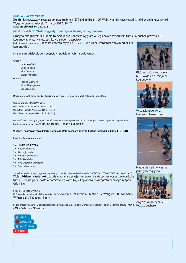 MOS WOLA Warszawa Źródło: http://www.moswola.pl/mos/aktualnosci/5383,Mlodziczki-MOS-Wola-wygraly-towarzyski-turniej-w-Legionowie.html Wygenerowano: Wtorek, 7 marca 2017, 20:47 Data publikacji 14.01.2013 Młodziczki MOS Wola wygrały towarzyski turniej w Legionowie Drużyna młodziczek MOS Wola trenera Jacka Banasika wygrała w Legionowie towarzyski turniej o puchar prezesa LTS Legionovia, w którym uczestniczyło siedem zespołów. Podopieczne trenera Jacka Banasika uczestniczyły 12.01.2013 w turnieju zorganizowanym przez Lts Legionowia . Brało w nim udział siedem zespołów, podzielonych na dwie grupy: Grupa A Umks Mos Wola Lts Legionowia Nike Ostrłęka Blok zespołu młodziczek MOS Wola na turnieju w Legionowie Sparta Warszawa Grupa B Rosario Lubowidz Wrzos Międzyborów Uks Esperanto Mecze w grupach grano każdy z każdym w nietypowej formule do dwóch setów do 15 punktów. Wyniki w gupie Umks Mos Wola: Umks Mos- Nike Ostrołęka ( 14-15 , 15-10 ) Umks Mos -Sparta Warszawa (15-8 , 15-4 ) W czasie przerwy z trenerem Banasikiem Umks Mos -Lts Legionowia (15-14 , 14-15 ) Po zakończeniu meczy w grupie zespół Umks Mos Wola uplasował się na pierwszym miejscu i zgodnie z regulaminem turnieju zagrał ze zwycięzcą grupy drugiej, Rosario Lubowidz. W meczu finałowym zawodniczki Umks Mos Wola pokonały drużynę Rosario Lubowidz 2-0 (15-13 , 15-10 ) Kolejność końcowa w turnieju : 1 m UMKS MOS WOLA 2m Rosario Lubowidz 3m Lts Legionowia 4m Wrzos Międzyborów 5m Nike Ostrołęka 6m Uks Esperanto Warszawa 7m Sparta Warszawa Na zakończenie turnieju orgnizatorzy wręczyli pamiątkowe medale i okazałe puchary . Zawodniczka Umks Mos Wola Adrianna Adamek została wybrana decyzją trenerów i działaczy najlepszą zawodniczką turnieju i w nagrodę dostała pamiątkową koszulkę 7 Legionowii z autografami całego zespołu Orlen Ligi. Nasze siatkarki w czasie przyjęcia zagrywki Skład zespołu MOS WOLA : M.Krajewska , A.Adamek , N.Kurpiewska , W.Bentkowska , W.Trzpioła , N.Mróz , M.Waligóra , D.Staniaszek, W.Antosiak , P.Skrzos - libero Po zakończonym turnieju zawodniczki trenerzy i rodzice uczestniczyli w meczu ekstraklasy kobiet Siódemka Legionowia - Mks Dąbrowa Górnicza . Zwycięska drużyna MOS Wola z pucharem Komentarz (0) dodaj komentarz Brak komentarzy dodaj komentarz