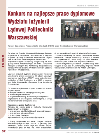 NASZE SPRAW Y Konkurs na najlepsze prace dyplomowe Wydziału Inżynierii Lądowej Politechniki Warszawskiej FORUM Paweł Szponder, Prezes Koła Młodych PZITB przy Politechnice Warszawskiej Od wielu lat Oddział Warszawski Polskiego Związku Inżynierów i Techników Budownictwa i Wydział Inżynierii Lądowej Politechniki Warszawskiej organizuje Konkurs na najlepsze prace dyplomowe. Wręczenie nagród zazwyczaj odbywa się na inauguracji Roku Akademickiego. W 2005 r. wręczenie nastąpiło w drugim dniu Konferencji zorganizowanej z okazji 90-lecia istnienia Wydziału Inżynierii Lądowej Politechniki Warszawskiej. dr inż. Anna Knauff, mgr inż. Wojciech Terlikowski. • Pracę inżynierską na temat „Aluminiowe fasady budynków, rodzaje konstrukcji nośnych i zasady ich projektowania”, autor pracy: inż. Artur Więckus. Promotor: prof. dr hab. inż. Wojciech Żółtowski. • Pracę magisterską na temat „Projekt wieży telewizyjnej o wys. 250 m”, autor pracy: mgr inż. Paweł Szczepaniak. Promotor: dr inż. Antoni Ostrołęcki. Laureaci otrzymali dyplomy oraz nagrody rzeczowe ufundowane przez sponsorów. W latach ubiegłych sponsorem była firma „ARUP”, która jest członkiem Institution of Civil Engineers, a w 2005 r. sponsorem była Mazowiecka Okręgowa Izba Inżynierów Budownictwa. Do konkursu zgłoszono 15 prac, poziom ich oceniono jako wysoki. Prace podzielono na następujące kategorie: • Konstrukcje Budowlane; • Inżynieria Produkcji Budowlanej i Zarządzania. Nagrodzono 6 prac nagrodą równorzędną, z uwagi na różnorodność tematyczną prac. Nagrodzone prace dyplomowe Komisja do oceny prac z Instytutu Konstrukcji Budowlanych w składzie: • prof. dr hab. inż. Michał Knauff, przewodniczący; • prof. dr hab. inż. Jerzy Pluta; • dr inż. Jerzy Pieniążek wytypowała do nagrody następujące prace: • Pracę magisterską na temat „Projekt budynku wielofunkcyjnego o wys. 185 m, z garażem podziemnym”, autor pracy: mgr inż. Paweł Ślązak. Promotorzy: prof. dr hab. inż. Józef Sieczkowski, 52 PRZEGLĄD BUDOWLANY 5/2006 N A S Z E S P R AWY • Pracę magisterską na temat „Symulacyjne wyznaczenie wielkości składowisk. Program komputerowy”, autor pracy: mgr inż. Michał Krzemiński. Promotor: prof. dr hab. inż. Kazimierz M. Jaworski. • Pracę magisterską na temat „Analiza projektów inwestycyjnych infrastruktury drogowej realizowanych w ramach partnerstwa publiczno-prywatnego”, autor pracy: mgr inż. Grzegorz Błaszczak. Promotor: dr inż. Andrzej Minasowicz. Przewodniczącą Komisji Konkursowej była dr inż. Elżbieta Szmigiera, Prodziekan ds. Studenckich, a Sekretarzem mgr inż. Mieczysław Kalinowski. FORUM Nagrody w sposób uroczysty wręczyli laureatom: dziekan Wydziału IL PW prof. dr hab. inż. Grzegorz Jemielita, przewodniczący Krajowej Izby Inżynierów Budownictwa prof. dr hab. inż. Z. Grabowski, przewodniczący Mazowieckiej Izby Inżynierów Budownictwa mgr inż. Wiesław Olechnowicz, przedstawiciel Oddziału Warszawskiego PZITB mgr inż. Mieczysław Wolski. Komisja do oceny prac opracowanych w Katedrze Inżynierii Materiałów Budowlanych i Katedrze Inżynierii Produkcji i Zarządzania w Budownictwie w składzie: • prof. dr hab. inż. Kazimierz M. Jaworski, przewodniczący; • prof. dr hab. inż. Jerzy Piłat; • dr inż. Andrzej Minasowicz nagrodziła następujące prace: • Pracę inżynierską na temat „Ocena możliwości uzyskania mrozoodpornych betonów z cementami zawierającymi dodatki mineralne”, autorka pracy: inż. Dorota Gałecka. Promotor: mgr inż. Anna Chuda. PRZEG L Ą D B U D O W L A N Y 5/2006 53