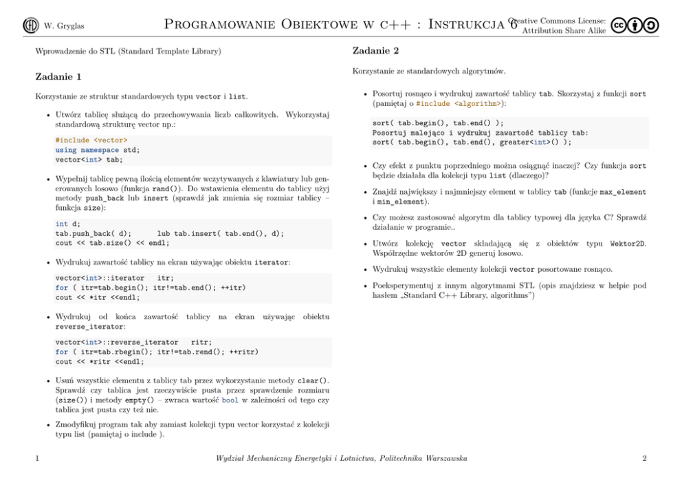 W. Gryglas Commons License: Programowanie Obiektowe w c++ : Instrukcja Creative 6 Attribution Share Alike Zadanie 2 Wprowadzenie do STL (Standard Template Library) Korzystanie ze standardowych algorytmów. Zadanie 1 Korzystanie ze struktur standardowych typu vector i list. • Utwórz tablicę służącą do przechowywania liczb całkowitych. Wykorzystaj standardową strukturę vector np.: #include <vector> using namespace std; vector<int> tab; • Wypełnij tablicę pewną ilością elementów wczytywanych z klawiatury lub generowanych losowo (funkcja rand()). Do wstawienia elementu do tablicy użyj metody push_back lub insert (sprawdź jak zmienia się rozmiar tablicy – funkcja size): int d; tab.push_back( d); lub tab.insert( tab.end(), d); cout << tab.size() << endl; tablicy na ekran • Czy efekt z punktu poprzedniego można osiągnąć inaczej? Czy funkcja sort będzie działała dla kolekcji typu list (dlaczego)? • Znajdź największy i najmniejszy element w tablicy tab (funkcje max_element i min_element). • Czy możesz zastosować algorytm dla tablicy typowej dla języka C? Sprawdź działanie w programie.. • Wydrukuj wszystkie elementy kolekcji vector posortowane rosnąco. vector<int>::iterator itr; for ( itr=tab.begin(); itr!=tab.end(); ++itr) cout << *itr <<endl; zawartość sort( tab.begin(), tab.end() ); Posortuj malejąco i wydrukuj zawartość tablicy tab: sort( tab.begin(), tab.end(), greater<int>() ); • Utwórz kolekcję vector składającą się z obiektów typu Wektor2D. Współrzędne wektorów 2D generuj losowo. • Wydrukuj zawartość tablicy na ekran używając obiektu iterator: • Wydrukuj od końca reverse_iterator: • Posortuj rosnąco i wydrukuj zawartość tablicy tab. Skorzystaj z funkcji sort (pamiętaj o #include <algorithm>): • Poeksperymentuj z innym algorytmami STL (opis znajdziesz w helpie pod hasłem „Standard C++ Library, algorithms”) używając obiektu vector<int>::reverse_iterator ritr; for ( itr=tab.rbegin(); itr!=tab.rend(); ++ritr) cout << *ritr <<endl; • Usuń wszystkie elementu z tablicy tab przez wykorzystanie metody clear(). Sprawdź czy tablica jest rzeczywiście pusta przez sprawdzenie rozmiaru (size()) i metody empty() – zwraca wartość bool w zależności od tego czy tablica jest pusta czy też nie. • Zmodyfikuj program tak aby zamiast kolekcji typu vector korzystać z kolekcji typu list (pamiętaj o include ). 1 Wydział Mechaniczny Energetyki i Lotnictwa, Politechnika Warszawska 2