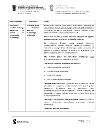 „NADZIEJA” CHARYTATYWNE STOWARZYSZENIE NIESIENIA POMOCY CHORYM UZALEśNIONYM OD ALKOHOLU Realizator projektu: ul. Abramowicka 2F, 20-442 Lublin tel./fax: 81 743 91 11 Projekt współfinansowany ze środków Unii Europejskiej w ramach Europejskiego Funduszu Społecznego Rodzaj wydatku Rozliczenie kosztów podróży / wydatków na paliwo do samochodu służbowego Dokument Umowy o pracę – Polecenie wyjazdu służbowego (delegacja) AKTYWNI NA RYNKU PRACY Uwagi Każdorazowo wyjazd samochodem służbowym powinien być uzasadniony merytorycznie a jego celowość potwierdzona w odniesieniu do zakresu działalności. Ponadto powinien znaleźć odzwierciedlenie w uzyskanych przychodach. Rozliczanie kosztów podróży powinno odbywać się zgodnie z regulaminem wewnętrznym spółdzielni socjalnej. Do rozliczenia delegacji należy załączać dokumenty potwierdzające wydatki związane z podróżą służbową, tj. rachunki za noclegi, bilety określonego środka transportu lub ewidencję przebiegu pojazdu, w sytuacji gdy pracownik odbył podróż służbową samochodem prywatnym. Aby rozliczyć paliwo dla samochodu służbowego (tylko w przypadku umów o pracę) należy posiadać: - ewidencję przebiegu pojazdu ze wskazaniem: • rodzaj samochodu (służbowy), • nr rejestracyjny samochodu, • pojemność silnika, • ilość przejechanych kilometrów, - oświadczenie zawierające rozliczenie zużycia paliwa na 100 km przedstawione w oparciu o indywidualne normy zużycia paliwa samochodu służbowego, wraz z wyliczeniem kwoty kwalifikowalnej (średnie zużycie paliwa na 100 km x ilość km) lub informację o zużyciu paliwa przez auto potwierdzone przez stację diagnostyczną, - fakturę na zakup paliwa wraz z dowodem zapłaty (na fakturze numer rejestracyjny samochodu, stanowiący własność spółdzielni). -polecenie wyjazdu służbowego. 1z1
