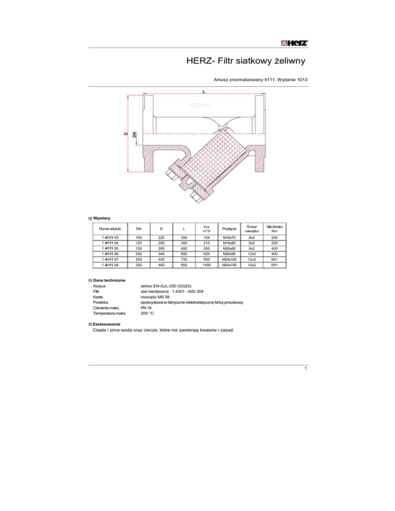 HERZ- Filtr siatkowy żeliwny Arkusz znormalizowany 4111, Wydanie 1013 Wymiary Numer artykułu DN D L kvs m3/h Przyłącze Śruba/ nakrętka Siła docisku Nm 1 4111 93 100 220 350 154 M16x75 8x2 205 1 4111 94 125 250 400 210 M16x80 8x2 205 1 4111 95 150 285 480 350 M20x80 8x2 400 1 4111 96 200 340 600 620 M20x90 12x2 400 1 4111 97 250 405 730 950 M24x100 12x2 691 1 4111 98 300 460 850 1400 M24x100 12x2 691 Dane techniczne Korpus Filtr Korek Powłoka Ciśnienie maks. Temperatura maks. żeliwo EN-GJL-250 (GG25) stal nierdzewna 1.4301 - AISI 304 mosiądz MS 58 epoksydowana fabrycznie elektrostatyczną farbą proszkową PN 16 200 °C Zastosowanie Ciepła i zima woda oraz ciecze, które nie zawierają kwasów i zasad. 1 Wymiary Numer artykułu DN A B C kvs 3 m /h Przyłącze Śruba/ nakrętka Siła docisku Nm 1 4111 83 1 4111 84 1 4111 85 1 4111 86 1 4111 87 1 4111 88 25 32 40 50 65 80 160 180 200 230 290 310 115 140 150 165 185 200 85 105 140 146 185 200 11 18 27 45 70 100 M12x55 M16x65 M16x65 M16x65 M16x65 M16x70 4x2 4x2 4x2 4x2 4x2 8x2 85 205 205 205 205 205 Dane techniczne Korpus Filtr Korek Ciśnienie maks. Temperatura maks. 2 żeliwo EN-GJL-250 stal nierdzewna, oczka 0,75 mm żeliwo EN-GJL-250 PN 16 120 °C