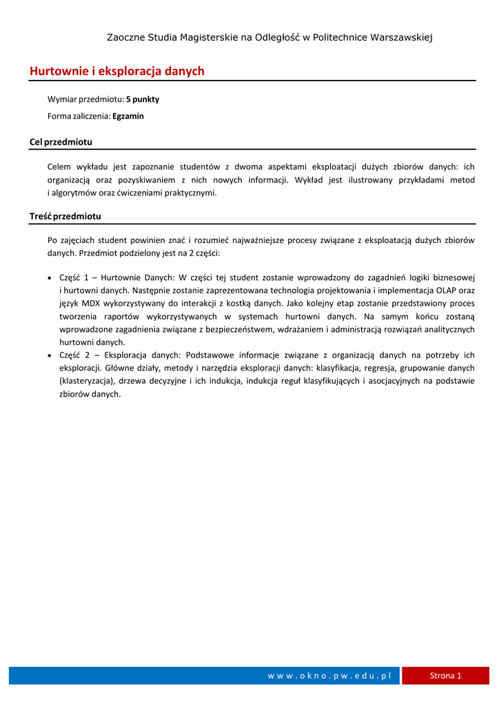 Zaoczne Studia Magisterskie na Odległość w Politechnice Warszawskiej Hurtownie i eksploracja danych Wymiar przedmiotu: 5 punkty Forma zaliczenia: Egzamin Cel przedmiotu Celem wykładu jest zapoznanie studentów z dwoma aspektami eksploatacji dużych zbiorów danych: ich organizacją oraz pozyskiwaniem z nich nowych informacji. Wykład jest ilustrowany przykładami metod i algorytmów oraz ćwiczeniami praktycznymi. Treść przedmiotu Po zajęciach student powinien znać i rozumieć najważniejsze procesy związane z eksploatacją dużych zbiorów danych. Przedmiot podzielony jest na 2 części: Część 1 – Hurtownie Danych: W części tej student zostanie wprowadzony do zagadnień logiki biznesowej i hurtowni danych. Następnie zostanie zaprezentowana technologia projektowania i implementacja OLAP oraz język MDX wykorzystywany do interakcji z kostką danych. Jako kolejny etap zostanie przedstawiony proces tworzenia raportów wykorzystywanych w systemach hurtowni danych. Na samym końcu zostaną wprowadzone zagadnienia związane z bezpieczeństwem, wdrażaniem i administracją rozwiązań analitycznych hurtowni danych. Część 2 – Eksploracja danych: Podstawowe informacje związane z organizacją danych na potrzeby ich eksploracji. Główne działy, metody i narzędzia eksploracji danych: klasyfikacja, regresja, grupowanie danych (klasteryzacja), drzewa decyzyjne i ich indukcja, indukcja reguł klasyfikujących i asocjacyjnych na podstawie zbiorów danych. www.okno.pw.edu.pl Strona 1