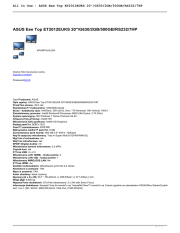 All In One : ASUS Eee Top ET2012EUKS 20"/G630/2GB/500GB/RS232/7HP ASUS Eee Top ET2012EUKS 20"/G630/2GB/500GB/RS232/7HP KPASPHLAL200 Ocena: Nie ma jeszcze oceny Zapytaj o produkt ProducentASUS Opis Producent: ASUS Opis ogólny: ASUS Eee Top ET2012EUKS 20"/G630/2GB/500GB/RS232/7HP Przek?tna ekranu: 20.0 cali Rozdzielczo?? maksymalna: 1600x900 pikseli Ekran - dodatkowy opis: AntiGlare, 250 cd/m2, 5ms, 170 Horizotal, 160 Vertical, 1000:1 Zainstalowany procesor: Intel® Pentium® Processor G630 (3M Cache, 2.70 GHz) System operacyjny: MS Windows 7 Home Premium 64-bit Chipset p?yty g?ównej: Intel® H61 Wbudowana karta graficzna: Intel® HD Graphics Rodzaj pami?ci: DDR3-1333 Pami?? zainstalowana: 2048 MB Maksymalna wielko?? pami?ci: 8 GB Zamontowany dysk twardy: 500 GB 3.5" SATA. 7200rpm Nap?d optyczny wbudowany: Tray-in Super Multi DVD-RW/RAM DL Wyj?cie s?uchawkowe: tak Wej?cie mikrofonowe: tak SPDIF (Digital Audio): nie Wbudowana kamera internetowa: 0,3 MPix Czytnik kart: tak Z??cza USB: 4 x 2.0 Wbudowany LAN 100Mb - liczba portów: 0 Wbudowany LAN 1Gb - liczba portów: 1 Wbudowany WIRELESS LAN: tak Z??cze HDMI: nie Dodatki multimedialne: Wbudowane g?o?niki 2.0 stereo Klawiatura w zestawie: TAK Mysz w zestawie: TAK Kolor obudowy: black (czarny) Wymiary [G x S x W]: 20,7 ~ 56,4(Grub.) x 496,6(Szer.) x 371,3(Wys.) mm Waga [kg]: 6.800 kg Wyposa?enie dodatkowe: G?o?niki wbudowane: 2 x 2W with Sonic Focus Informacje dodatkowe: Komplet ?rub do monta?u na ?cianieMo?liwo?? monta?u na ?cianie zgodnie ze standardem VESAOffice StarterCzytnik kart: 3-in-1 (SD, SDHC, MMC)WLAN-N, VGA-Out, COM (RS232) 1 / 1 Powered by TCPDF (www.tcpdf.org)