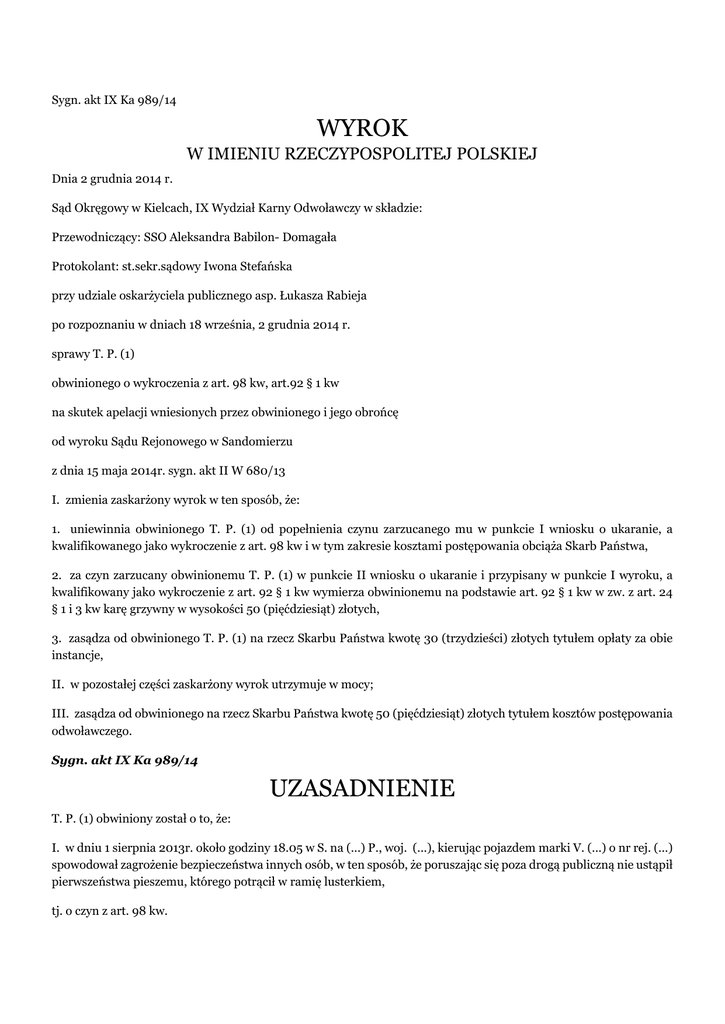 Sygn. akt IX Ka 989/14 WYROK W IMIENIU RZECZYPOSPOLITEJ POLSKIEJ Dnia 2 grudnia 2014 r. Sąd Okręgowy w Kielcach, IX Wydział Karny Odwoławczy w składzie: Przewodniczący: SSO Aleksandra Babilon- Domagała Protokolant: st.sekr.sądowy Iwona Stefańska przy udziale oskarżyciela publicznego asp. Łukasza Rabieja po rozpoznaniu w dniach 18 września, 2 grudnia 2014 r. sprawy T. P. (1) obwinionego o wykroczenia z art. 98 kw, art.92 § 1 kw na skutek apelacji wniesionych przez obwinionego i jego obrońcę od wyroku Sądu Rejonowego w Sandomierzu z dnia 15 maja 2014r. sygn. akt II W 680/13 I. zmienia zaskarżony wyrok w ten sposób, że: 1. uniewinnia obwinionego T. P. (1) od popełnienia czynu zarzucanego mu w punkcie I wniosku o ukaranie, a kwalifikowanego jako wykroczenie z art. 98 kw i w tym zakresie kosztami postępowania obciąża Skarb Państwa, 2. za czyn zarzucany obwinionemu T. P. (1) w punkcie II wniosku o ukaranie i przypisany w punkcie I wyroku, a kwalifikowany jako wykroczenie z art. 92 § 1 kw wymierza obwinionemu na podstawie art. 92 § 1 kw w zw. z art. 24 § 1 i 3 kw karę grzywny w wysokości 50 (pięćdziesiąt) złotych, 3. zasądza od obwinionego T. P. (1) na rzecz Skarbu Państwa kwotę 30 (trzydzieści) złotych tytułem opłaty za obie instancje, II. w pozostałej części zaskarżony wyrok utrzymuje w mocy; III. zasądza od obwinionego na rzecz Skarbu Państwa kwotę 50 (pięćdziesiąt) złotych tytułem kosztów postępowania odwoławczego. Sygn. akt IX Ka 989/14 UZASADNIENIE T. P. (1) obwiniony został o to, że: I. w dniu 1 sierpnia 2013r. około godziny 18.05 w S. na (...) P., woj. (...), kierując pojazdem marki V. (...) o nr rej. (...) spowodował zagrożenie bezpieczeństwa innych osób, w ten sposób, że poruszając się poza drogą publiczną nie ustąpił pierwszeństwa pieszemu, którego potrącił w ramię lusterkiem, tj. o czyn z art. 98 kw. II. w dniu 1 sierpnia 2013r. około godziny 18.05 w S. na (...) P., woj. (...), kierował pojazdem marki V. (...) o nr rej. (...) w miejsce, gdzie obowiązuje znak zakaz ruchu w obu kierunkach, tj. o czyn z art. 92 § 1 kw. Sąd Rejonowy w Sandomierzu wyrokiem z dnia 15 maja 2014r. w sprawie sygn. akt II W 680/13 orzekł, co następuje: I. uznał obwinionego T. P. (1) za winnego popełnienia czynów zarzucanych mu we wniosku o ukaranie stanowiących wykroczenia z art. 98 kw i art. 92 § 1 kw i na podstawie art. 92 § 1 kw w zw. z art. 9 § 2 kw w zw. z art. 24 § 1 i § 3 kw wymierzył mu łącznie karę grzywny w kwocie 150 złotych; II. zasądził od obwinionego na rzecz Skarbu Państwa kwotę 100 złotych tytułem zryczałtowanych od wydatków postępowania oraz kwotę 30 złotych tytułem opłaty. Apelacje od powyższego wyroku wywiedli obwiniony i jego obrońca, którzy zaskarżyli wyrok w całości na korzyść T. P. (1). Obwiniony, jak wnosić należy z treści środka odwoławczego, zarzucił orzeczeniu błąd w ustaleniach faktycznych, a polegający na niezasadnym przyjęciu, iż podsądny dopuścił się zarzucanych mu wykroczeń, który to błąd wyniknął z uchybień natury procesowej - wadliwej oceny dowodów zgromadzonych w sprawie. Zdaniem bowiem tego skarżącego, w sposób nieuprawniony obdarzył sąd wiarą zeznania oskarżyciela posiłkowego i G. B., podczas gdy były one sprzeczne z relacjami świadków: Z. J., S. C. i L. C. oraz wyjaśnieniami obwinionego. Autor apelacji w jej konkluzji postulował o zmianę zaskarżonego wyroku w całości i uniewinnienie podsądnego od zarzucanych mu czynów. Obrońca obwinionego zarzucił natomiast wyrokowi: I. Obrazę przepisów prawa materialnego tj. art. 98 kw przez uznanie, że obwiniony T. P. (1) w dniu 1 sierpnia 2013 r. około godz. 18.05 w S. na (...) P., woj. (...), kierując pojazdem marki V. (...) o nr. (...) rzekomo miał spowodować zagrożenie bezpieczeństwa innych osób, w ten sposób, że poruszając się poza drogą publiczną nie ustąpił pierwszeństwa pieszemu, którego rzekomo miał potrącić w ramię lusterkiem , w sytuacji, gdy takie twierdzenie nie jest zasadne, albowiem: A) bezpośredni świadkowie - osoby w wieku podeszłym - niepełnosprawni pasażerowie przedmiotowego samochodu L. C., oraz S. C. składając zeznania zarówno w postępowaniu przygotowawczym, jak w Sądzie Rejonowym w Zielonej Górze - będąc słuchanym w trybie pomocy prawnej w dniu 19 lutego 2014 r. jednoznacznie stwierdzili, że : • „siedzieliśmy w samochodzie, jadąc samochodem z kapitanem statku wycieczkowego. Po swojej prawej stronie zobaczyłem w pewnym momencie mężczyznę, który gestykulował w kierunku kierowcy naszego pojazdu. Spytałem kierowcy o co chodzi temu mężczyźnie i otrzymałem odpowiedź - konkurencja. Ten człowiek był w odległości 1,5 2.00 metry od samochodu. Ja nie czułem żadnego uderzenia, nie widziałem żadnego poszkodowanego. My udaliśmy się na rejs podczas którego kapitan był spokojny, wykonywał swoje obowiązki. W mojej ocenie nie doszło do żadnego potrącenia podczas naszej trasy. Jestem tego pewien. Dziwię się, że ktoś porywa się na takie zawiadomienie. /vide. Protokół zeznań - S. C. - z dnia 28 sierpnia 2013 r. / Absolutnie nic się wtedy nie wydarzyło. To co ja widziałem, to nie mogło być takiego zdarzenia... Absolutnie nie było takiej możliwości, żeby go potrącić”. /vide protokół przesłuchania S. C. z dnia 19 lutego 2014 r. w SR w Z../. - „My byliśmy na wakacjach, mieliśmy zamiar popłynąć statkiem wiślanym, ale że była późna pora, telefonicznie skontaktowaliśmy się z kapitanem statku, że się spóźnimy na rejs. Wyjechał po nas samochód, to był kapitan żeby nas podwieźć do statku... W którymś momencie usłyszałam rozmowę kapitana statku z mężem, że jakiś człowiek się awanturuje, coś wykrzykuje, wysiedliśmy, odbyliśmy rejs i dopiero jak wróciliśmy okazało się, że na nadbrzeżu jest policja. /vide protokół przesłuchania L. C. z dnia 19 lute