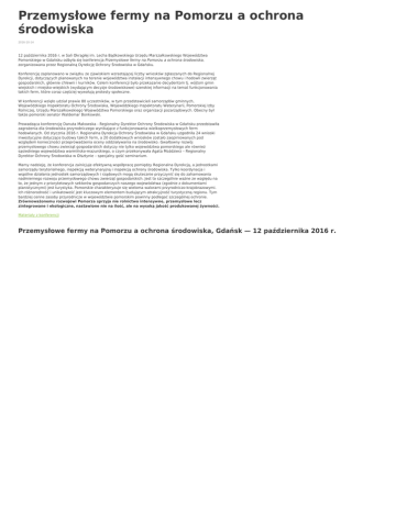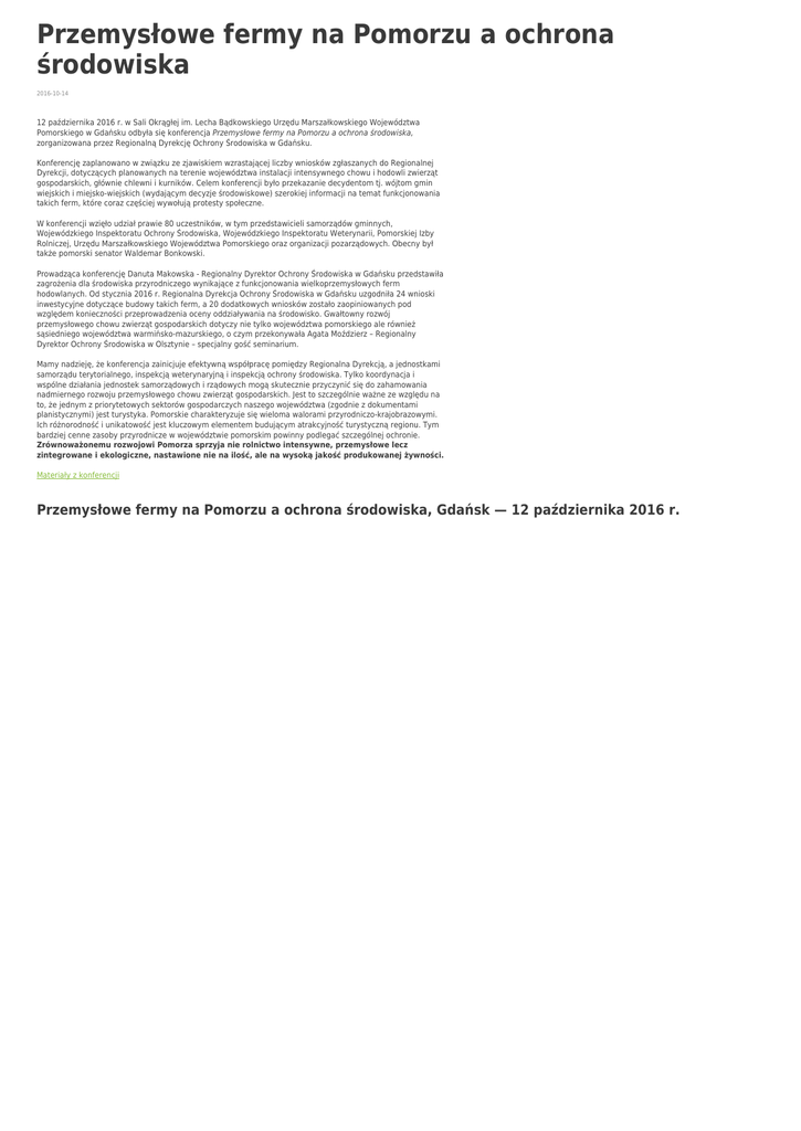 Przemysłowe fermy na Pomorzu a ochrona środowiska 2016-10-14 12 października 2016 r. w Sali Okrągłej im. Lecha Bądkowskiego Urzędu Marszałkowskiego Województwa Pomorskiego w Gdańsku odbyła się konferencja Przemysłowe fermy na Pomorzu a ochrona środowiska, zorganizowana przez Regionalną Dyrekcję Ochrony Środowiska w Gdańsku. Konferencję zaplanowano w związku ze zjawiskiem wzrastającej liczby wniosków zgłaszanych do Regionalnej Dyrekcji, dotyczących planowanych na terenie województwa instalacji intensywnego chowu i hodowli zwierząt gospodarskich, głównie chlewni i kurników. Celem konferencji było przekazanie decydentom tj. wójtom gmin wiejskich i miejsko-wiejskich (wydającym decyzje środowiskowe) szerokiej informacji na temat funkcjonowania takich ferm, które coraz częściej wywołują protesty społeczne. W konferencji wzięło udział prawie 80 uczestników, w tym przedstawicieli samorządów gminnych, Wojewódzkiego Inspektoratu Ochrony Środowiska, Wojewódzkiego Inspektoratu Weterynarii, Pomorskiej Izby Rolniczej, Urzędu Marszałkowskiego Województwa Pomorskiego oraz organizacji pozarządowych. Obecny był także pomorski senator Waldemar Bonkowski. Prowadząca konferencję Danuta Makowska - Regionalny Dyrektor Ochrony Środowiska w Gdańsku przedstawiła zagrożenia dla środowiska przyrodniczego wynikające z funkcjonowania wielkoprzemysłowych ferm hodowlanych. Od stycznia 2016 r. Regionalna Dyrekcja Ochrony Środowiska w Gdańsku uzgodniła 24 wnioski inwestycyjne dotyczące budowy takich ferm, a 20 dodatkowych wniosków zostało zaopiniowanych pod względem konieczności przeprowadzenia oceny oddziaływania na środowisko. Gwałtowny rozwój przemysłowego chowu zwierząt gospodarskich dotyczy nie tylko województwa pomorskiego ale również sąsiedniego województwa warmińsko-mazurskiego, o czym przekonywała Agata Moździerz – Regionalny Dyrektor Ochrony Środowiska w Olsztynie – specjalny gość seminarium. Mamy nadzieję, że konferencja zainicjuje efektywną współpracę pomiędzy Regionalna Dyrekcją, a jednostkami samorządu terytorialnego, inspekcją weterynaryjną i inspekcją ochrony środowiska. Tylko koordynacja i wspólne działania jednostek samorządowych i rządowych mogą skutecznie przyczynić się do zahamowania nadmiernego rozwoju przemysłowego chowu zwierząt gospodarskich. Jest to szczególnie ważne ze względu na to, że jednym z priorytetowych sektorów gospodarczych naszego województwa (zgodnie z dokumentami planistycznymi) jest turystyka. Pomorskie charakteryzuje się wieloma walorami przyrodniczo-krajobrazowymi. Ich różnorodność i unikatowość jest kluczowym elementem budującym atrakcyjność turystyczną regionu. Tym bardziej cenne zasoby przyrodnicze w województwie pomorskim powinny podlegać szczególnej ochronie. Zrównoważonemu rozwojowi Pomorza sprzyja nie rolnictwo intensywne, przemysłowe lecz zintegrowane i ekologiczne, nastawione nie na ilość, ale na wysoką jakość produkowanej żywności. Materiały z konferencji Przemysłowe fermy na Pomorzu a ochrona środowiska, Gdańsk — 12 października 2016 r.