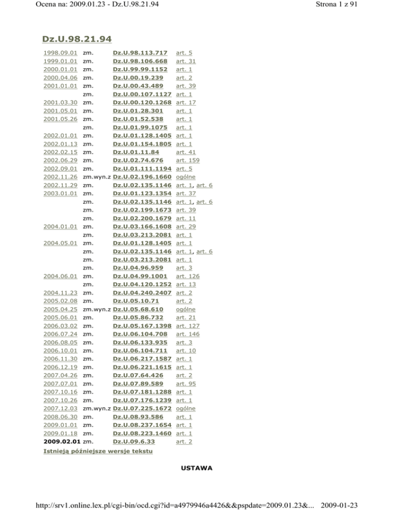 Ocena na: 2009.01.23 - Dz.U.98.21.94 Strona 1 z 91 Dz.U.98.21.94 1998.09.01 zm. Dz.U.98.113.717 art. 5 1999.01.01 zm. Dz.U.98.106.668 art. 31 2000.01.01 zm. Dz.U.99.99.1152 art. 1 2000.04.06 zm. Dz.U.00.19.239 art. 2 2001.01.01 zm. Dz.U.00.43.489 art. 39 zm. Dz.U.00.107.1127 art. 1 2001.03.30 zm. Dz.U.00.120.1268 art. 17 2001.05.01 zm. Dz.U.01.28.301 art. 1 2001.05.26 zm. Dz.U.01.52.538 art. 1 Dz.U.01.99.1075 art. 1 zm. 2002.01.01 zm. Dz.U.01.128.1405 art. 1 2002.01.13 zm. Dz.U.01.154.1805 art. 1 2002.02.15 zm. Dz.U.01.11.84 art. 41 2002.06.29 zm. Dz.U.02.74.676 art. 159 2002.09.01 zm. Dz.U.01.111.1194 art. 5 2002.11.26 zm.wyn.z Dz.U.02.196.1660 ogólne 2002.11.29 zm. Dz.U.02.135.1146 art. 1, art. 6 2003.01.01 zm. Dz.U.01.123.1354 art. 37 zm. Dz.U.02.135.1146 art. 1, art. 6 zm. Dz.U.02.199.1673 art. 39 zm. Dz.U.02.200.1679 art. 11 2004.01.01 zm. Dz.U.03.166.1608 art. 29 zm. Dz.U.03.213.2081 art. 1 2004.05.01 zm. Dz.U.01.128.1405 art. 1 zm. Dz.U.02.135.1146 art. 1, art. 6 zm. Dz.U.03.213.2081 art. 1 zm. Dz.U.04.96.959 art. 3 Dz.U.04.99.1001 art. 126 2004.06.01 zm. zm. Dz.U.04.120.1252 art. 13 2004.11.23 zm. Dz.U.04.240.2407 art. 2 2005.02.08 zm. Dz.U.05.10.71 art. 2 2005.04.25 zm.wyn.z Dz.U.05.68.610 ogólne 2005.06.01 zm. Dz.U.05.86.732 art. 21 2006.03.02 zm. Dz.U.05.167.1398 art. 127 2006.07.24 zm. Dz.U.06.104.708 art. 146 2006.08.05 zm. Dz.U.06.133.935 art. 3 2006.10.01 zm. Dz.U.06.104.711 art. 10 2006.11.30 zm. Dz.U.06.217.1587 art. 1 2006.12.19 zm. Dz.U.06.221.1615 art. 1 2007.04.26 zm. Dz.U.07.64.426 art. 2 2007.07.01 zm. Dz.U.07.89.589 art. 95 2007.10.16 zm. Dz.U.07.181.1288 art. 1 2007.10.26 zm. Dz.U.07.176.1239 art. 1 2007.12.03 zm.wyn.z Dz.U.07.225.1672 ogólne 2008.06.30 zm. Dz.U.08.93.586 art. 1 2009.01.01 zm. Dz.U.08.237.1654 art. 1 2009.01.18 zm. Dz.U.08.223.1460 art. 1 2009.02.01 zm. Dz.U.09.6.33 art. 2 Istnieją późniejsze wersje tekstu USTAWA http://srv1.online.lex.pl/cgi-bin/ocd.cgi?id=a4979946a4426&&pspdate=2009.01.23&... 2009-01-23 Ocena na: 2009.01.23 - Dz.U.98.21.94 Strona 2 z 91 z dnia 26 czerwca 1974 r. Kodeks pracy.1) (tekst jednolity) Preambuła (skreślona). DZIAŁ PIERWSZY PRZEPISY OGÓLNE Rozdział I Przepisy wstępne Art. 1. Kodeks pracy określa prawa i obowiązki pracowników i pracodawców. Art. 2. Pracownikiem jest osoba zatrudniona na podstawie umowy o pracę, powołania, wyboru, mianowania lub spółdzielczej umowy o pracę. Art. 3. Pracodawcą jest jednostka organizacyjna, choćby nie posiadała osobowości prawnej, a takŜe osoba fizyczna, jeŜeli zatrudniają one pracowników. Art. 31. § 1. Za pracodawcę będącego jednostką organizacyjną czynności w sprawach z zakresu prawa pracy dokonuje osoba lub organ zarządzający tą jednostką albo inna wyznaczona do tego osoba. § 2. Przepis § 1 stosuje się odpowiednio do pracodawcy będącego osobą fizyczną, jeŜeli nie dokonuje on osobiście czynności, o których mowa w tym przepisie. Art. 4. (skreślony). Art. 5. JeŜeli stosunek pracy określonej kategorii pracowników regulują przepisy szczególne, przepisy kodeksu stosuje się w zakresie nie uregulowanym tymi przepisami. Art. 6. § 1. Stosunek pracy między obywatelem polskim a polskim przedstawicielstwem, misją lub inną placówką za granicą podlega przepisom kodeksu. § 2. Stosunek pracy między obywatelem polskim a przedstawicielstwem, misją albo inną placówką państwa obcego lub instytucji międzynarodowej, działającymi na obszarze Rzeczypospolitej Polskiej, podlega przepisom kodeksu, jeŜeli umowy, układy lub porozumienia międzynarodowe nie stanowią inaczej. Art. 7. (skreślony). Art. 8. Nie moŜna czynić ze swego prawa uŜytku, który byłby sprzeczny ze społecznogospodarczym przeznaczeniem tego prawa lub zasadami współŜycia społecznego. Takie działanie lub zaniechanie uprawnionego nie jest uwaŜane za wykonywanie prawa i nie korzysta z ochrony. Art. 9. § 1. Ilekroć w Kodeksie pracy jest mowa o prawie pracy, rozumie się przez to przepisy Kodeksu pracy oraz przepisy innych ustaw i aktów wykonawczych, określające prawa i obowiązki pracowników i pracodawców, a takŜe postanowienia układów zbiorowych pracy i innych opartych na ustawie porozumień zbiorowych, regulaminów i statutów określających prawa i obowiązki stron stosunku pracy. § 2. Postanowienia układów zbiorowych pracy i porozumień zbiorowych oraz regulaminów i statutów nie mogą być mniej korzystne dla pracowników niŜ przepisy Kodeksu pracy oraz innych ustaw i aktów wykonawczych. § 3. Postanowienia regulaminów i statutów nie mogą być mniej korzystne dla pracowników niŜ postanowienia układów zbiorowych pracy i porozumień zbiorowych. http://srv1.online.lex.pl/cgi-bin/ocd.cgi?id=a4979946a4426&&pspdate=2009.01.23&... 2009-01-23 Ocena na: 2009.01.23 - Dz.U.98.21.94 Strona 3 z 91 § 4. (1) Postanowienia układów zbiorowych pracy i innych opartych na ustawie porozumień zbiorowych, regulaminów oraz statutów określających prawa i obowiązki stron stosunku pracy, naruszające zasadę równego traktowania w zatrudnieniu, nie obowiązują. Art. 91. (2) § 1. JeŜeli jest to uzasadnione sytuacją finansową pracodawcy, moŜe być zawarte porozumienie o zawieszeniu stosowania w całości lub w części przepisów prawa pracy, określających prawa i obowiązki stron stosunku pracy; nie dotyczy to przepisów Kodeksu pracy oraz przepisów innych ustaw i aktów wykonawczych. § 2. Porozumienie, o którym mowa w § 1, zawiera pracodawca i reprezentująca pracowników organizacja związkowa, a jeŜeli pracodawca nie jest objęty działaniem takiej organizacji, porozumienie zawiera pracodawca i przedstawicielstwo pracowników wyłonione w trybie przyjętym u tego pracodawcy. § 3. Zawieszenie stosowania przepisów prawa pracy nie moŜe trwać dłuŜej niŜ przez okres 3 lat. Przepis art. 24127 § 3 stosuje się odpowiednio. § 4. (3) Pracodawca przekazuje porozumienie właściwemu okręgowemu inspektorowi pracy. § 5. Przepisy § 1-4 nie 