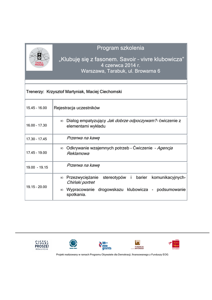 Program szkolenia „Klubuję się z fasonem. Savoir – vivre klubowicza” 4 czerwca 2014 r. Warszawa, Tarabuk, ul. Browarna 6 Trenerzy: Krzysztof Martyniak, Maciej Ciechomski 15.45 – 16.00 16.00 – 17.30 17.30 – 17.45 Rejestracja uczestników • Dialog empatyzujący Jak dobrze odpoczywam?- ćwiczenie z elementami wykładu Przerwa na kawę • Odkrywanie wzajemnych potrzeb - Ćwiczenie – Agencja 17.45 – 19.00 Reklamowa 19.00 - 19.15 Przerwa na kawę • Przezwyciężanie stereotypów i barier komunikacyjnych- Chiński portret 19.15 – 20.00 • Wypracowanie drogowskazu klubowicza - podsumowanie spotkania. Projekt realizowany w ramach Programu Obywatele dla Demokracji, finansowanego z Funduszy EOG