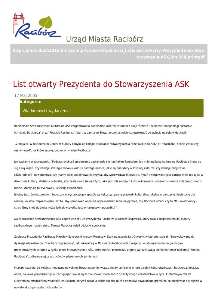 Urząd Miasta Racibórz http://umraciborz2016.intracom.pl/urzad/aktualnosci_lista/List-otwarty-Prezydenta-do-Stow arzyszenia-ASK/idn:398/printpdf List otwarty Prezydenta do Stowarzyszenia ASK 17 Maj 2005 kategoria: Wiadomości i wydarzenia Raciborskie Stowarzyszenie Kulturalne ASK zorganizowało pod koniec kwietnia w ramach akcji "Śmierć Raciborza", happeningi "Ostatnie tchnienie Raciborza" oraz "Pogrzeb Raciborza", które w zamiarze Stowarzyszenia, miały sprowokować do wzięcia udziału w dyskusji. 12 maja br. w Raciborskim Centrum Kultury odbyło się kolejne spotkanie Stowarzyszenia "The Task is to ASK" pt. "Racibórz - sekcja zwłok czy reanimacja?", na które zaproszono m.in. władze Raciborza. Jak czytamy w zaproszeniu: "Podczas dyskusji spróbujemy zastanowić się nad takimi kwestiami jak m.in. polityka kulturalna Raciborza i tego co się z nią wiąże. Czy istnieje strategia rozwoju kultury naszego miasta, jakie są priorytety w lokalnej kulturze, czy istnieje miejsce na różnorodność i nowatorstwo, czy mamy wolę podejmowania ryzyka, aby wprowadzać innowacje. Pytań i wątpliwości jest bardzo wiele nie tylko w dziedzinie kultury. Widzimy potrzebę, aby zastanowić się nad tym, jaka jest rola młodych ludzi w kreowaniu wizerunku miasta i dlaczego młodzi ludzie, którzy się tu wychowali, uciekają z Raciborza. Istotny jest również problem tego, czy w wystarczający sposób są wykorzystywane placówki kulturalne, lokalne organizacje i instytucje dla rozwoju miasta. Najważniejsze jest to, aby spróbować wspólnie odpowiedzieć sobie na pytanie, czy Racibórz umarł, czy to MY - mieszkańcy straciliśmy chęć do życia. Może jednak wszystko jest w najlepszym porządku?". Na zaproszenie Stowarzyszenia ASK odpowiedział Z-ca Prezydenta Raciborza Mirosław Szypowski, który wraz z Inspektorem ds. kultury raciborskiego magistratu p. Teresą Piasecką wzięli udział w spotkaniu. Zastępcą Prezydenta Raciborza Mirosław Szypowski wręczył Prezesowi Stowarzyszenia List Otwarty, w którym napisał: "Sprowokowany do dyskusji artykułem pn. "Racibórz pogrzebany", jaki ukazał się w Nowinach Raciborskich 3 maja br. w odniesieniu do happeningów prezentowanych ostatnio w rynku przez Stowarzyszenie ASK, któremu Pan przewodzi, pragnę wyrazić swoją opinię na temat rzekomej "śmierci Raciborza", odtwarzanej przez twórców plenerowych zamierzeń. Miałem nadzieję, że kolejne, niedawno powołane Stowarzyszenie, włączy się dynamicznie w nurt działań kulturotwórczych Raciborza, inicjując nowe, ciekawe przedsięwzięcia, zachęcając tym samym miejscową społeczność do aktywnego uczestnictwa w życiu kulturalnym miasta. Liczyłem na młodzieńczą witalność, entuzjazm, poryw i zapał, a także pogodę ducha członków powołanego gremium, co przejawiać się będzie w nowatorskich pomysłach ich autorów. W tym też klimacie przyjąłem Wasze zawiadomienie o chęci zorganizowania 28 kwietnia br. w rynku, imprezy pn. "Dzień pokoju". Ku mojemu zdziwieniu, pomimo wyrażonej zgody na jej sfinalizowanie, zamierzenie z niewiadomych mi przyczyn nie doszło do skutku. Zastąpiono je natomiast dwoma happeningami, traktującymi o "zgonie" Raciborza. Jestem otwarty na wszelkie, pełne inwencji twórczej działania kulturalne, jednakże z przesłaniem nt. "Śmierci naszego miasta", jakie wyrażono w prezentowanych działaniach, zgodzić się nie mogę. Liczne zaproszenia, na wszelkiego rodzaju przedsięwzięcia kulturalne, jakie otrzymuję nieomal codziennie, organizowane przez: Raciborskie Centrum Kultury, Muzeum, Miejską i Powiatową Bibliotekę Publiczną, Młodzieżowy Dom Kultury, Stowarzyszenie Artystów i Podróżników - Grupę "Rosynant", Stowarzyszenie Kultury Ziemi Raciborskiej, Raciborskie Stowarzyszenie Twórców Kultury "Horyzont", Towarzystwo Miłośników Ziemi Raciborskiej, Polski Związek Chórów i Orkiestr - Okręg Raciborski, Koło Terenowe Polskiego Związku Głuchych oraz artystów indywidualnych, wskazują na ich mnogość i różnorodność. Trudno zatem mówić o agonii w tym zakresie i nie twierdzę, że wskazane podmioty, powiedziały w tej materii ostatnie słowo. Uczestnictwo w kulturze jest integralnym składnikiem stylu życia współczesnego społeczeństwa i zależy od wielu czynników, z których istotnym jest kształtowanie potrzeb w tym zakresie. Proces ten wymaga prowadzenia m.in. wielostronnej edukacji, cierpliwego proponowania ambitniejszych ofert kulturalnych, niezależnie od statystycznych wskaźników ich popularności. Sądzę, że Stowarzyszenie, oprócz krytycznego, przygnębiającego spojrzenia na to co animowane w raciborskiej kulturze i przyjmowane przez jej odbiorców, wesprze liczne grono niestrudzonych i niezniechęconych organizatorów działań kulturotwórczych naszego miasta."