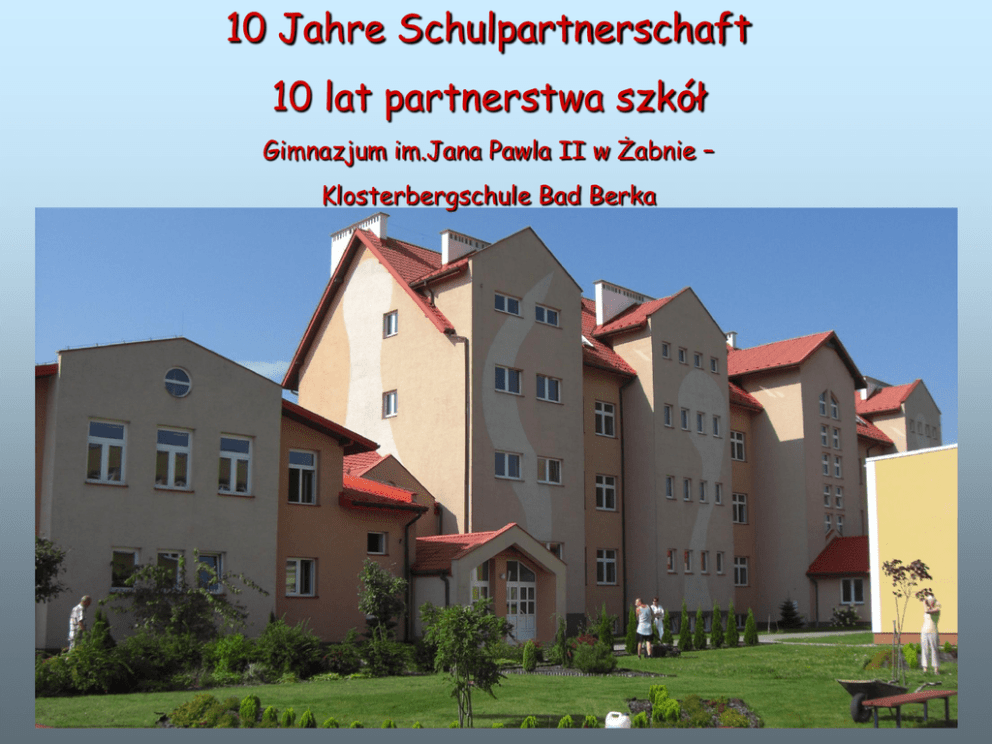 10 Jahre Schulpartnerschaft 10 lat partnerstwa szkół Gimnazjum im.Jana Pawla II w Żabnie – Klosterbergschule Bad Berka Unsere große Reise nach Zabno Nasza wielka podróż do Żabna Insgesamt 17 Stunden Bahnfahrt! Jeder hatte so seine eigene Methode, die Zeit zu verbringen. Musik, Bonbons, Wurstbrote, Schokolade, Cola, …Viel Schlaf! Razem 17 godzin jazdy pociągiem ! Każdy miał swoją metodę, jak spędzić czas. Muzyka, cukierki, kanapki z kiełbasą, Cola, ..... Dużo snu. Der erste Tag Wie immer wurden wir auch dieses Mal herzlich begrüßt und prima verpflegt. Das Frühstück – super lecker! Anschließend marschierten wir in die Schule, wo wir in verschiedenen Workshops Gelegenheit zum Kennenlernen hatten. Dzień pierwszy Jak zwykle, tak i tym razem zostaliśmy serdecznie przywitani i wspaniale ugoszczeni. Śniadanie – super smaczne! Następnie pomaszerowaliśmy do szkoły, gdzie mieliśmy możliwość poznania się uczestnicząc w różnych warsztatach. Auf der neuen Sportanlage neben der Schule spielten wir Beach-Volleyball, Fußball, Basketball und Tennis. Am Abend flohen wir vor einem gewaltigen Gewitter in den Speisesaal unserer Herberge. Na nowym obiekcie sportowym obok szkoły graliśmy w siatkówkę plażową, piłkę nożną koszykówkę i tenisa. Wieczorem uciekliśmy do jadalni naszego hotelu przed okropną burzą. In feierlichem Rahmen wurden wir, der Bürgermeister, Vorsitzende des Stadtrates und Elternvertreter durch die Schulleiterin begrüßt. Tam zostaliśmy uroczyście przywitani przez Burmistrza, Przewodniczącego Rady Miejskiej i przedstawicieli rodziców. Wir erhielten zur Erinnerung an 10 Jahre Schulpartnerschaft T-Shirts und eine riesige superleckere Torte. Na pamiątkę 10-lecia partnerstwa naszych szkół otrzymaliśmy koszulki i wielki przepyszny tort. Unseren Gastgebern konnten wir im Gegenzug eine Grußbotschaft unserer Schulleiterin Frau Schmidt verlesen sowie ein Banner mit Bildern aus 10 Jahren Zusammenarbeit überreichen. Naszym gospodarzom zrewanżowaliśmy się odczytując pozdrowienia i życzenia naszej Pani Dyrektor Schmidt. Wręczyliśmy również olbrzymi baner ze zdjęciami obrazującymi 10 lat naszej współpracy. …ein neuer Tag beginnt ... zaczyna się nowy dzień Die Nacht war sehr kurz und deshalb war das Frühstück sehr wichtig. Auch an diesem Tag warteten wieder viele Aktivitäten auf uns… Noc była bardzo krótka i dlatego śniadanie było bardzo ważne. Również w tym dniu czekało na nas wiele niespodzianek. …mit einem guten Frühstück ...dobrym śniadaniem Die Kletterwand war für viele eine Herausforderung. Geschicklichkeit, Kraft, Ausdauer und Mut! Na ja, von allem zumindest ein bisschen Ściana do wspinaczki była dla wielu prawdziwym wyzwaniem. Potrzebowaliśmy zręczności, siły, wytrwałości i odwagi ! No tak, choć trochę . Wer nicht hören will … wird durchgekitzelt und später verhauen. Kto nie chce słuchać ... będzie połaskotany, a potem pobity ! Elena! Hilfe! Hol mich hier runter! Elena! Ratunku ! Ściągnij mnie na dół! Suchbild: …findet die blaue Socke Zadanie na spostrzegawczość: ... Znajdź niebieską skarpetkę Das erlebten wir am Mittwoch To przeżyliśmy w środę Am heutigen Tag erwarteten uns: 1. Arbeit in Projektgruppen 2. Ein Ausflug nach Tarnow 3. Ein Besuch im Schwimmbad Dzisiejszego dnia czekały nas: 1. Praca w grupach nad projektami 2. Wycieczka do Tarnowa 3. Pobyt na basenie Der Strzelecki-Park war wunderschön. Grzegorz erklärte und die verschiedenen Sehenswürdigkeiten. Park Strzelecki był przepiękny. Grzegorz objaśnił nam historię najróżniejszych zabytków. Stadtimressionen / Tarnow Spiel, Spaß und Wasser… Zabawa, radość i woda ... Batman lebt in Tarnow! Batman żyje w Tarnowie !
