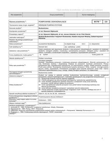 Opis modułu kształcenia / przedmiotu (sylabus) Rok akademicki: Grupa przedmiotów: Numer katalogowy: Nazwa przedmiotu1): POMPOWNIE ODWADNIAJĄCE Tłumaczenie nazwy na jęz. angielski3): DRAINAGE PUMPING STATIONS 4) ECTS 2) 2,0 Budownictwo Kierunek studiów : 5) dr inż. Sławomir Bajkowski Koordynator przedmiotu : Prowadzący zajęcia6): dr inż. Sławomir Bajkowski, dr inż. Janusz Urbański, dr inż. Piotr Siwicki Wydział Budownictwa i Inżynierii Środowiska, Katedra Inżynierii Wodnej, Zakład Inżynierii Rzecznej 7) Jednostka realizująca : Wydział, dla którego przedmiot jest realizowany8): Status przedmiotu9): a) przedmiot fakultatywny b) stopień drugi Cykl dydaktyczny10): Semestr letni Jęz. wykładowy: polski Założenia i cele przedmiotu12): Celem przedmiotu jest zapoznanie studenta z rolą pompowni odwadniających, zasadami ich lokalizacji, działania, rodzajami układów i konstrukcji, wymiarowania pompowni, rodzajami pomp i zasadami ich doboru, a ponadto z konstrukcjami budynków, z aparaturą i wyposażeniem pompowni. a) Formy dydaktyczne, liczba godzin13): rok 2 c) stacjonarne wykład ......................................................................................................; liczba godzin 30; Metody dydaktyczne14): Wykład, konsultacje Pełny opis przedmiotu15): Tematyka wykładów: Rodzaje i klasyfikacja pompowni. Lokalizacja pompowni odwadniających. Zbiorniki wyrównawcze: ich rola, lokalizacja, budowa i eksploatacja. Dopływy do pompowni, wysokość podnoszenia. Pompy: podstawowe typy, charakterystyki hydrauliczne, ich wykorzystanie i analiza. Układy pompowe, armatura. Punkt pracy pompy. Rozwiązania konstrukcyjne budynku pompowni. Wloty, czerpnie, rurociągi ssawne, tłoczne, wyloty, wyposażenie. Prowadzenie rurociągów poza budynek pompowni, przez wały i zapory. Obliczenie zapotrzebowania mocy i energii. Układy obciążeń pompowni i ich stateczność. Wymagania formalne (przedmioty wprowadzające)16): Budownictwo wodne Student ma wiedzę w zakresie podstaw budownictwa hydrotechnicznego, posiada umiejętność korzystania z danych hydrologicznych i materiałów geodezyjnych oraz programów komputerowych 01 - Rozpoznaje budowle terenów depresji względnej. 02 - Potrafi posługiwać się dokumentacją hydrologiczną, hydrauliczną i geotechniczną. 03 - Umie określać podstawowe zjawiska związane z przepływem wody przez elementy pompowni, potrafi obliczyć dopływ do pompowni. 04 - Umie zaprojektować budynek pompowni oraz potrafi dobrać konstrukcję wylotową oraz obliczyć jej parametry. 05 - Umie obliczać obciążenia pompowni i sprawdzać warunki stateczności. 06 - Potrafi realizować projekt wykorzystując osiągnięcia nauki i techniki, działając przy tym w sposób kreatywny i przedsiębiorczy. Założenia wstępne17): Efekty kształcenia18): Sposób weryfikacji efektów kształcenia19): Efekt 01, 02, 03, 04, 05, 06 – kolokwium Forma dokumentacji osiągniętych efektów Przechowywanie arkuszy kolokwium kształcenia 20): Elementy i wagi mające wpływ na ocenę Kolokwium – 100% końcową21): Miejsce realizacji zajęć22): Sala dydaktyczna 23) Literatura podstawowa i uzupełniająca : 1. Jankowski W., 1966: Pompownie i urządzenia hydroforowe. Arkady, Warszawa. 2. Stępniewski M., 1985: Pompy. WN-T. Warszawa. 3. CBSiPWM „Wytyczne instruktażowe projektowania budowli wodno melioracyjnych – Pompownie”. Materiały Pomocnicze nr 71. 4. Klugiewicz J., 1992: Polderyzacja terenów depresyjnych. TWWP, Inowrocław. UWAGI24): 1 Wskaźniki ilościowe charakteryzujące moduł/przedmiot25) : Szacunkowa sumaryczna liczba godzin pracy studenta (kontaktowych i pracy własnej) niezbędna dla osiągnięcia zakładanych efektów kształcenia18) - na tej podstawie należy wypełnić pole ECTS2: Łączna liczba punktów ECTS, którą student uzyskuje na zajęciach wymagających bezpośredniego udziału nauczycieli akademickich: Łączna liczba punktów ECTS, którą student uzyskuje w ramach zajęć o charakterze praktycznym, takich jak zajęcia laboratoryjne, projektowe, itp.: 50h 2,0 ECTS 1,0 ECTS Tabela zgodności kierunkowych efektów kształcenia efektami przedmiotu 26) Nr /symbol efektu 01 Rozpoznaje budowle terenów depresji względnej. Odniesienie do efektów dla programu kształcenia na kierunku K_W14, K_U01 02 Potrafi posługiwać się dokumentacją hydrologiczną, hydrauliczną i geotechniczną. K_W04, K_U08 03 Umie określać podstawowe zjawiska związane z przepływem wody przez elementy pompowni, potrafi obliczyć dopływ do pompowni. Umie zaprojektować budynek pompowni oraz potrafi dobrać konstrukcję wylotową oraz obliczyć jej parametry. Umie obliczać obciążenia pompowni i sprawdzać warunki stateczności. K_W04, K_U08 Potrafi zaplanować inwestycje hydrotechniczną wykorzystując osiągnięcia nauki i techniki, działając przy tym w sposób kreatywny i przedsiębiorczy. K_K02 04 05 06 Wymienione w wierszu efekty kształcenia: K_W09, K_U07 K_W04, K_U03 2