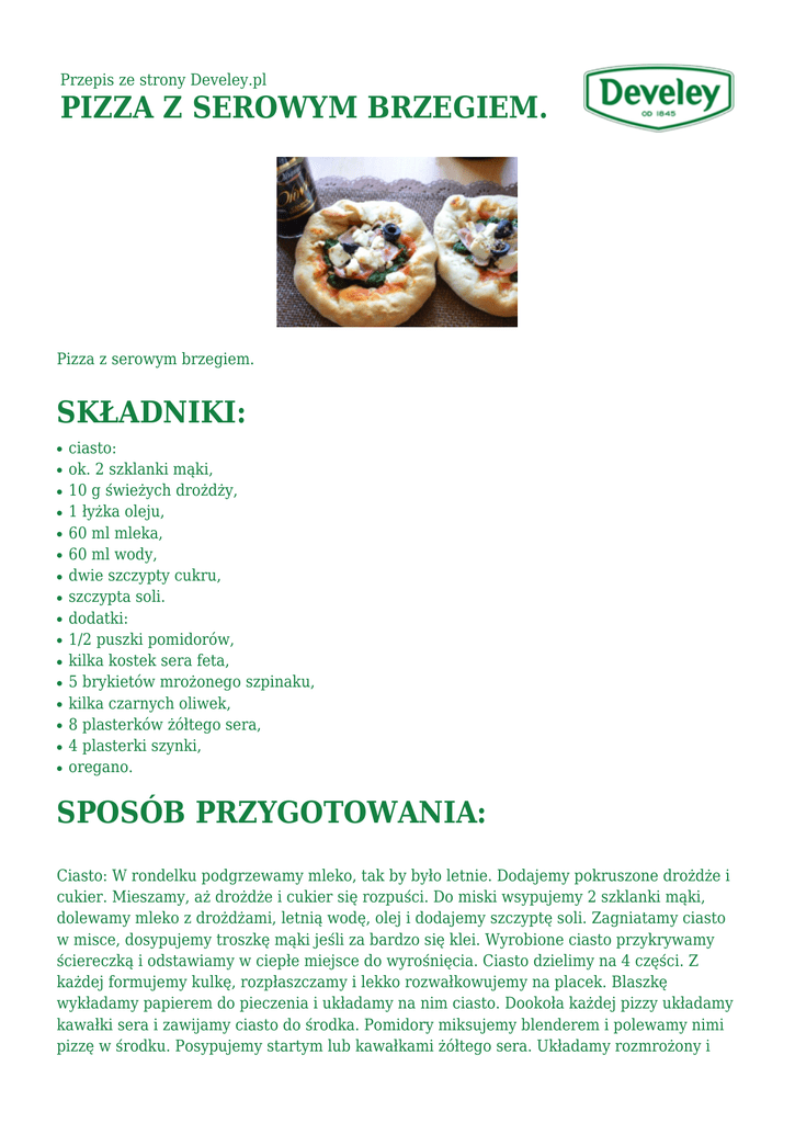 Przepis ze strony Develey.pl PIZZA Z SEROWYM BRZEGIEM. Pizza z serowym brzegiem. SKŁADNIKI: ● ● ● ● ● ● ● ● ● ● ● ● ● ● ● ● ciasto: ok. 2 szklanki mąki, 10 g świeżych drożdży, 1 łyżka oleju, 60 ml mleka, 60 ml wody, dwie szczypty cukru, szczypta soli. dodatki: 1/2 puszki pomidorów, kilka kostek sera feta, 5 brykietów mrożonego szpinaku, kilka czarnych oliwek, 8 plasterków żółtego sera, 4 plasterki szynki, oregano. SPOSÓB PRZYGOTOWANIA: Ciasto: W rondelku podgrzewamy mleko, tak by było letnie. Dodajemy pokruszone drożdże i cukier. Mieszamy, aż drożdże i cukier się rozpuści. Do miski wsypujemy 2 szklanki mąki, dolewamy mleko z drożdżami, letnią wodę, olej i dodajemy szczyptę soli. Zagniatamy ciasto w misce, dosypujemy troszkę mąki jeśli za bardzo się klei. Wyrobione ciasto przykrywamy ściereczką i odstawiamy w ciepłe miejsce do wyrośnięcia. Ciasto dzielimy na 4 części. Z każdej formujemy kulkę, rozpłaszczamy i lekko rozwałkowujemy na placek. Blaszkę wykładamy papierem do pieczenia i układamy na nim ciasto. Dookoła każdej pizzy układamy kawałki sera i zawijamy ciasto do środka. Pomidory miksujemy blenderem i polewamy nimi pizzę w środku. Posypujemy startym lub kawałkami żółtego sera. Układamy rozmrożony i odciśnięty szpinak. Fetę pokrojoną w kostkę, plasterki czarnych oliwek, kawałki szynki. Posypujemy oregano. Pieczemy ok. 17 minut w 180 stopniach. Wkładamy do zimnego piekarnika i nastawiam czas na 17 minut i temperaturę 180 stopni. Więcej przepisów na Aga w Kuchni.