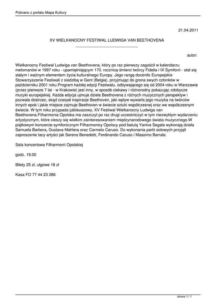 Pobrano z portalu Mapa Kultury 21.04.2011 XV WIELKANOCNY FESTIWAL LUDWIGA VAN BEETHOVENA ____________________________ autor: Wielkanocny Festiwal Ludwiga van Beethovena, który po raz pierwszy zagościł w kalendarzu melomanów w 1997 roku - upamiętniającym 170. rocznicę śmierci twórcy Fidelia i IX Symfonii - stał się stałym i ważnym elementem życia kulturalnego Europy. Jego rangę doceniło Europejskie Stowarzyszenie Festiwali z siedzibą w Gent (Belgia), przyjmując do grona swych członków w październiku 2001 roku.Program każdej edycji Festiwalu, odbywającego się od 2004 roku w Warszawie (przez pierwsze 7 lat - w Krakowie) jest inny, w sposób ciekawy i różnorodny pokazując zdobycze muzyki europejskiej. Każda edycja ujmuje dzieła Beethovena z różnych muzycznych perspektyw i pozwala dostrzec, skąd czerpał inspiracje Beethoven, jaki wpływ wywarła jego muzyka na twórców innych epok i jakie miejsce zajmuje Beethoven w świecie sztuki współczesnej oraz we współczesnym świecie. W tym roku przypada jubileuszowy, XV Festiwal Wielkanocny Ludwiga van Beethovena.Filharmonia Opolska ma zaszczyt po raz drugi uczestniczyć w tym niezwykłym wydarzeniu artystycznym, które cieszy się wielkim zainteresowaniem międzynarodowego świata muzycznego.W piątkowym koncercie symfonicznym Filharmonicy Opolscy pod batutą Yaniva Segala wykonają dzieła Samuela Barbera, Gustava Mahlera oraz Carmelo Caruso. Do wykonania partii solowych przyjęli zaproszenie tacy artyści jak Serena Benedetti, Ferdinando Caruso i Massimo Barrale. Sala koncertowa Filharmonii Opolskiej godz. 19.00 Bilety 25 zł, ulgowe 18 zł Kasa FO 77 44 23 286 strona 1 / 1