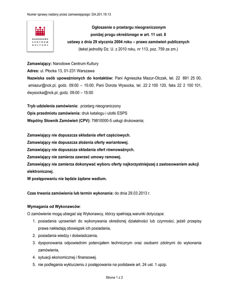 Numer sprawy nadany przez zamawiającego: DA.201.19.13 Ogłoszenie o przetargu nieograniczonym poniżej progu określonego w art. 11 ust. 8 ustawy z dnia 29 stycznia 2004 roku – prawo zamówień publicznych (tekst jednolity Dz. U. z 2010 roku, nr 113, poz. 759 ze zm.) Zamawiający: Narodowe Centrum Kultury Adres: ul. Płocka 13, 01-231 Warszawa Nazwiska osób upoważnionych do kontaktów: Pani Agnieszka Mazur-Olczak, tel. 22 891 25 00, [email protected], godz. 09:00 – 15:00; Pani Dorota Wysocka, tel. 22 2 100 120, faks 22 2 100 101, [email protected], godz. 09:00 – 15:00 Tryb udzielenia zamówienia: przetarg nieograniczony Opis przedmiotu zamówienia: druk katalogu i ulotki ESPS Wspólny Słownik Zamówień (CPV): 79810000-5 usługi drukowania; Zamawiający nie dopuszcza składania ofert częściowych. Zamawiający nie dopuszcza złożenia oferty wariantowej. Zamawiający nie dopuszcza składania ofert równoważnych. Zamawiający nie zamierza zawrzeć umowy ramowej. Zamawiający nie zamierza dokonywać wyboru oferty najkorzystniejszej z zastosowaniem aukcji elektronicznej. W postępowaniu nie będzie żądane wadium. Czas trwania zamówienia lub termin wykonania: do dnia 29.03.2013 r. Wymagania od Wykonawców: O zamówienie mogą ubiegać się Wykonawcy, którzy spełniają warunki dotyczące: 1. posiadania uprawnień do wykonywania określonej działalności lub czynności, jeżeli przepisy prawa nakładają obowiązek ich posiadania, 2. posiadania wiedzy i doświadczenia, 3. dysponowania odpowiednim potencjałem technicznym oraz osobami zdolnymi do wykonania zamówienia, 4. sytuacji ekonomicznej i finansowej. 5. nie podlegania wykluczeniu z postępowania na podstawie art. 24 ust. 1 upzp. Strona 1 z 2 Numer sprawy nadany przez zamawiającego: DA.201.19.13 Opis sposobu dokonania oceny spełniania warunków udziału w postępowaniu Ocena spełniania warunków udziału w postępowaniu zostanie dokonana na podstawie dokumentów i informacji złożonych przez Wykonawcę oraz Oświadczenia stanowiącego załącznik nr 2 do Specyfikacji Istotnych Warunków Zamówienia. Ocena będzie dokonana metodą: spełnia – nie spełnia. Kryteria oceny ofert: Kryterium Znaczenie Cena brutto za druk katalogu i ulotki ESPS 100% Razem 100 % Termin i miejsce składania ofert: do dnia 12.02.2013 r. do godziny 12:00 w Narodowym Centrum Kultury, ul. Płocka 13, 01–231 Warszawa, w recepcji. Termin związania z ofertą: 30 dni licząc od upływu terminu składania ofert. Określenie sposobu uzyskania specyfikacji istotnych warunków zamówienia oraz adres strony internetowej, na której została zamieszczona Specyfikacja Istotnych Warunków Zamówienia: Specyfikacja istotnych warunków zamówienia jest dostępna w siedzibie Zamawiającego w Narodowym Centrum Kultury Specyfikacja Istotnych Warunków Zamówienia została zamieszczona na stronie internetowej Zamawiającego www.nck.pl Data wywieszenia: 04.02.2013 r. Rafał Rogulski Zastępca Dyrektora Narodowego Centrum Kultury Strona 2 z 2