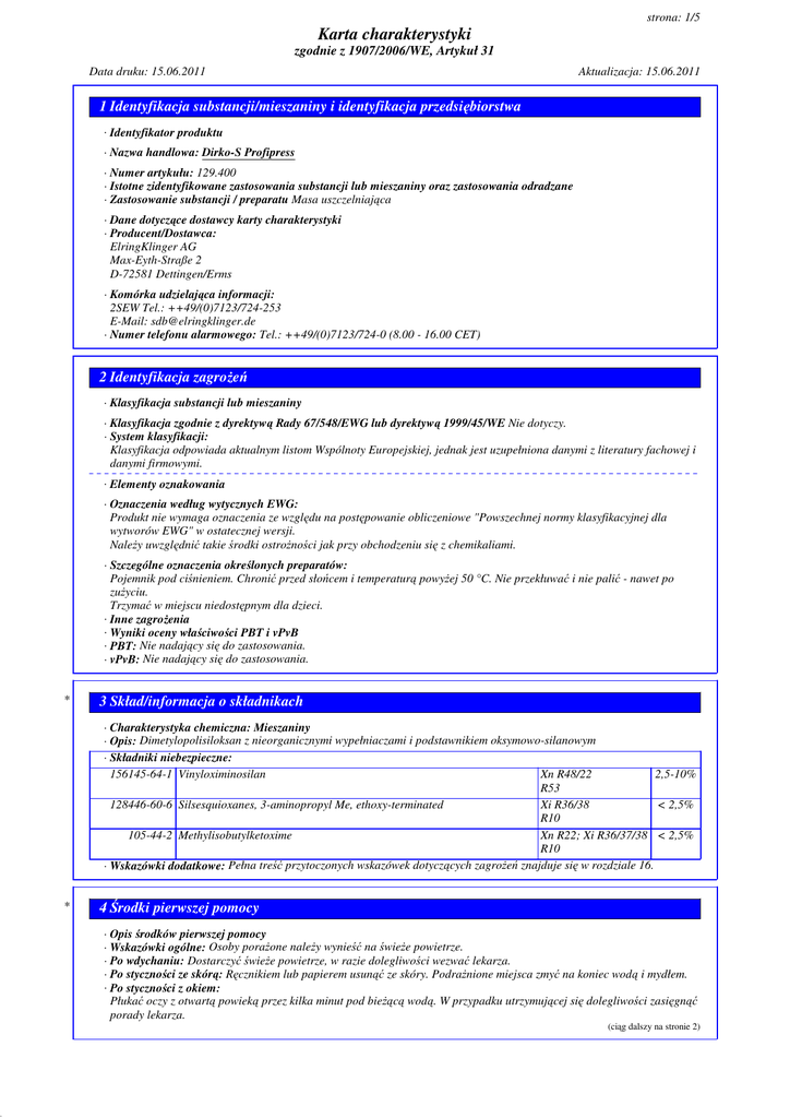 DR strona: 1/5 Karta charakterystyki zgodnie z 1907/2006/WE, Artykuł 31 Data druku: 15.06.2011 Aktualizacja: 15.06.2011 1 Identyfikacja substancji/mieszaniny i identyfikacja przedsiębiorstwa · Identyfikator produktu · Nazwa handlowa: Dirko-S Profipress · Numer artykułu: 129.400 · Istotne zidentyfikowane zastosowania substancji lub mieszaniny oraz zastosowania odradzane · Zastosowanie substancji / preparatu Masa uszczelniająca · Dane dotyczące dostawcy karty charakterystyki · Producent/Dostawca: ElringKlinger AG Max-Eyth-Straße 2 D-72581 Dettingen/Erms · Komórka udzielająca informacji: 2SEW Tel.: ++49/(0)7123/724-253 E-Mail: [email protected] · Numer telefonu alarmowego: Tel.: ++49/(0)7123/724-0 (8.00 - 16.00 CET) 2 Identyfikacja zagroŜeń · Klasyfikacja substancji lub mieszaniny · Klasyfikacja zgodnie z dyrektywą Rady 67/548/EWG lub dyrektywą 1999/45/WE Nie dotyczy. · System klasyfikacji: Klasyfikacja odpowiada aktualnym listom Wspólnoty Europejskiej, jednak jest uzupełniona danymi z literatury fachowej i danymi firmowymi. · Elementy oznakowania · Oznaczenia według wytycznych EWG: Produkt nie wymaga oznaczenia ze względu na postępowanie obliczeniowe "Powszechnej normy klasyfikacyjnej dla wytworów EWG" w ostatecznej wersji. NaleŜy uwzględnić takie środki ostroŜności jak przy obchodzeniu się z chemikaliami. · Szczególne oznaczenia określonych preparatów: Pojemnik pod ciśnieniem. Chronić przed słońcem i temperaturą powyŜej 50 °C. Nie przekłuwać i nie palić - nawet po zuŜyciu. Trzymać w miejscu niedostępnym dla dzieci. · Inne zagroŜenia · Wyniki oceny właściwości PBT i vPvB · PBT: Nie nadający się do zastosowania. · vPvB: Nie nadający się do zastosowania. * 3 Skład/informacja o składnikach · Charakterystyka chemiczna: Mieszaniny · Opis: Dimetylopolisiloksan z nieorganicznymi wypełniaczami i podstawnikiem oksymowo-silanowym · Składniki niebezpieczne: 156145-64-1 Vinyloximinosilan Xn R48/22 2,5-10% R53 128446-60-6 Silsesquioxanes, 3-aminopropyl Me, ethoxy-terminated Xi R36/38 < 2,5% R10 105-44-2 Methylisobutylketoxime Xn R22; Xi R36/37/38 < 2,5% R10 · Wskazówki dodatkowe: Pełna treść przytoczonych wskazówek dotyczących zagroŜeń znajduje się w rozdziale 16. * 4 Środki pierwszej pomocy · Opis środków pierwszej pomocy · Wskazówki ogólne: Osoby poraŜone naleŜy wynieść na świeŜe powietrze. · Po wdychaniu: Dostarczyć świeŜe powietrze, w razie dolegliwości wezwać lekarza. · Po styczności ze skórą: Ręcznikiem lub papierem usunąć ze skóry. PodraŜnione miejsca zmyć na koniec wodą i mydłem. · Po styczności z okiem: Płukać oczy z otwartą powieką przez kilka minut pod bieŜącą wodą. W przypadku utrzymującej się dolegliwości zasięgnąć porady lekarza. (ciąg dalszy na stronie 2) DR strona: 2/5 Karta charakterystyki zgodnie z 1907/2006/WE, Artykuł 31 Data druku: 15.06.2011 Aktualizacja: 15.06.2011 Nazwa handlowa: Dirko-S Profipress (ciąg dalszy od strony 1) · Po przełknięciu: Przepłukać jamę ustną i obficie popić wodą. Natychmiast zasięgnąć porady lekarza. 5 Postępowanie w przypadku poŜaru · Środki gaśnicze · Przydatne środki gaśnicze: Zabiegi gaszenia ognia dostosować do otoczenia. CO2, proszek gaśniczy lub strumień rozpylonej wody. Większy poŜar zwalczać strumieniem rozpylonej wody. · Informacje dla straŜy poŜarnej · Specjalne wyposaŜenie ochronne: Środki specjalne nie są konieczne. * 6 Postępowanie w przypadku niezamierzonego uwolnienia do środowiska · Indywidualne środki ostroŜności, wyposaŜenie ochronne i procedury w sytuacjach awaryjnych Nosić ubranie ochronne. Osoby nie zabezpieczone przenieść w bezpieczne miejsce. · Środki ostroŜności w zakresie ochrony środowiska: Szczególne środki nie są konieczne. Nie dopuścić do przeniknięcia do kanalizacji /wód powierzchniowych /wód gruntowych. · Metody i materiały zapobiegające rozprzestrzenianiu się skaŜenia i słuŜące do usuwania skaŜenia: Zadbać o wystarczające przewietrzenie. Zdjąć mechanicznie. Materiał zebrany usunąć w sposób zgodny z przepisami. · Odniesienia do innych sekcji W wyniku reakcji z parą wodną (wilgotność powietrza) są uwalniane produkty rozczepienia. Patrz rozdział 8. 7 Postępowanie z substancjami i mieszaninami oraz ich magazynowanie · Sposób obchodzenia się: · Środki ostroŜności dotyczące bezpiecznego postępowania Zadbać o dobry nawiew /odsysanie w miejscu pracy. · Wskazówki dla ochrony przeciwpoŜarowej i przeciwwybuchowej: Uwaga: Pojemnik jest pod ciśnieniem. Chronić przed promieniami słońca i temperaturami powyŜej 500 C. TakŜe po uŜyciu nie otwierać gwałtownie i nie spalać. · Warunki bezpiecznego magazynowania, łącznie z informacjami dotyczącymi wszelkich wzajemnych niezgodności · Składowanie: · Wymagania w stosunku do pomieszczeń składowych i zbiorników: Brak szczególnych wymagań. · Wskazówki odnośnie wspólnego składowania: Nie konieczne. · Dalsze wskazówki odnośnie warunków składowania: Składować w dobrze zamkniętych beczkach w chłodnym i suchym miejscu. Chronić przed gorącem i bezpośrednim promieniowaniem słonecznym. * 8 Kontrola naraŜenia/środki ochrony indywidualnej · Dodatkowe wskazówki dla wykonania urządzeń technicznych: Brak dalszych danych, patrz punkt 7. · Parametry dotyczące kontroli · Składniki wraz z kontrolowanymi wartościami granicznymi zaleŜnymi od miejsca pracy: Produkt nie zawiera znaczących ilości materiałów, których wartości graniczne musiałyby być kontrolowane pod kątem warunków miejsca pracy. · Numer CAS dotyczący nazwy materiału % Rodzaj Wartość Jednostka Podczas utwardzania produktu, w wyniku reakcji z parą wodną (wilgotność powietrza), są wytwarzane i uwalniane następujące substancje: Numer CAS dotyczący nazwy materiału % Rodzaj Wartość Jednostka 105-44-2 ketoksym izobutylo/metylowy (ok. 7) · Wskazówki dodatkowe: