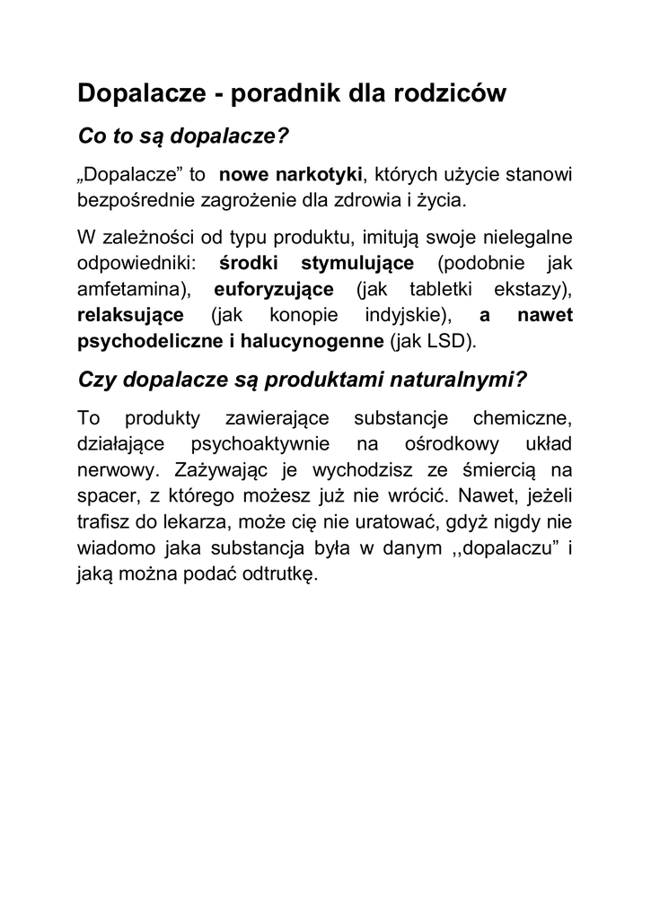 Dopalacze - poradnik dla rodziców Co to są dopalacze? „Dopalacze” to nowe narkotyki, których użycie stanowi bezpośrednie zagrożenie dla zdrowia i życia. W zależności od typu produktu, imitują swoje nielegalne odpowiedniki: środki stymulujące (podobnie jak amfetamina), euforyzujące (jak tabletki ekstazy), relaksujące (jak konopie indyjskie), a nawet psychodeliczne i halucynogenne (jak LSD). Czy dopalacze są produktami naturalnymi? To produkty zawierające substancje chemiczne, działające psychoaktywnie na ośrodkowy układ nerwowy. Zażywając je wychodzisz ze śmiercią na spacer, z którego możesz już nie wrócić. Nawet, jeżeli trafisz do lekarza, może cię nie uratować, gdyż nigdy nie wiadomo jaka substancja była w danym ,,dopalaczu” i jaką można podać odtrutkę. Pod jaką postacią występują? SUSZ ROŚLINNY PROSZEK TABLETKA KAPSUŁKA Jak działają? podwyższenie ciśnienia tętniczego krwi zaburzenia psychotyczne, halucynacje i pobudzenie którym towarzyszą zaburzenia pracy serca udar mózgu zawał serca trudności w oddychaniu, sztywność mięśni uszkodzenie nerek silne pobudzenie psychoruchowe, bezsenność, wahania nastroju przenikliwy lęk, panikę próby samobójcze „gonitwę” myśli, nerwowość, stany lękowe niepokój, zaburzenia psychiczne wymioty bóle w klatce piersiowej drgawki Dlaczego dopalacze są niebezpieczne? Dopalacze są szczególnie groźne, bo nigdy nie wiadomo, jaki dokładnie posiadają skład. Są produkowane po to, aby ominąć obowiązujące zakazy antynarkotykowe. Nikt do końca nie wie, jak naprawdę działają dopalacze i do jakich skutków może doprowadzić ich zażywanie. Co powinno zaniepokoić rodziców? potrzeba posiadania większej ilości pieniędzy kradzieże, znikanie z domu różnych przedmiotów porzucenie uczestnictwa rówieśniczym niepokojące zachowania rówieśniczych, imprezach w życiu po rodzinnym, spotkaniach Dlaczego młodzież sięga po narkotyki? ciekawość presja kolegów i koleżanek aspirowanie do dorosłości niezadowolenie z siebie i swojego życia konflikty i napięcia wewnętrzne problemy w szkole lub w domu robienie na przekór dorosłym brak atrakcyjnych wolnego czasu sposobów spędzania Dopalacze a prawo. Na mocy ustawy o przeciwdziałaniu narkomanii na terenie Polski obowiązuje zakaz wytwarzania, przywozu i wprowadzania do obrotu środków zastępczych oraz nowych substancji psychoaktywnych. Ustawa o przeciwdziałaniu narkomanii ogranicza również sprzedaż leków bez recepty, które w dużych ilościach mogą działać podobnie jak dopalacze. Chodzi o popularne syropy na kaszel, leki na katar czy przeziębienie - produkty lecznicze zawierające pseudoefedrynę, dekstrometorfan lub kodeinę. Gdzie szukać pomocy? Ważne telefony i strony internetowe: 116 111 Telefon Zaufania dla Dzieci i Młodzieży 800 12 12 12 Dziecięcy Telefon Zaufania Rzecznika Praw Dziecka 800 100 100 Telefon dla rodziców i nauczycieli w sprawach bezpieczeństwa dzieci 800 060 800 infolinia Głównego Inspektora Sanitarnego 112 Numer alarmowy obowiązujący na terenie całej Unii Europejskiej dopalaczeinfo.pl www.narkomania.gov.pl Do opracowania poradnika wykorzystano materiały otrzymane z Wojewódzkiej Stacji Sanitarno-Epidemiologicznej w Katowicach