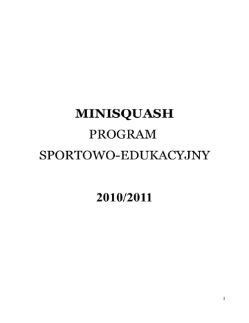 MINISQUASH PROGRAM SPORTOWO-EDUKACYJNY 2010/2011 1 Minisquash jest programem sportowo-edukacyjnym dla dzieci pomiędzy 5 a 11 rokiem życia zatwierdzonym przez brytyjskie Ministerstwo Edukacji i Związek Squasha. Projekt minisquash jest znakomitym wstępem do gry w squasha. Ta ekscytująca gra odpowiada potrzebom najmłodszych dzieci, jest realizowana przy pomocy wyspecjalizowanych akcesoriów, przeznaczonych specjalnie dla nich, pozwalających odnieść sukces sportowy. Badania wskazują, że przed 10 rokiem życia dzieci są najbardziej podatne na rozwój a także predysponowane do nauki sprawności, takich jak: bieganie, skakanie, utrzymywanie równowagi w ruchu, koordynacji ruchowej, rzucania i łapania. Wszystkie z tych umiejętności są fundamentalne dla harmonijnego rozwoju dzieci, dlatego też znalazły swoje miejsce w programie Minisquash. Minisquash w pełni korzysta z wpisanych w jego długoterminowy schemat ćwiczeń, który obejmuje 3 poziomy. Program jest pomyślany tak, by każde dziecko mogło w pełni wykorzystać drzemiący w nim potencjał sportowy. Minisquash zapewnia trenerom i nauczycielom odpowiadający wiekowi podopiecznych zestaw ćwiczeń do squasha, łatwych do opanowania i dających dużo radości. Ten poprzedzony badaniami brytyjski program, umożliwia dzieciom branie udziału w przemyślanym, aktywizującym procesie szkoleniowym i sportowym, zaprojektowanym specjalnie dla ich najlepszego rozwoju oraz popularyzacji squasha. POZIOM WIEK RAKIETY, PIŁKI PODSTAWOWY 5-7 lat, w zależności - rakieta 48-54 cm od umiejętności - piłki dla dzieci ROZWOJOWY Od 7 w górę, w - 54 cm i większe zależności od umiejętności - dziecięce lub szybkie piłki PRO Od 8 w górę w - 64 cm rakiety do squasha lub zależności od pełnowymiarowe poziomu gry - normalne piłki 2 POZIOMY MINISQUASHA Program jest podzielony na trzy poziomy, którym przypisane są określone kolory, stosowne do poziomów rozwoju umiejętności: są to PODSTAWOWY (FUNdation), ROZWOJOWY (IMPROVER) oraz PRO – ten podział jest konieczny do tego, żeby przeprowadzić proces szkoleniowy zgodnie z możliwościami i potrzebami młodych graczy. PODSTAWY (FUNdation) to pierwszy poziom; następny ROZWOJOWY (IMPROVER), dalej PRO – będący ostatnim szczeblem programu Minisquash. Proces szkoleniowy odbywa się według tabeli i kart sprawności (paszportu), zależnych od wieku i umiejętności, tak początkujący gracze od lat 5 do 11 lat mieszczą się w poziomie PODSTAWOWYM. Ci, którzy opanowali elementarne umiejętności z odpowiednim do nich i swojego wieku sprzętem znajdą się na poziomie ROZWOJOWYM. Najwyższe poziomy ROZWOJOWY i PRO są rekomendowane do szkół, klubów i rekreacji. Karty Minisquasha Łącznie jest 19 kart dzienniczka. Po 6 dla PODSTAWOWEGO i ROZWOJOWEGO poziomu oraz 7 dla PRO. Każda z kart składa się z 6 pól: Ruch, Aktywność, Postępy, Swobodna gra, Wiedza i postawa na korcie. Paszport minisquash Gracze mogą kontrolować swoje postępy w minisquashowych paszportach, które zawierają wbijane znaczki. Trenerzy wbijają znaczki zawodnikom, którzy osiągnęli odpowiedni poziom gry. Pomyślnie zaliczony test aktywności jest warunkiem wbicia znaczka do paszportu. Gracz może uzyskać maksymalnie 6 znaczków na karcie, jeśli wszystkie znaczki zostaną zebrane, to wówczas zawodnik przeskakuje na wyższy poziom. Jak trenerzy oceniają postępy dzieci? Można to robić przy użyciu Dziennika Postępów Graczy, wchodzącego w skład pakietu minisquasha. 3 Jak szybki może być rozwój młodego gracza? Będzie on zależał od indywidualnych zdolności. Pamiętaj, żeby nie poganiać, ani nie robić przeskoków z łatwych do trudnych ćwiczeń. Nauka powinna odbywać się stopniowo. Na odwrocie kart spisane są wskazówki, jak uczynić trudniejsze ćwiczenia łatwiejszymi, ze szczegółowymi opisami ćwiczeń i wymaganych pomocy. Certyfikaty ukończenia programu Przejście wszystkich trzech poziomów powinno zakończyć się wręczeniem certyfikatu ukończenia kursu Minisquash. Opisy pól na kartach graczy: Ruch: zręczność, równowaga, koordynacja i szybkość Aktywność: zaangażowanie Swobodna gra: umiejętności parasquashowe wykorzystane w zabawie ruchowej, umiejętność naśladowania i wykorzystania opanowanych umiejętności Wiedza i postawa na korcie: pytania o zasady, taktykę, właściwe zachowanie w sytuacjach spornych 4 MINISQUASH PODSTAWY PODSTAWOWY to pierwszy poziom programu, jest niezbędny do nauki elementarnych umiejętności. Szczególny nacisk jest kładziony na rozwój kluczowych zagrań i koordynacji ruchów koniecznych do gry w squasha. Gdzie i jak można nauczyć się PODSTAW? Poziom PODSTAWOWY oraz przewidziany dla niego program został stworzony z myślą o szkołach/klubach/, które na swoim wyposażeniu mają ściany do gry w squasha, czy klatek (kortów) do gry. Wymiary kortu Kort do gry na poziomie PODSTAWOWYM powinien zajmować połowę boiska do badmintona, czyli 6,09 m szerokości x 4,72 m długości i znajdować się na wprost od ściany do gry. Wykorzystaj istniejące na boisku linie lub wyklej własne zgodnie z poniższymi wytycznymi. Gramy na połowę kortu piłką na ścianę boczną, serwujemy na całej przestrzeni prawej ściany, aż znajdującej się na niej linii autowej, jak na diagramie. Gra wzdłuż kortu skraca pole gry i umożliwia zawodnikom dobre opanowanie gry piłką na wprost ściany. 5 Serwis Linia zagrywki powinna znajdować się w niedalekiej odległości od połowy minisquashowego kortu. Na diagramie jest to linia przerywana. Serwujący powinien stać za linią przerywaną, piłka po zagrywce może uderzyć w dowolną część ściany i spaść w pomniejszone pole gry. Piłka musi się raz odbić od podłogi, serwis na poziomie PODSTAWOWYM odbywa się z tzw. kozła. Punktowanie Zawodnicy grają do trzech wygranych setów. Gra się do 7 punktów, przy stanie 6-6 wygrywa ten, kto pierwszy zdobędzie 7 punkt. Zawodnicy gr