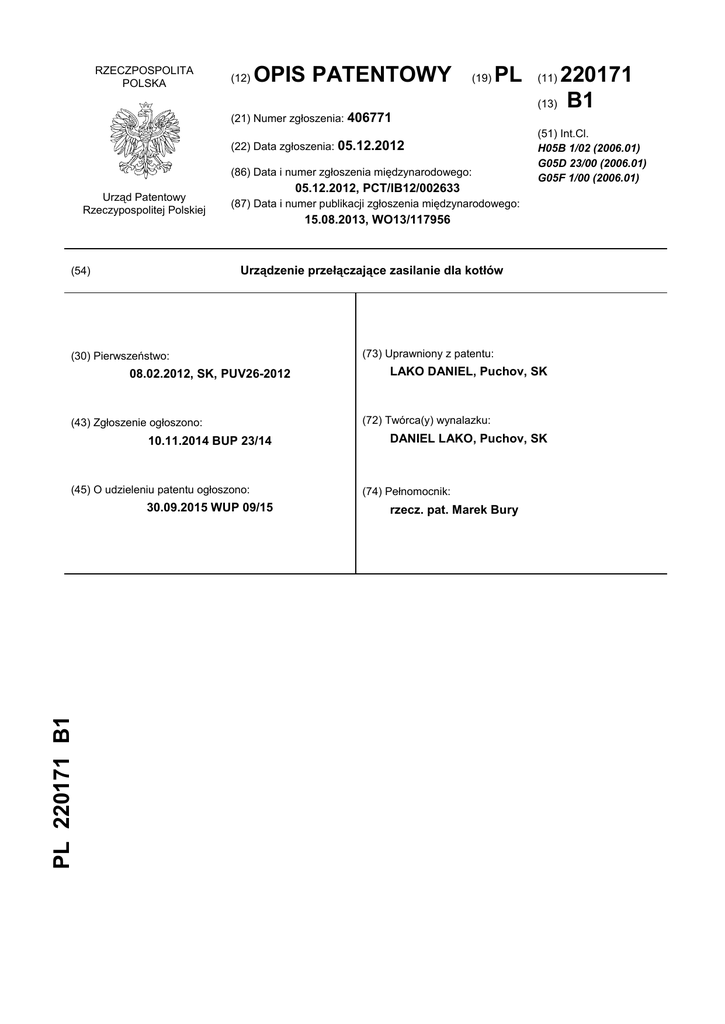 RZECZPOSPOLITA POLSKA (12) OPIS PATENTOWY (19) PL 220171 (13) B1 (11) (21) Numer zgłoszenia: 406771 (22) Data zgłoszenia: 05.12.2012 (86) Data i numer zgłoszenia międzynarodowego: Urząd Patentowy Rzeczypospolitej Polskiej 05.12.2012, PCT/IB12/002633 (87) Data i numer publikacji zgłoszenia międzynarodowego: 15.08.2013, WO13/117956 Urządzenie przełączające zasilanie dla kotłów (54) (30) Pierwszeństwo: 08.02.2012, SK, PUV26-2012 (43) Zgłoszenie ogłoszono: 10.11.2014 BUP 23/14 (45) O udzieleniu patentu ogłoszono: 30.09.2015 WUP 09/15 PL 220171 B1 (51) Int.Cl. H05B 1/02 (2006.01) G05D 23/00 (2006.01) G05F 1/00 (2006.01) (73) Uprawniony z patentu: LAKO DANIEL, Puchov, SK (72) Twórca(y) wynalazku: DANIEL LAKO, Puchov, SK (74) Pełnomocnik: rzecz. pat. Marek Bury 2 PL 220 171 B1 Opis wynalazku Przedmiotowe rozwiązanie techniczne dotyczy regulowanego ogrzewania wody z wykorzystaniem prądu stałego DC z paneli fotowoltaicznych z możliwością wykorzystywania elektryczności generowanej przez te panele fotowoltaiczne po podgrzaniu wody z wykorzystaniem zasilania prądem stałym DC (ang. direct current). Stan techniki Regulacja ogrzewania wody z wykorzystaniem paneli fotowoltaicznych wytwarzających zasilanie prądem stałym z bezpośrednim połączeniem z elementem grzewczym jest rozwiązane przez wzór użytkowy nr 5788, zarejestrowany w Urzędzie Własności Przemysłowej Republiki Słowackiej pod tytułem „Equipment for regulated water heating using photovoltaic panels”, którego właścicielem jest ta sama osoba, tj. Ing. Daniel Lako, Puchov, Republika Słowacka, jako zgłaszający aktualnego wzoru użytkowego. Ten wzór użytkowy szczegółowo wyjaśnia regulację ogrzewania wody z wykorzystaniem zasilania prądem stałym wytwarzanym przez panele fotowoltaiczne. Po ogrzaniu wody w kotle, źródło zasilania zostaje bezpiecznie odłączone, zaś panele fotowoltaiczne przerywają wytwarzanie elektryczności; jednakże to rozwiązanie nie zapewnia maksymalnego wykorzystania możliwości wytwarzania zasilania przez panele fotowoltaiczne. Cechy wynalazku Nowy zakres możliwości wykorzystania zasilania prądem stałym wytwarzanym przez panele fotowoltaiczne po podgrzaniu wody w kotle jest zapewniony przez nowe urządzenie przełączające zasilanie DC. Rozwiązanie to opiera się na zastosowaniu dwóch styczników ST 1 i ST2 oraz ich wzajemnego połączenia. Skrzynka zaciskowa zawiera: a) zacisk dodatni DC, połączony z we jściowymi stykami normalnie otwartymi stycznika ST1, przy stykach wyjściowych połączonych z elementem grzewczym; b) zacisk ujemny DC, który jest także połączony z elementem grzewczym; c) zacisk uziemienia ochronnego, który jest połączony z termostatem; d) zacisk linii prądu przemiennego AC (ang. alternating current), który jest połączony z normalnie zamkniętymi styk ami przełącznika termicznego, a następnie szeregowo z normalnie zamkniętymi stykami termostatu i cewką stycznika ST1; e) zacisk neutralny AC, który łączy styki normalnie zamknięte bezpieczn ika termicznego szeregowo z cewką stycznika ST2; urządzenia sygnałowe są połączone z wyjściem bezpiecznika termicznego i wyjściem termostatu, jak też do elementu grzewczego. Linia dodatnia DC z wejściowych styków normalnie otwartych stycznika ST 1 jest także połączona z wejściowymi stykami normalnie otwartymi stycznika ST2, które prowadzą od styków wyjści owych stycznika ST2 do skrzynki zaciskowej. Linia AC łączy normalnie zamknięte styki stycznika ST1, które są połączone przez wyjściowe styki normalnie zamknięte stycznika ST 1, ze stykami cewki stycznika ST2. Skrzynka zaciskowa zawiera także styk neutralny AC, kt óry jest połączony ze stykami wyjściowymi cewki stycznika ST2. Urządzenie przełączające zasilanie dla kotłów stosowane przy regulowanym ogrzewaniu wody za pomocą prądu stałego z paneli fotowoltaicznych rozwiązuje problem bezpiecznego działania całego systemu i umożliwia bezpośrednie połączenie zasilania DC z paneli fotowoltaicznych do elementów grzewczych, jak również wykorzystanie zasilania DC wytwarzanego przez panele fotowoltaiczne po ogrzaniu i wyłączeniu kotła. Podstawą przedmiotowego rozwiązania technicznego jest połączenie mechaniczne zasilania AC i DC dla ogrzewania wody za pomocą zasilania DC z jednoczesnym zapewnieniem elektrycznej regulacji temperatury i bezpieczeństwa urządzeń ogrzewających wodę. Obwód DC przełącza się, co zapewnia bezpieczeństwo sprzętu, przez przełączenie cewki stycznika ST2 dzięki wykorzystaniu normalnie zamkniętych styków stycznik ST1, co umożliwia odłączenie zasilania DC od kotła. Obwody AC i DC są odseparowane galwanicznie i nie są w żaden sposób połączone elektrycznie. Połączenie tych obwodów jest zapewnione przez dwa styczniki, które są certyfikowane do przełączania zasilania DC. Opis figur rysunku Przedmiotowe rozwiązanie techniczne jest zilustrowane w postaci wizualnej; w tym przypadku Fig. 1 przedstawia schemat elektryczny urządzenia przełączającego zasilanie dla kotłów, stosowanego przy regulowanym ogrzewaniu wody za pomocą prądu stałego z paneli fotowoltaicznych. PL 220 171 B1 3 Korzystne przykłady wykonania wynalazku Panele fotowoltaiczne, na przykład z mocą wyjściową 250W na panel, są połączone szeregowo i tworzą źródło zasilania DC. Jeżeli wykorzystanych jest 8 paneli, moc zainstalowanego źródła zasilania wynosi nominalnie 2kW. Do połączenia paneli fotowoltaicznych z kotłem, poprzez zaciski X4 i X5, może być wykorzystane okablowanie przeznaczone dla prądu stałego DC. Dodatni zacisk DC L+ jest połączony z elementem grzewczym R poprzez styki 1 i 6 stycznika ST1. Ujemny styk DC L- jest połączony z zacisku X5 do elementu grzewczego R. Parametry elementu grzewczego R muszą być dopasowane do maksymalnej zainstalowanej mocy wyjściowej paneli fotowoltaicznych. Zasilanie AC jest łączone z kotłem poprzez