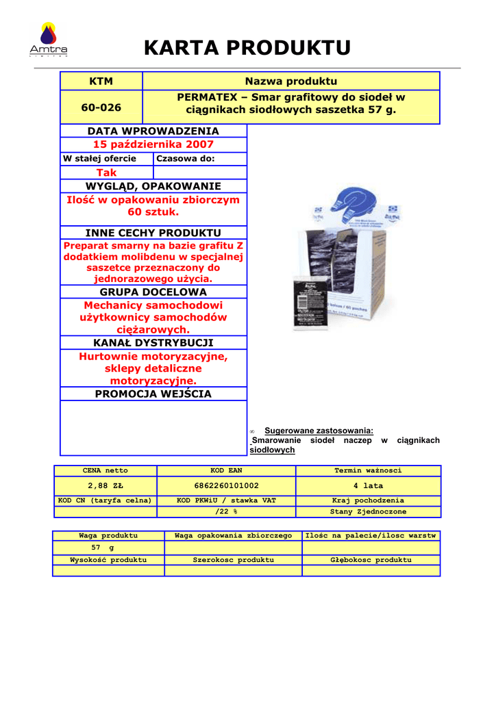 KARTA PRODUKTU KTM Nazwa produktu 60-026 PERMATEX – Smar grafitowy do siodeł w ciągnikach siodłowych saszetka 57 g. DATA WPROWADZENIA 15 października 2007 W stałej ofercie Czasowa do: Tak WYGLĄD, OPAKOWANIE Ilość w opakowaniu zbiorczym 60 sztuk. INNE CECHY PRODUKTU Preparat smarny na bazie grafitu Z dodatkiem molibdenu w specjalnej saszetce przeznaczony do jednorazowego uŜycia. GRUPA DOCELOWA Mechanicy samochodowi uŜytkownicy samochodów cięŜarowych. KANAŁ DYSTRYBUCJI Hurtownie motoryzacyjne, sklepy detaliczne motoryzacyjne. PROMOCJA WEJŚCIA • Sugerowane zastosowania: Smarowanie siodeł naczep w siodłowych ciągnikach CENA netto KOD EAN Termin waŜnosci 2,88 ZŁ 6862260101002 4 lata KOD CN (taryfa celna) KOD PKWiU / stawka VAT /22 % Kraj pochodzenia Stany Zjednoczone Waga produktu 57 Waga opakowania zbiorczego Ilośc na palecie/ilosc warstw Szerokosc produktu Głębokosc produktu g Wysokość produktu
