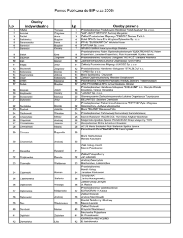 Pomoc Publiczna do BIP-u za 2006r Osoby indywidualne Lp Aftyka Lp Osoby prawne Tomasz Zbigniew Anna Bogdan Irena Bogdan Cezary 1 2 3 4 5 6 7 Batyk Bauman Bąk Ewa Zbigniew Daniel 8 9 10 Przedsiębiorstwo Produkcyjno-Handlowe "Indyk-Mazury" Sp. z o.o. "AM" JACHT SERVICE Andrzej Margalski Zaklad Przetwórstwa Mięsnego "PABICH" Dariusz Pabich Hotel SPA Dr Irena Eris Wzgórza Dylewskie Sp. zo.o. PPHU "EUROKARTON" Wioletta Husar FORTUNA Sp. z o.o. STUDIO SHINA Katarzyna Alicja Skalska Przedsiębiorstwo Robót Ogólonobudowlanych "ELEKTROINSTAL"Adam Krzemiński ,Jarosław Krzemiński, Piotr Krzemiński, Spólka Jawna Przedsiebiorstwo handlowo Usługowe "RO-POś" Marzena Rosińska Zachodniomazurska Lokalna Organizacja Turystyczna 11 Begej Artur 11 Zakłady Przetwórstwa Mięsngo ŁUKOSZ Sp. z o.o. 12 13 14 15 16 17 BłaŜewski Bobowska Bojanowska Bojar Brdak Brdak Zbigniew Dorota Aldona Katarzyna Marzena Bogdan 12 13 14 15 16 17 18 19 Brejnak Brędowski Adam Cezary 18 19 Przedsiebiorstwo Handlowo -Usługowe "STALZŁOM" s.c. TOREX Sp. z o.o. Bank Spółdzielcy Olsztynek Zakład Ogólnobudowlany Mirosław Świątkowski Posrednictwo Finansowe PoŜyczki; Kredyty Zdzisław Pozarowszczyk ANS PR CONSULTING Anna Niedziela -Strobel Przedsiębiorstwo Handlowo-Usługowe "EXELLENT" s.c. Cecylia Wanda Kowalska, Teresa Kowalska "JASAM" Sp. z o.o. 20 21 Brzozowski Bukowski Mariusz Artur 20 21 Stowarzyszenie Zachodniopomorska Lokalna Organizacja Turystyczna DELIAKTES -Zdzisław Dawidziak 22 23 Burdalska Bystrek Dorota Jolanta 22 23 Przedsiębiorstwo Piekarniczo-Cukiernicze "PATRYK" Zyta i Zbigniew Szczepańscy, Justyna Miąskowska Biuro "BILANS" Czesława Felis 24 Cackowski Wiesław 24 Przedsiębiorstwo Państwowej Komunikacji Samochodowej 25 26 27 28 Charzyński Chęciński Chmielińska Chmieliński Miłosz Andrzej Joanna Maciej 25 26 27 28 Marcin Radziwon 'RADZI-GOL' Hurt Detal Artykuły Sportowe Małgorzata Ignatjuk Apteka 'PANACEUM' Sklep Muzyczny 'TON' Gospodarstwo Rolne Arkadiusz Kowalski ACUS Maria Sobiech i Piotr Stefaniuk Spólka Jawna Firma Handl.-Prod."MARKPOL"M. Leszczyński 29 Chmura Bogumiła 29 1 2 3 4 5 6 7 Antolak Babiel Balkiewicz Baranowska Bartnicki Bartnicki 8 9 10 Biuro Rachunkowe Renata Kaszlejew 30 Chomeniuk Andrzej 30 Zakł. Usług.-Handl. Marcin Paszkowski 31 Ciesielka Ryszard 31 32 Czajkowska Danuta 32 33 Czamajło Waldemar 33 34 Czarnecki Roman 34 35 Czechowska Stefania 35 36 Dąbkowski Wiesłąw 36 37 Dąbrowska Małgorzata 37 38 Dąbrowski Andrzej 38 39 Dec Włodzimierz 39 40 Dembski Marian 40 41 Dębiński Zdzisław 41 42 Domańska Lilla 42 Zakład Fotograficzny Jan Liberacki Andrzej Zwierzyński Blacharstwo, Lakiernictwo Przedsiębiorstwo Handl.-Usług Jarosław Piórkowski "SAMSARA" Janina Harasymowicz Zakład Usług Leśnych A. Rędzia Przedsiębiorstwo WielobranŜowe KORMORAN- H.Kalata Zakład Stolarski Andrzej Marchlewski Handel Detaliczny i Hurtowy Marcin Lipnicki Zakład Stolarski Krzysztof Mackiewicz Mechanika Pojazdowa H. Prusakowski OSTRÓDA-RECYCLING E.Jaskółowska 43 Dragun Mirosław 43 Przedsiębiorstwo Robót Ogólnobud. ELEKTROINSTAL 44 Dubaniewicz Grzegorz 44 45 Dudkiewicz BoŜena 45 46 Dyczewski Arkadiusz 46 47 Dygacz Waldemar 47 Transport Usługowy EKO i Usługi Leśne Andrzej Mikołajski Zakład Usług Leśnych Krzysztof Wielgus Apteka SŁONECZNA Małgorzata Lemańska PHU OLIVIA Paulina Górecka 48 49 50 51 52 Sklep SpoŜywczo -Przemysłowy BEATA Beata Nowakowska Salon Fryzjerski"EWA" Teresa Jarosz "JARTEX" "Wood-System" Spółka Jawna Iwona i Tomasz Zyśk 53 54 Niepubliczny Specjalistyczny ZOZ G i J Kwiasowscy "KACZKAN" Zakład Produkcji Drzewnej 48 49 50 51 52 Dziewulski Dziubiński Dziurzyński Fidura Fiedorowicz 53 54 Figlant Gajcy Sebastian Leszek Łukasz Krzysztof Barbara Eugeniusz Mirosław 55 56 Gauden Get Zbigniew ElŜbieta 55 56 Przedsiębiorstwo Budownictwa Drogowego Sp. z o.o. TECH-BET Sp. z o.o. 57 58 59 60 61 62 63 64 Girczyc Giza Głowacz Gołębiewska Gołowicz Goniszewski Goszczyńska Gromelski Kazimierz Łukasz Wojciech 57 58 59 60 61 62 63 64 Przedsiębiorstwo Handlowo-Produkcyjno-Usługowe RASKO Sp. z o.o. Zakład Masarski Józef Kołtek Fabryka Mebli Taranko Aleksander Tranko Przedsiębiorstwo Wodociągów i Kanalizacji Sp.z.o.o Zakład Produkcyjny "Kaczkan" Biuro Usług Geodezyjnych "Geo-Kart" Apteka "Salus" spólka cywilna Przedsiębiorstwo Oczyszczania Sp.zo.o 65 66 67 68 69 70 71 72 73 74 75 76 77 Grusanc Hołubiec Hrebelski Jabłoński Jakubiak Jamróz Janicka Janicki Jaros Jarząbek Jarzynka Jaskulska Jaworski Mariusz Małgorzata Janusz Urszula Wojciech Ewa Wojciech Bartłomiej Beata Marcin 65 66 67 68 69 70 71 72 73 74 75 76 77 Przedsiębiorstwo Państwowej Komunikacji Samochodowej Firma Handlowa Anna Cołoś Przewozy Osobowe "Miras" Przedsiębiorstwo Handlowo-Usługowe Jan Kościanek Urszula Koźlakiewicz Fabryka Mebli Taranko Przedsiębiorstwo "Dłajd" Jerzy Porowski Przedsiębiorstwo Handlowo-Usługowe "NOMEX" Usługi Geodezyjne i Inwestycyjne "ALFA" Firma "Piotr Joniec Rekreacjia i Sport" Przedsiębiorstwo Oczyszczania Sp. z o.o. Firma "Lux Mebel" Marcin Śladewski Przedszkole Niepubliczne "Radość" 78 Jednorowska Martyna 78 Przedsiębiorstwo WielobranŜowe "Drew Jany" Jan Dunaj, Jan Baniuszewicz, 79 80 81 82 83 84 85 86 87 88 89 90 91 92 93 94 95 96 97 98 99 100 101 Jeleniewicz Jędrzejczyk Józefowicz Jurałowicz Jurałowicz Kachnowicz Kaczyńska Kaczyńska Kalinowska Kamiński Kamiński Karewicz Karolewska Kasyna-Rozbicka Katarzyna Katewicz Kiełbasa Kiersnowski Kierzkowski Kilman Klabuhn Klepadło Kleszcz Jerzy Tadeusz Wiesław Zdzisław Zdzisław Oktawiusz Ewa GraŜyna Joanna Marcin Mirosław Urszula Małgorzata Wioletta Miszczuk Zenon Krzysztof Mariusz Bodan Agnieszka Marcin Krzysztof Cezary 79 80 81 82 P.P.H.U "DAX" ZPCh Łucja i Czesław Strugalscy S.C., Agencja Ochrony "Skorpion" Sebastian Tuszyński ZPCh, Agencja Ochrony Mienia "Feniks" Irena Przyborowska ZPCh, Telewizja Ostróda Piotr Wasześcik, Dorota Paweł Tomas