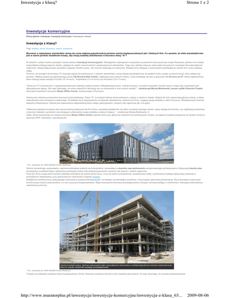 Inwestycja z klasą? Strona 1 z 2 Inwestycje komercyjne Strona główna› Inwestycje› Inwestycje komercyjne› Inwestycja z klasą? Inwestycja z klasą? Tagi: analizy, biura, biurowce, raport, wieŜowce Biurowce o najwyŜszym standardzie cieszą się coraz większą popularnością zarówno wśród międzynarodowych jak i lokalnych firm. Co sprawia, Ŝe wiele przedsiębiorstw jest w stanie ponieść dodatkowe koszty, aby swoją siedzibę zlokalizować w biurowcu klasy "A"? W ostatnim czasie moŜna zauwaŜyć rozwój sektora inwestycji komercyjnych. Niewątpliwie największym skupiskiem powierzchni biurowych jest wciąŜ Warszawa, jednak inne miasta wojewódzkie próbują dogonić stolicę, oddając do uŜytku nowe budynki o podwyŜszonym standardzie. Tego typu obiekty niosą ze sobą wiele korzystnych rozwiązań dla potencjalnych najemców. Zapewniają przede wszystkim wygodę i komfort pracy, ale równieŜ wpływają na wizerunek. Dlatego firmy dbające o swój prestiŜ przykładają do swoich biur coraz większą wagę. Pomimo, Ŝe wynajem biura klasy "A" kosztuje więcej niŜ powierzchni o niŜszym standardzie, coraz więcej przedsiębiorstw na polskim rynku uwaŜa, Ŝe jest to koszt, który opłaca się ponieść. Według raportu przygotowanego przez CB Richard Ellis Polska, najdroŜsze jest centrum stolicy. Cena kształtuje się tam w granicach 21-24 euro za m2. Mniej zapłacą firmy, które ulokują swoje siedziby w Łodzi (12-14 euro), Trójmieście (13-15 euro) czy Poznaniu (15-17 euro). "Cena za m2 w biurowcach o najwyŜszej klasie jest niekiedy wyŜsza nawet o kilkadziesiąt procent. Jednak korzyści, a przede wszystkim komfort pracy w tego typu budynkach jest zdecydowanie lepszy. Nic więc dziwnego, Ŝe coraz więcej firm decyduje się na ulokowanie w nich swoich siedzib." - przekonuje Maciej Modrowski, prezes spółki Górecka Projekt, która jest inwestorem biurowca Skalar Office Center, budowanego w Poznaniu. Istotna przy doborze powierzchni biurowych jest lokalizacja. Klasa "A", to budynki dobrze skomunikowane, leŜące w centrum miasta. Dojazd do nich zapewniają główne arterie, a takŜe rozbudowana sieć transportu publicznego. Przekłada się to bezpośrednio na łatwość odnalezienia i dotarcia do firmy, mającej swoją siedzibę w takim biurowcu. Niezbędna jest równieŜ dogodna infrastruktura. WaŜne jest zapewnienie odpowiedniej ilości miejsc parkingowych, zarówno dla najemców jak i ich gości. "Właściwe połoŜenie budynku jest rzeczą istotną zwłaszcza dla firm które, prowadzą działalność nie tylko na terenie danego miasta. Łatwy dostęp do lotniska, czy najbliŜszej autostrady moŜe być niekiedy czynnikiem warunkującym ulokowanie swojej siedziby w danym miejscu." - przekonuje Maciej Modrowski. S półka, którą reprezentuje na miejsce biurowca Skalar Office Center wybrała teren przy głównych arteriach komunikacyjnych miasta, co zapewni szybkie połączenie ze ścisłym centrum, dworcem PKP, lotniskiem i autostradą A2. Fot.: materiały od: ARW IMAGE Public Relations Oprócz korzystnego usytuowania, najnowocześniejsze budynki są funkcjonalne i pozwalają na dowolne zaprojektowanie wynajmowanego pomieszczenia. Zazwyczaj otwarty plan kondygnacji umoŜliwia łatwą i elastyczną aranŜację wnętrz oraz podział powierzchni zarówno dla duŜych i małych najemców. Poza tym firmy mogą same wybrać materiały potrzebne do wykończenia biura. Liczy sie takŜe funkcjinalność; podwieszane sufity i podniesione podłogi zapewniają swobodę w prowadzeniu okablowania, przy jednoczesnym zachowaniu estetyki wnętrza. Dodatkowo komfort pracy podwyŜszają nowoczesne systemy klimatyzacyjne, na bieŜąco wymieniające powietrze i utrzymujące optymalną temperaturę. Dla pracodawcy waŜny jest komfort pracy swoich pracowników, a w tym poczucie bezpieczeństwa. Stąd nowoczesne biurowce posiadają oprócz recepcji, kontrolę dostępu z interkomem, telewizję przemysłową i całodobową ochronę. Fot.: materiały od: ARW IMAGE Public Relations "Często na podstawie siedziby klienci budują opinię o firmie. Pierwsze wraŜenie równieŜ w tym aspekcie jest waŜne, nic więc dziwnego, Ŝe wzrasta zainteresowanie http://www.muratorplus.pl/inwestycje/inwestycje-komercyjne/inwestycja-z-klasa_65... 2009-08-06 Inwestycja z klasą? Strona 2 z 2 najnowocześniejszymi i prestiŜowymi projektami." - wyjaśnia Anna Kulik, dbająca na co dzień o wizerunek wielu firm. WaŜny jest zatem przemyślany wybór biurowca, który będzie odpowiadał naszym potrzebom i standardom. Im waŜniejszy jest dla firmy sposób w jaki jest ona postrzegana, tym więcej uwagi powinna poświęcić swojej siedzibie. Źródło: materiały od: ARW IMAGE Public Relations Data publikacji: 06/08/2009 /Aktualizacja http://www.muratorplus.pl/inwestycje/inwestycje-komercyjne/inwestycja-z-klasa_65... 2009-08-06